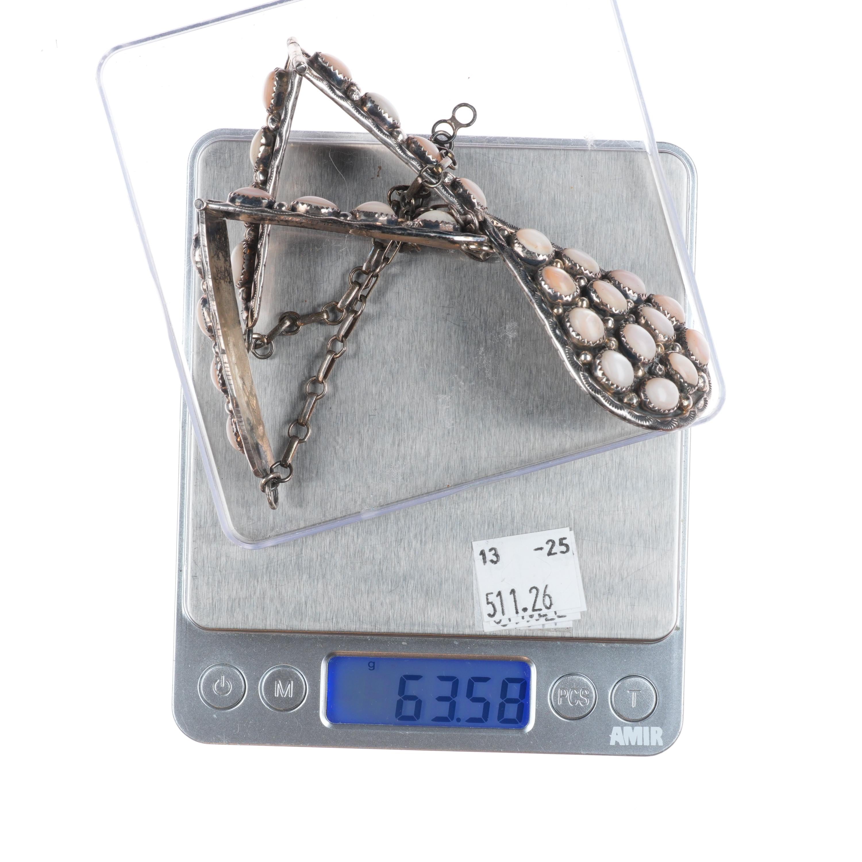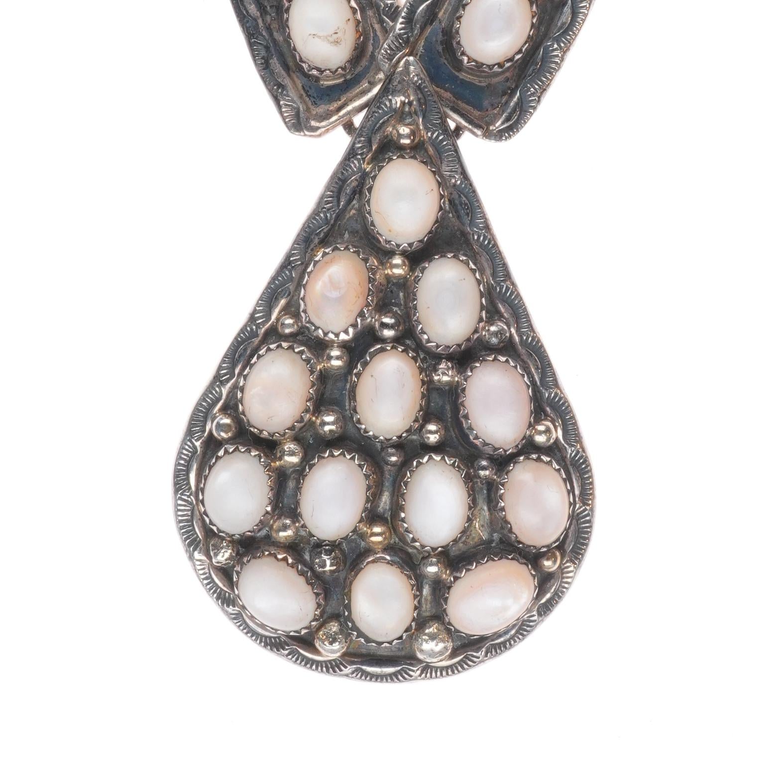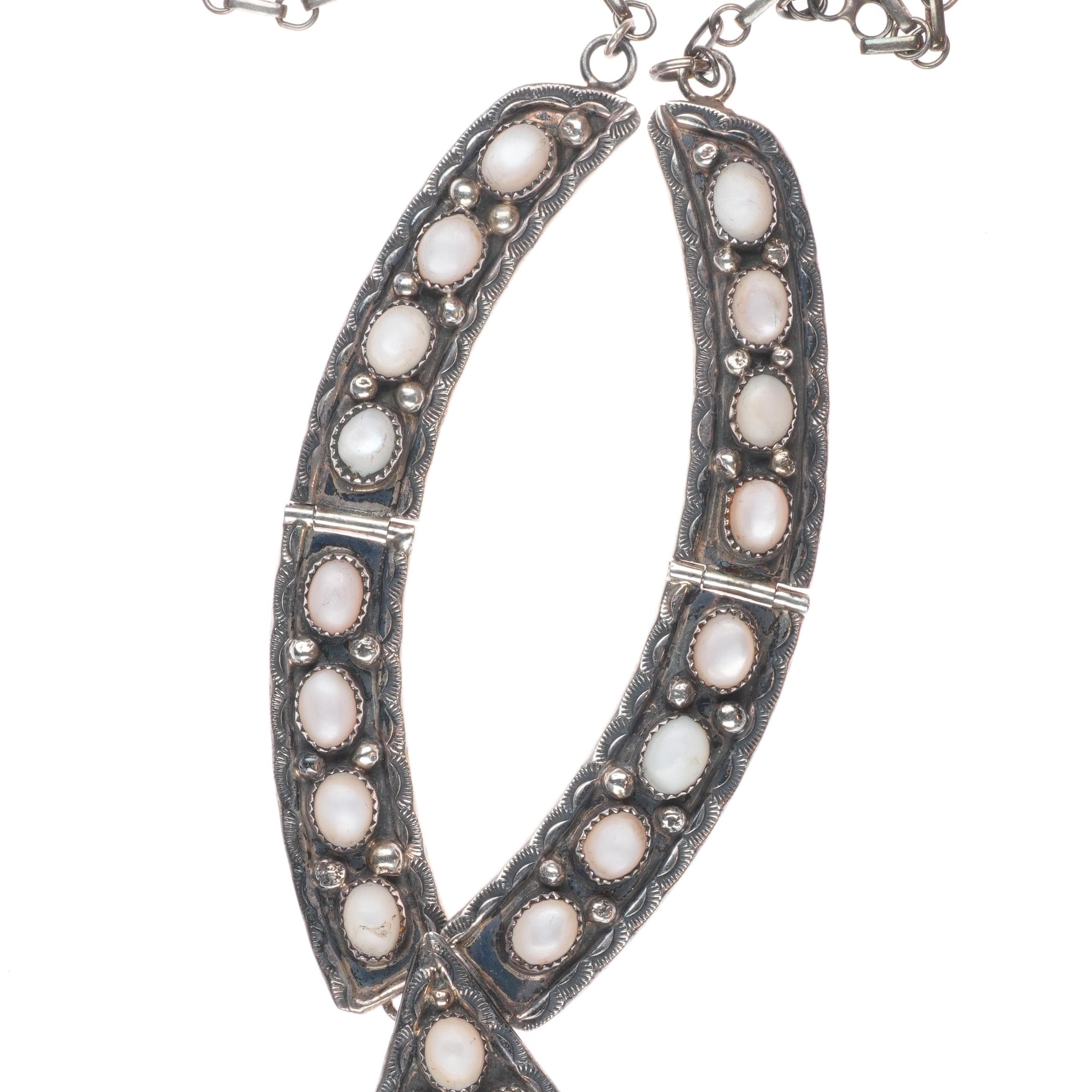 Big Vintage J Navajo sterling silver mother of pearl cluster necklace. Tested and guaranteed solid sterling silver with weight and measurements in pictures. No issues. 19" long, circa fourth quarter of the 20th century with no significant issues. Unknown artist.