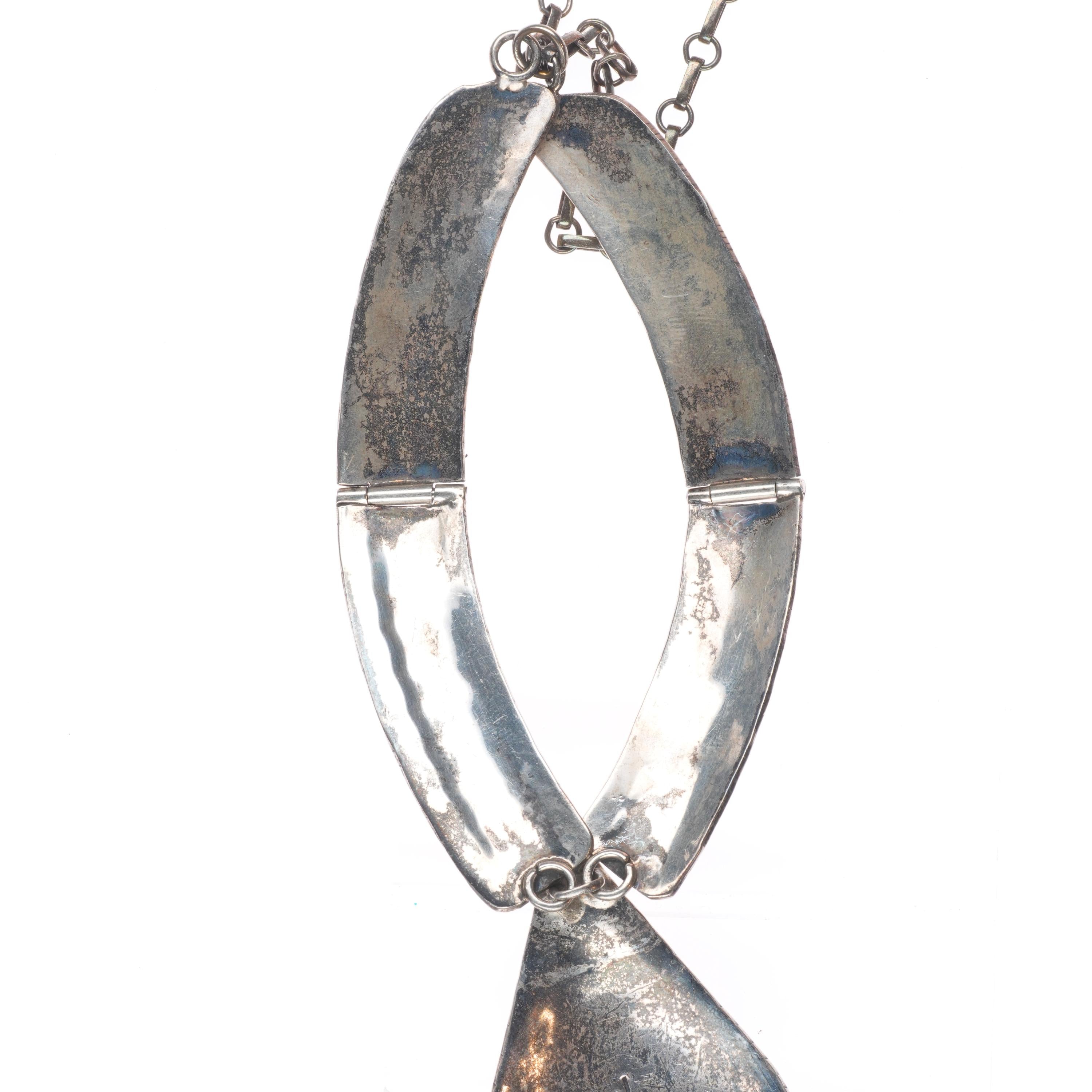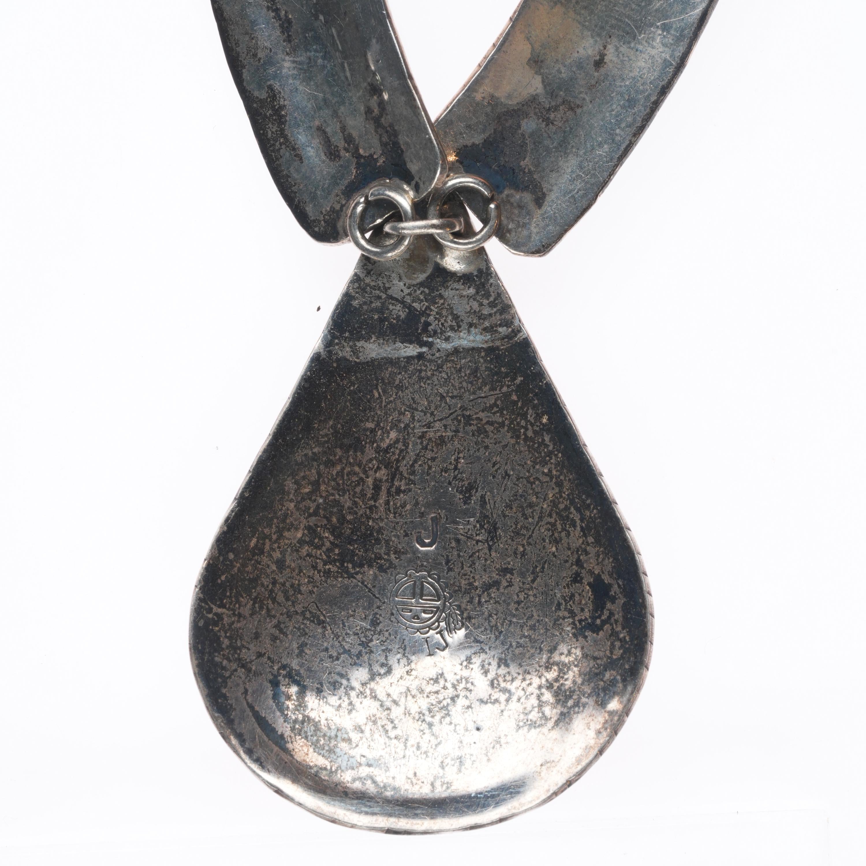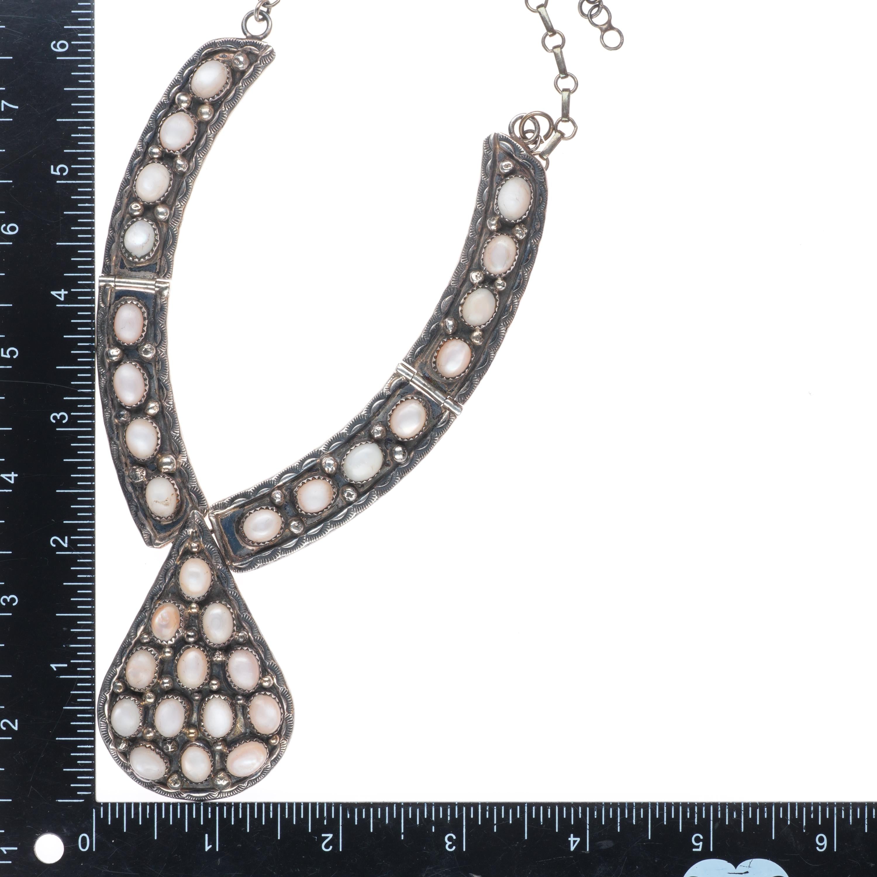 Big Vintage J Navajo sterling silver mother of pearl cluster necklace. Tested and guaranteed solid sterling silver with weight and measurements in pictures. No issues. 19" long, circa fourth quarter of the 20th century with no significant issues. Unknown artist.