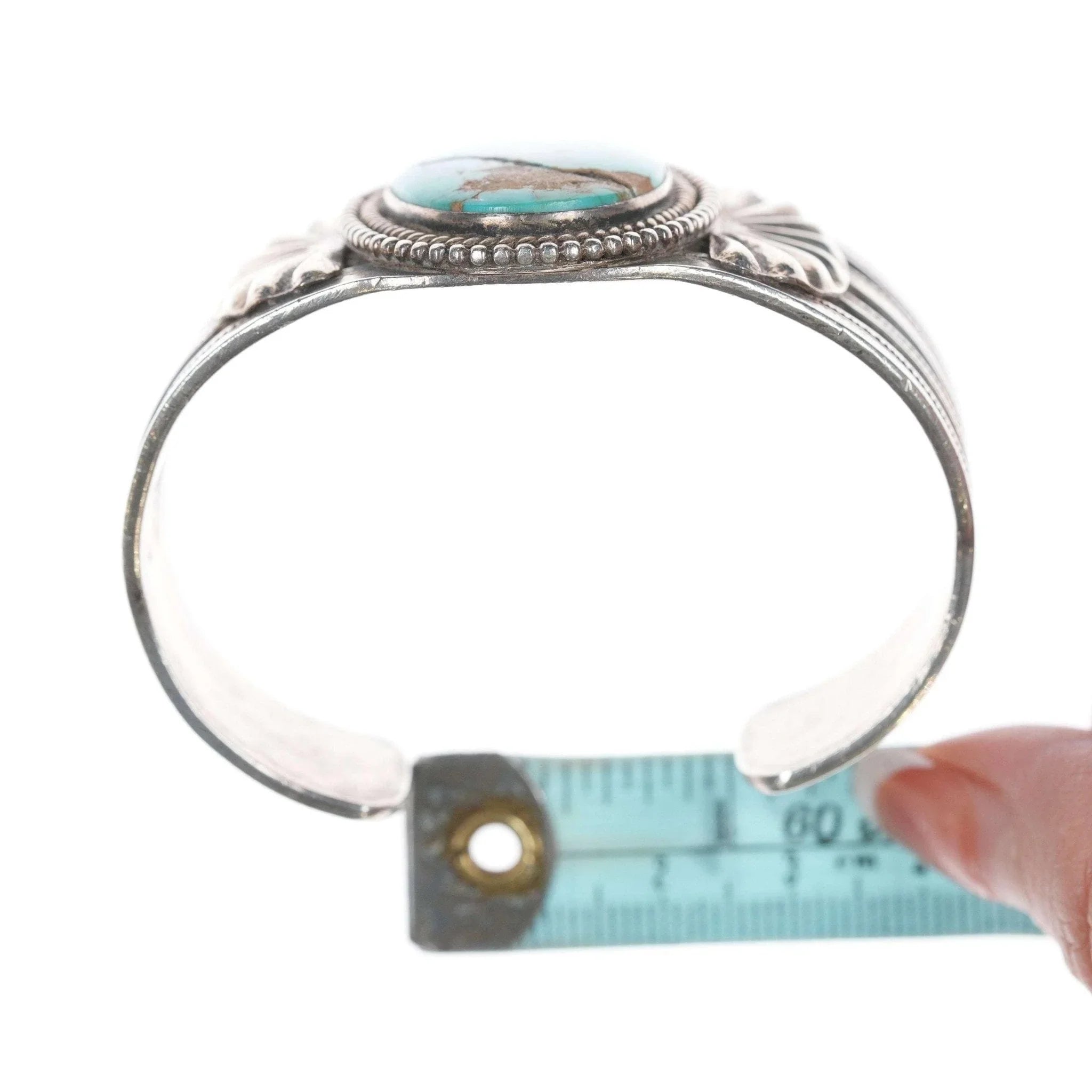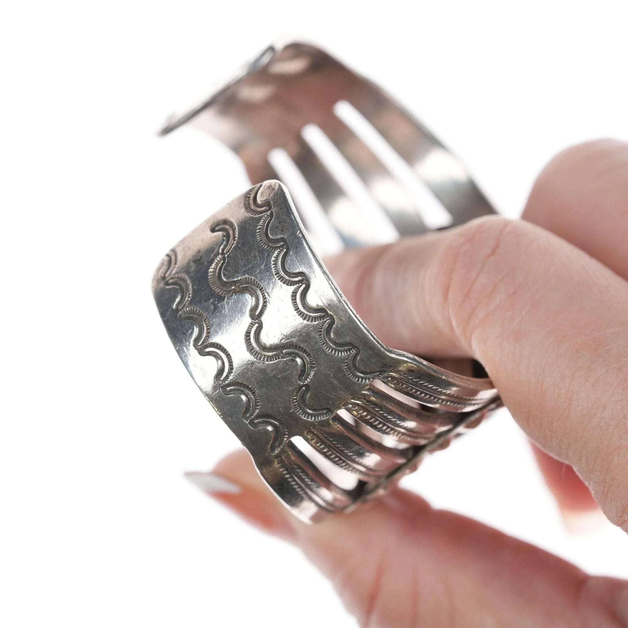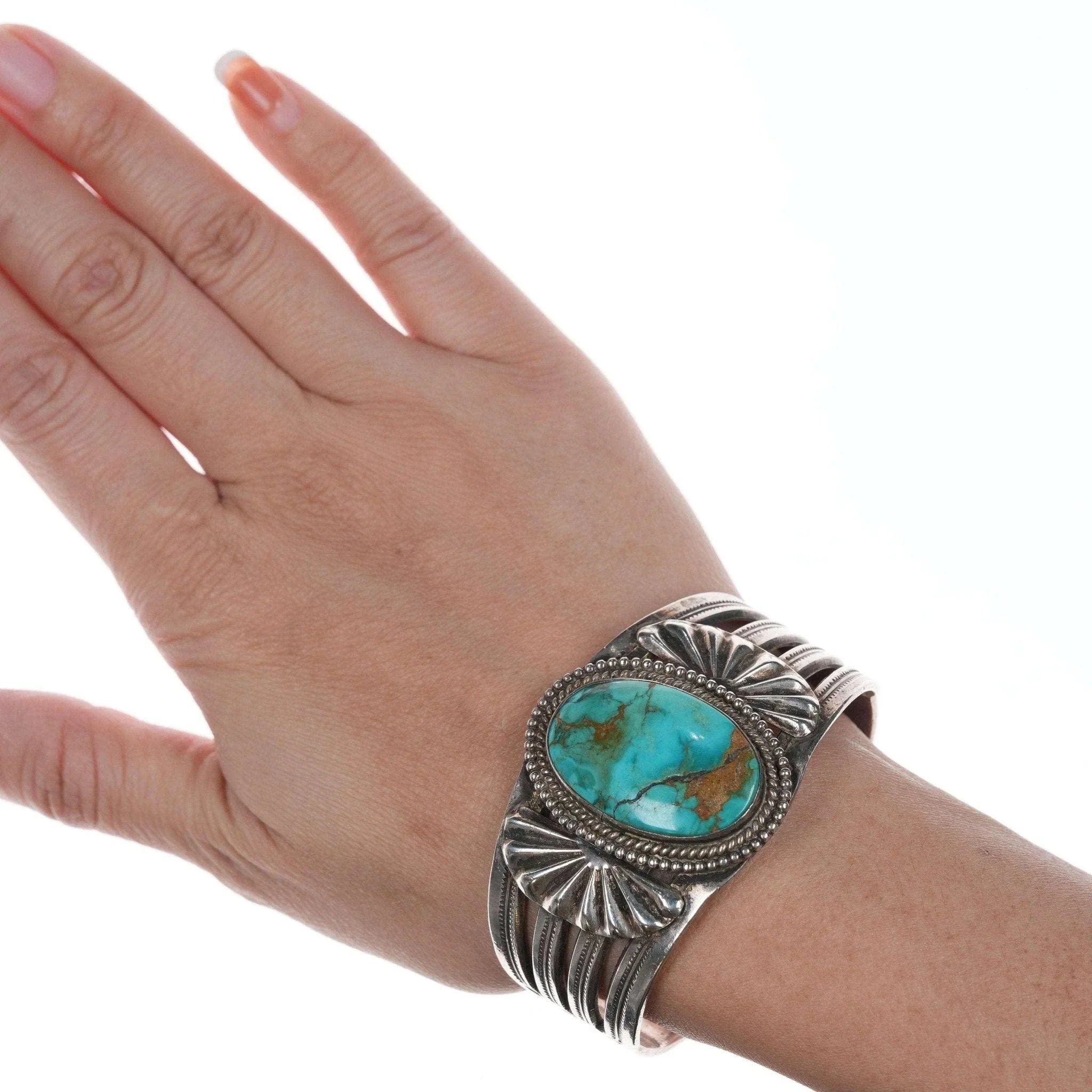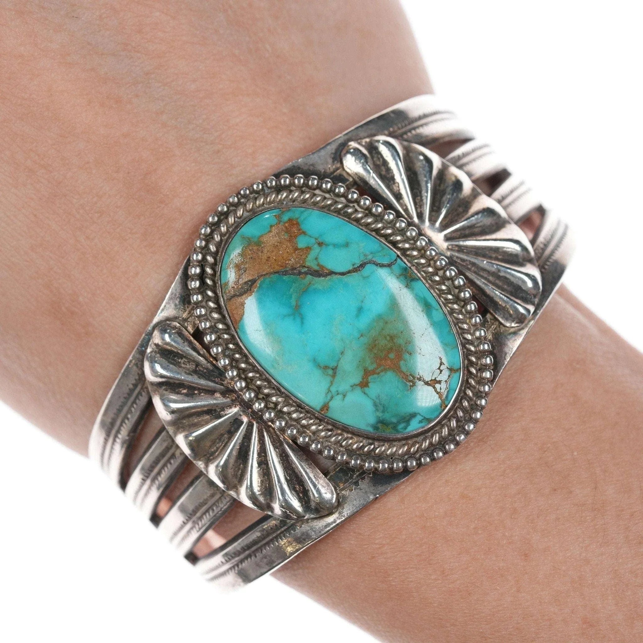 C1940 6 3/8" Navao Bracciale in argento e turchese stampato, largo 40 mm al centro. Bel braccialetto antico del secondo quarto del XX secolo, senza contrassegno. Pietra fissata nella lunetta con frattura stabile.