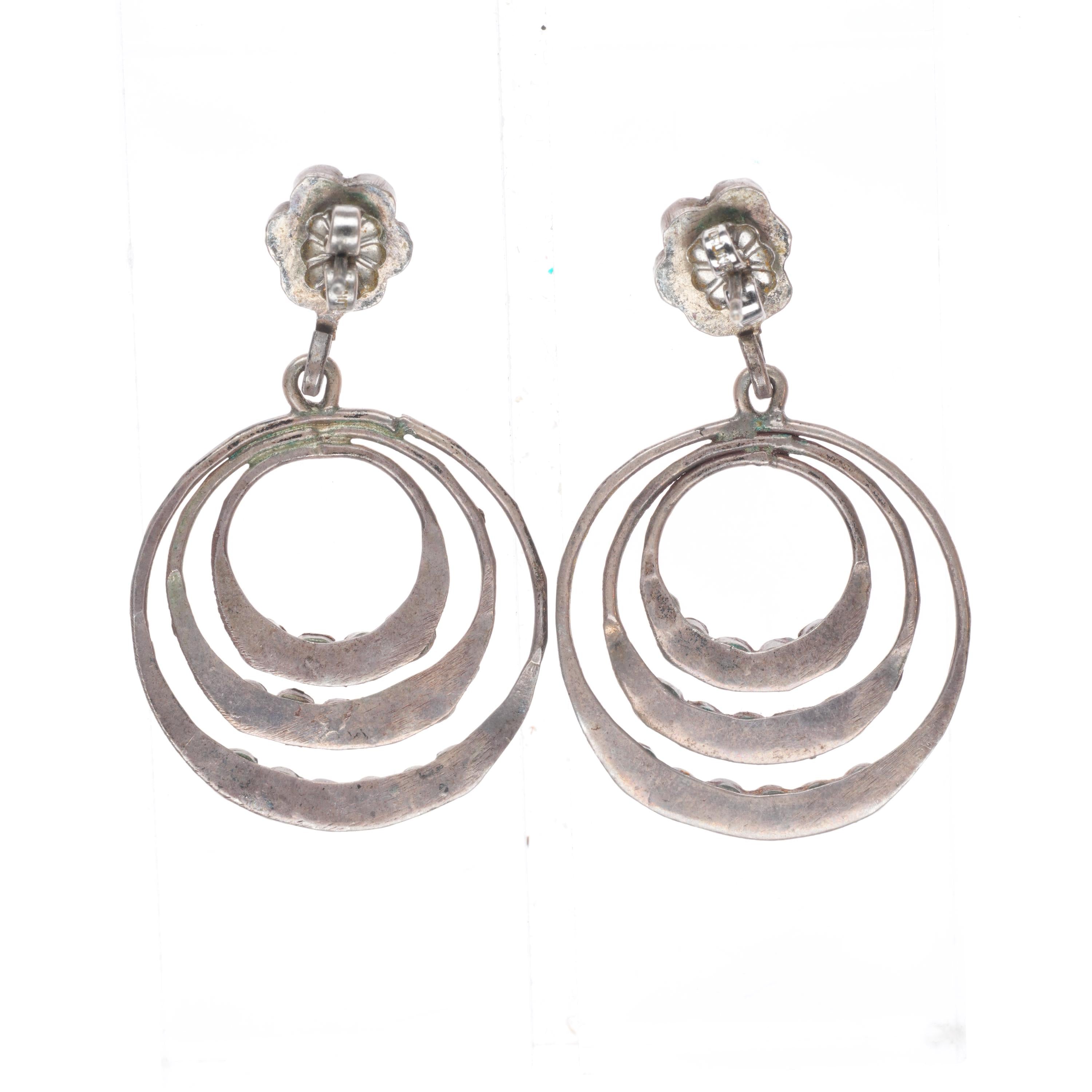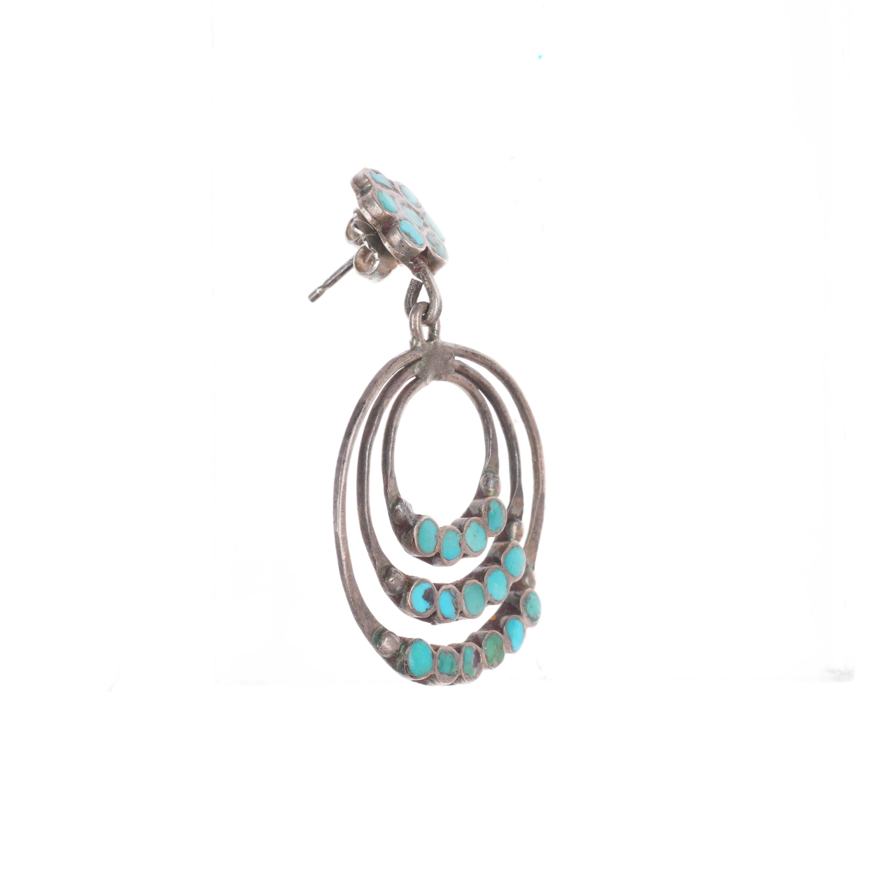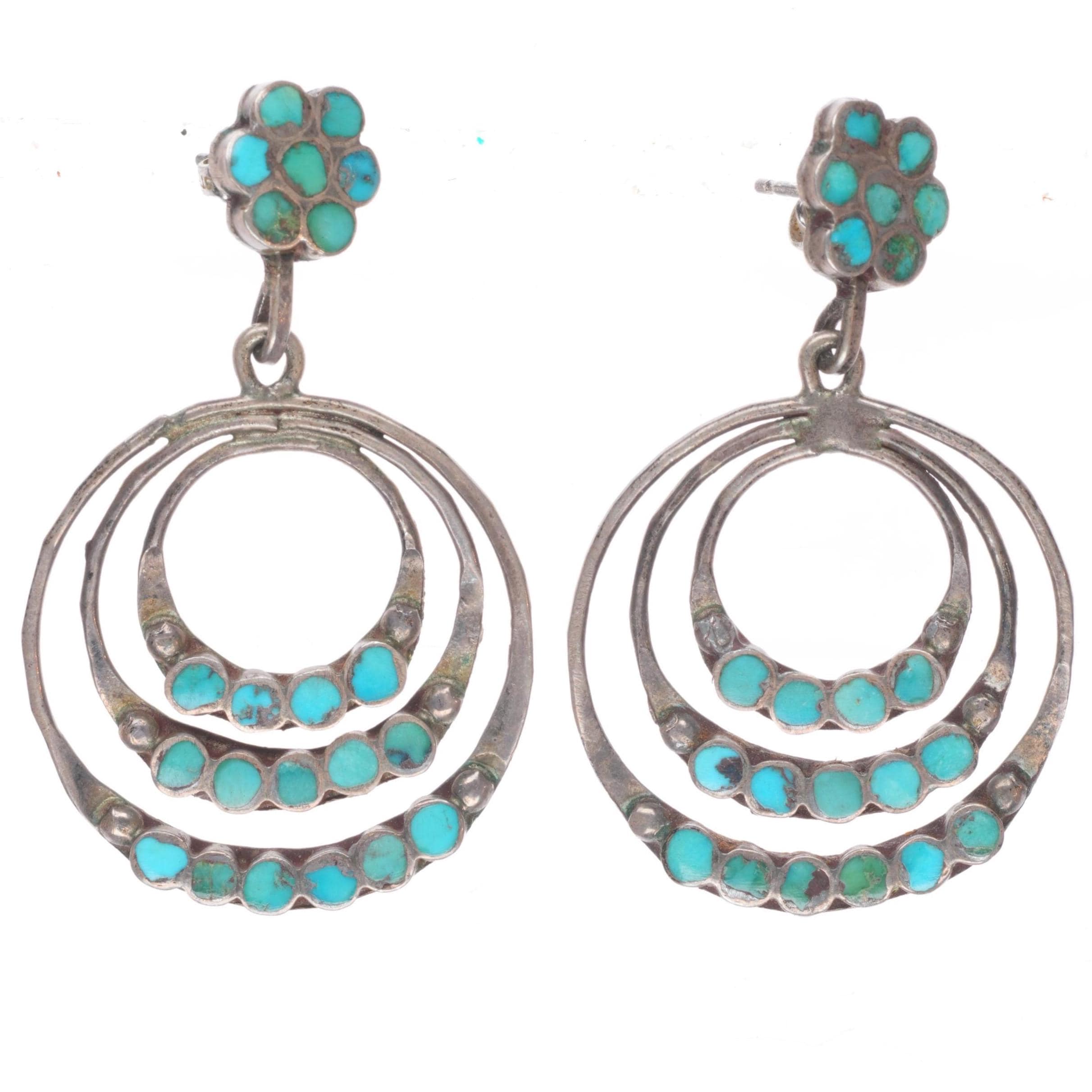 c1940's Vintage Dishta Zuni sterling silver turquoise flush inlay 3 hoop earring