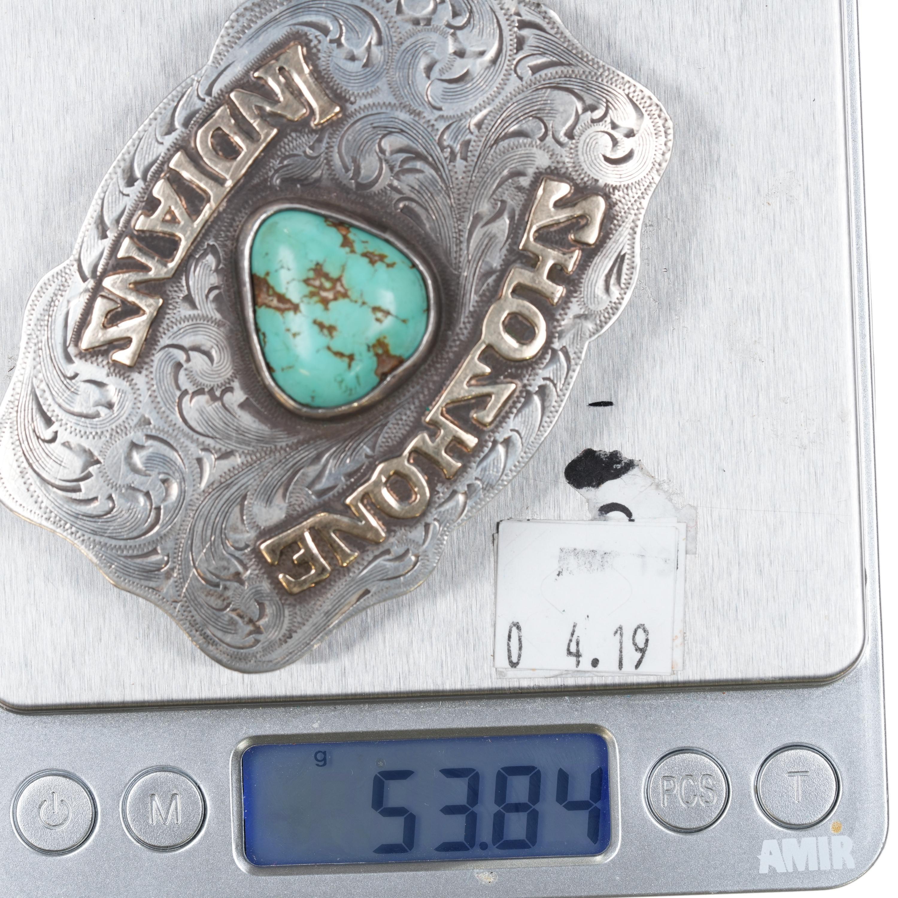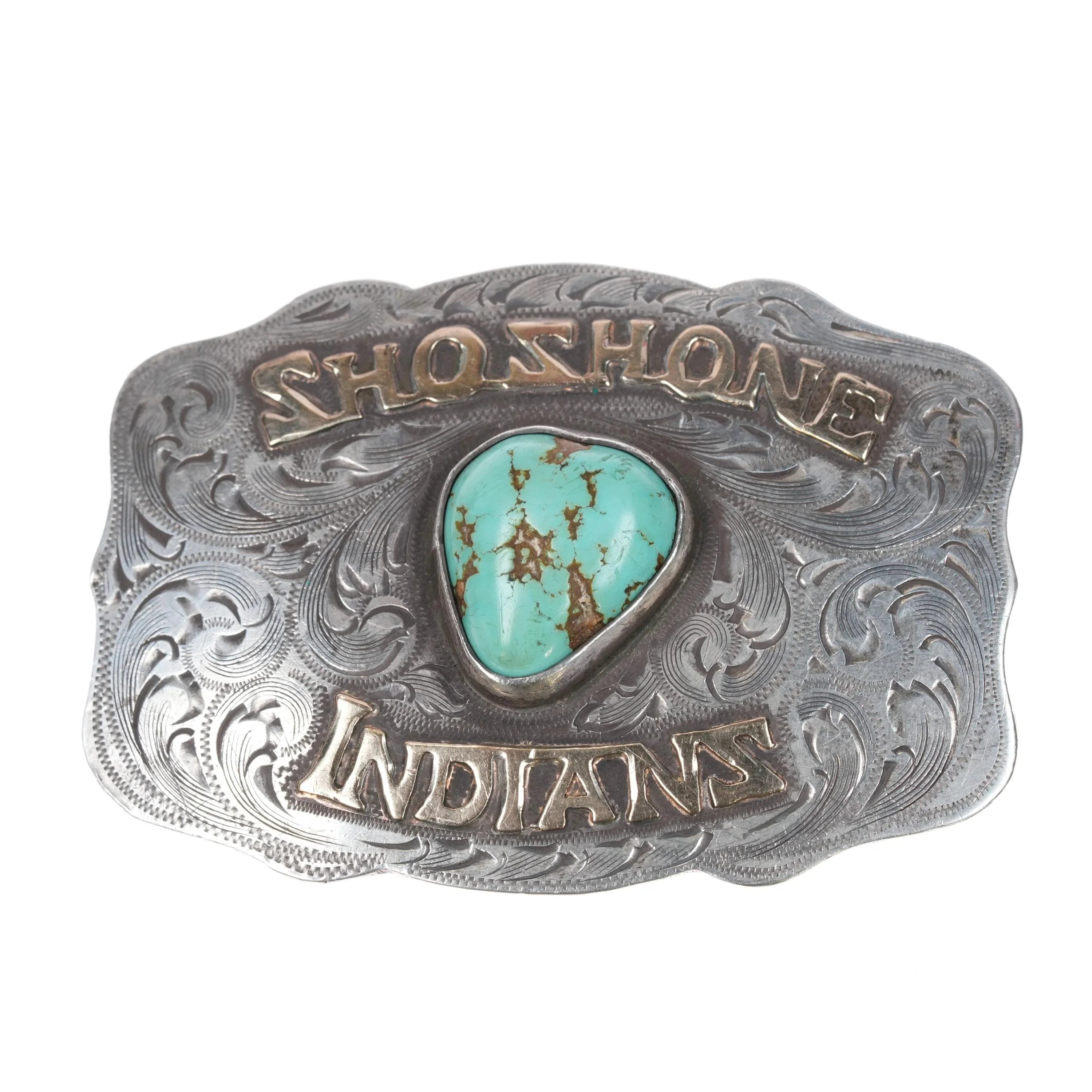 c1950‘s Sterling/14k gold turquoise Shoshone Indians hand engraved belt buckle. Solid sterling silver with weight and other measurements in the pictures. Fits up to a 1.5" belt, no issues. No damage, minimal wear. Not sure if this was a presentation item or what, but it‘s great.
