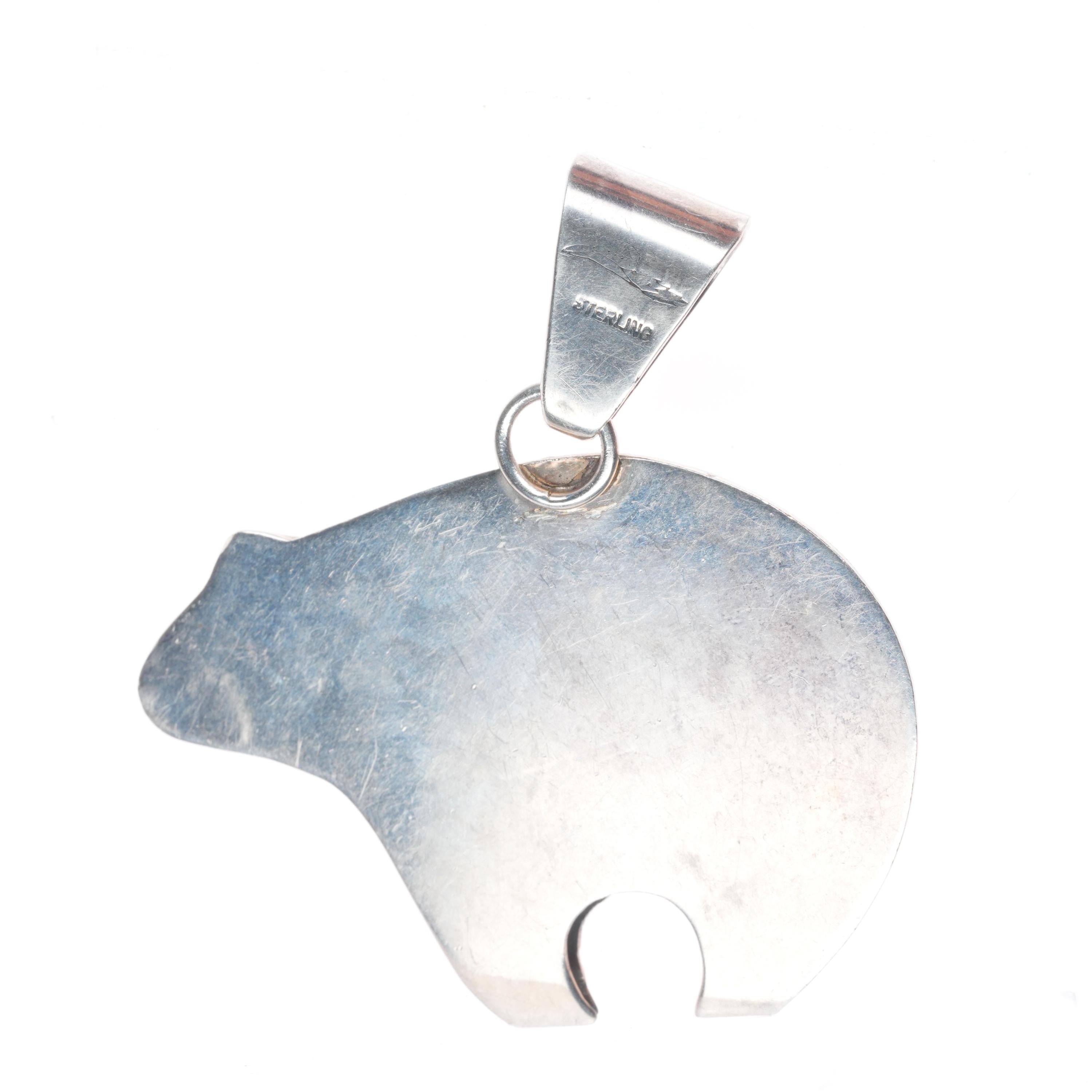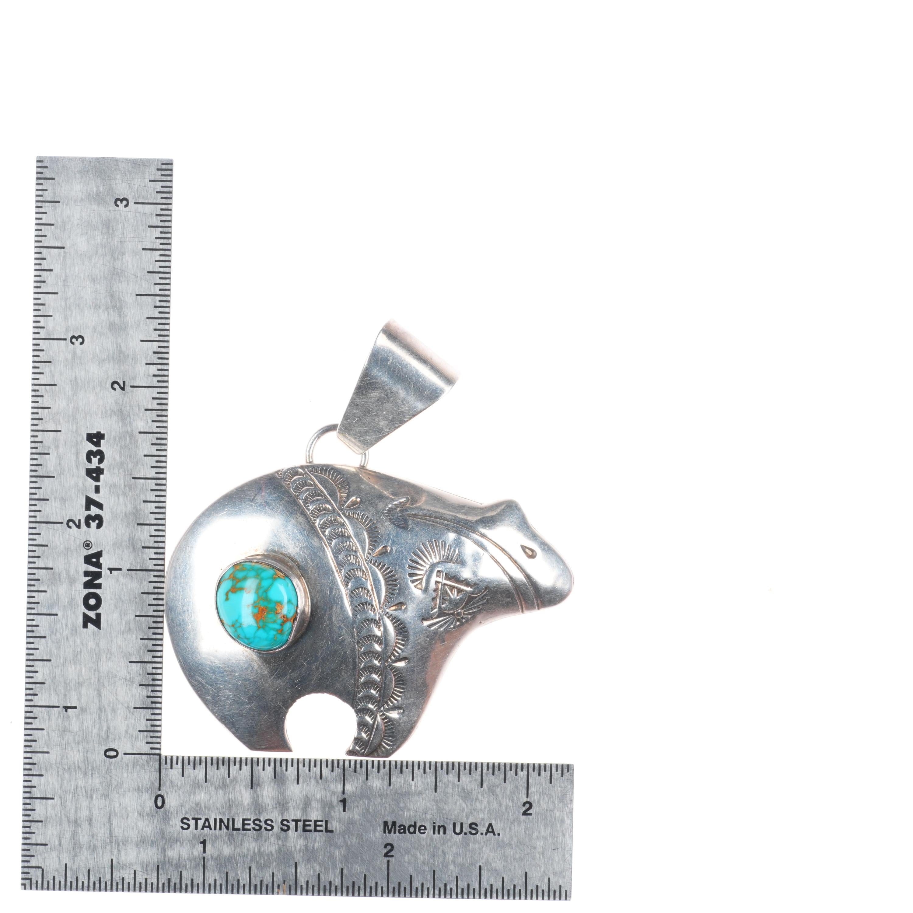 Delbert Vandever Navajo sterling silver bear pendant with nice turquoise, circa last quarter of the 20th century. Selling the pendant shown in good condition with measurements in pictures. Marked on bail as shown, weight and measurements in pictures.