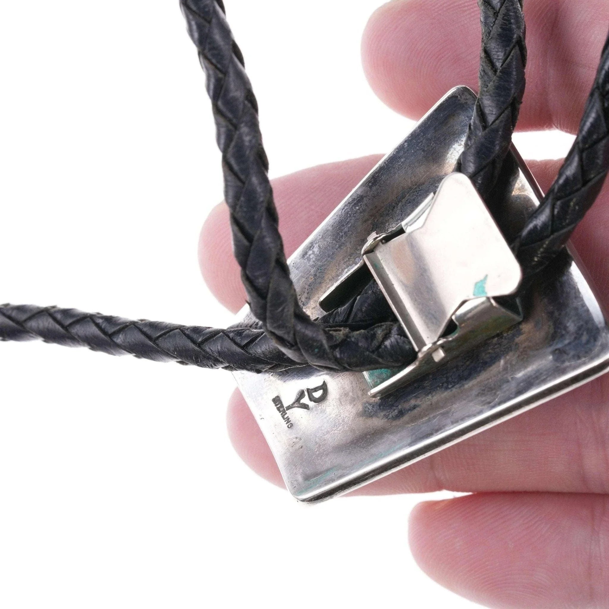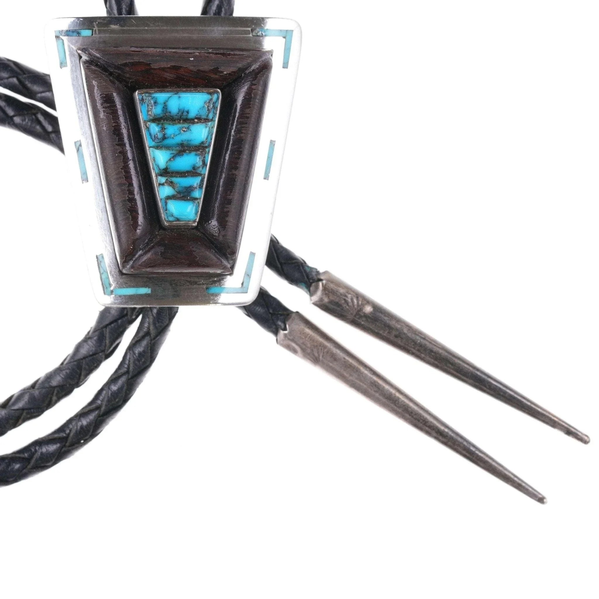 Dudley Yazzie Navajo Sterling, Cobblestone turquoise, ironwood, and Channel<br>inlay bolo tie. Extremely complex work of art mixed media bolo tie. 37" long<br>with 1 7/8" tall x 1 5/8" wide bolo slide. 51 grams.<br><br>All precious metals are tested and guaranteed, any Native American jewelry<br>referred to as Silver or Sterling is guaranteed to be a minimum of 90% (coin)<br>silver and possibly higher content. Anything marked is guaranteed to be what<br>it's marked, most bracelets are photographed on a 6" wrist, rings photographed<br>on the appropriate sized finger when possible. With bracelets if the measurement<br>is not given in the description then inside circumference is shown where the<br>metal meets the number on the the cloth tape measure.
