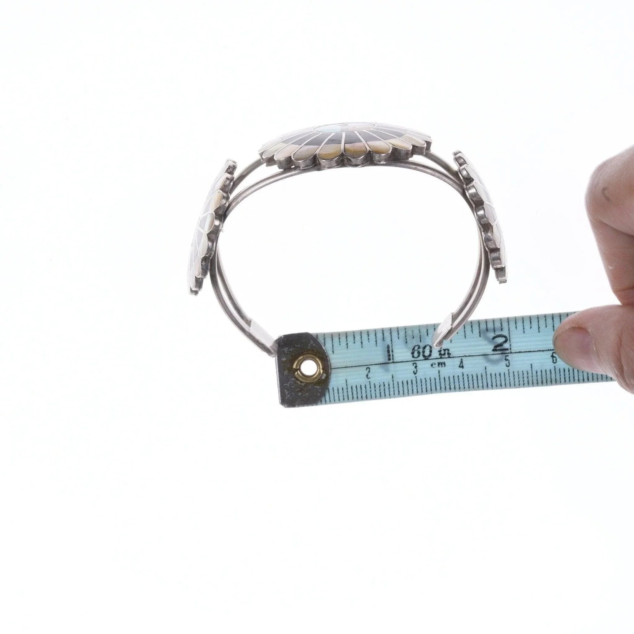 6.25" Vintage Zuni Silver Multi-Stone Channel inlay bracelet, unmarked with no<br>issues.<br><br><br>All precious metals are tested and guaranteed, any Native American jewelry<br>referred to as Silver or Sterling is guaranteed to be a minimum of 90% (coin)<br>silver and possibly higher content. Anything marked is guaranteed to be what<br>it's marked, most bracelets are photographed on a 6" wrist (non hairy), rings<br>photographed on the appropriate sized finger when possible. With bracelets if<br>the measurement is not given in the description then inside circumference is<br>shown where the metal meets the number on the the cloth tape measure.