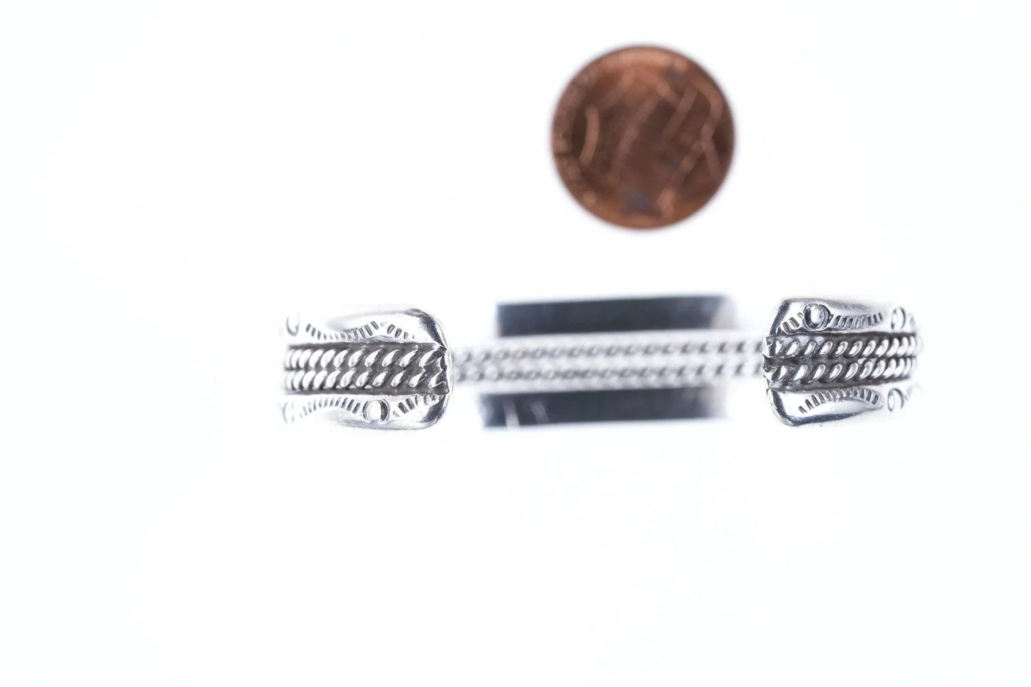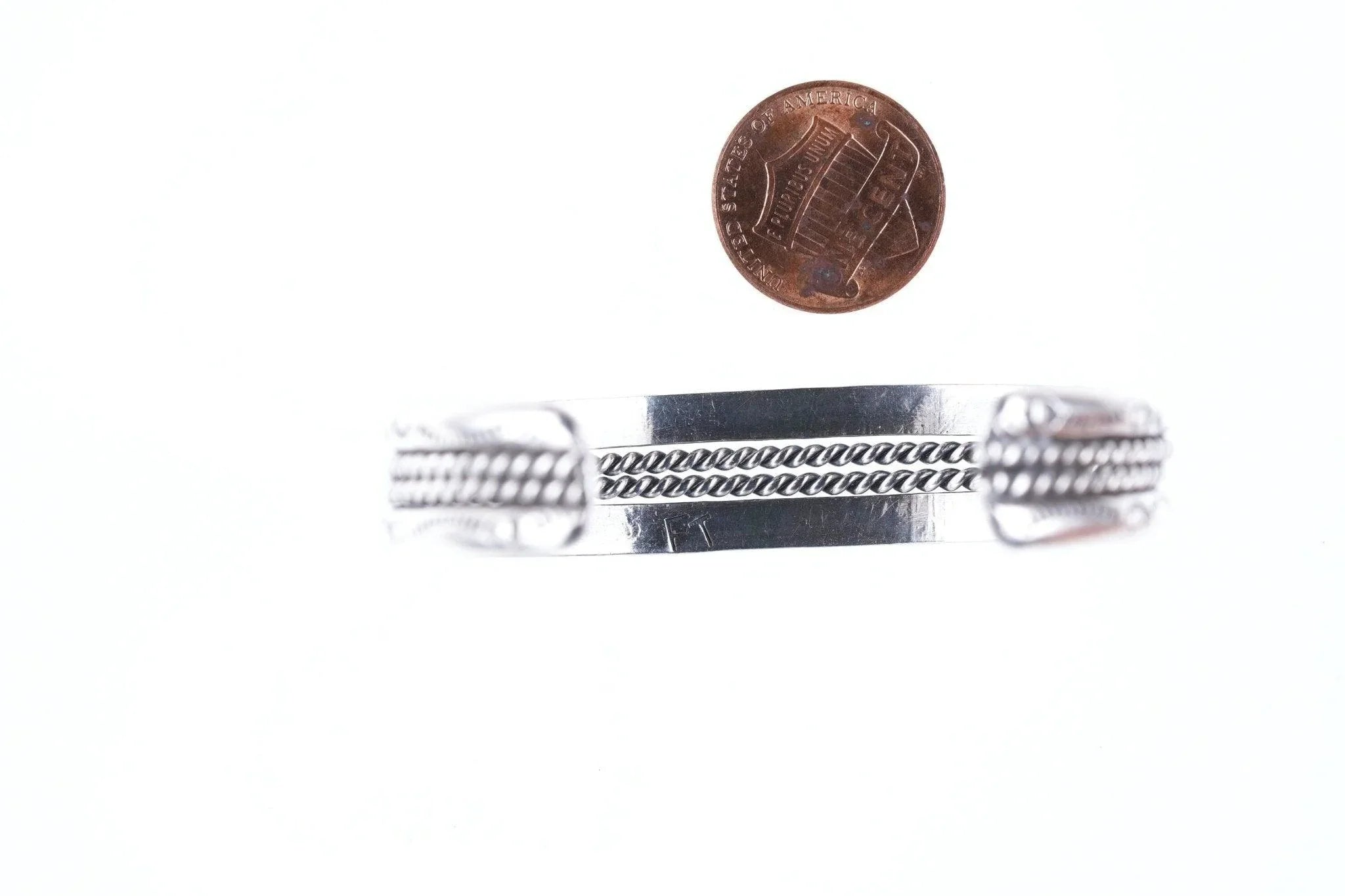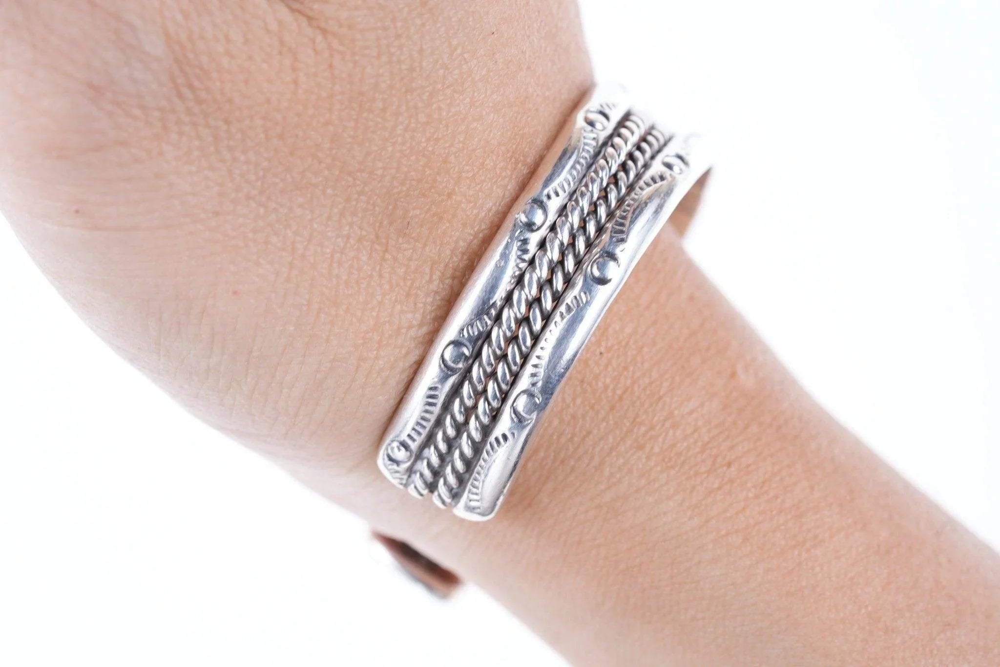 6.25" Vintage Native American sterling cuff bracelet. 6.25" inside diameter including 1" gap, unmarked other than makers mark (tested) sterling. 24.4 grams.
