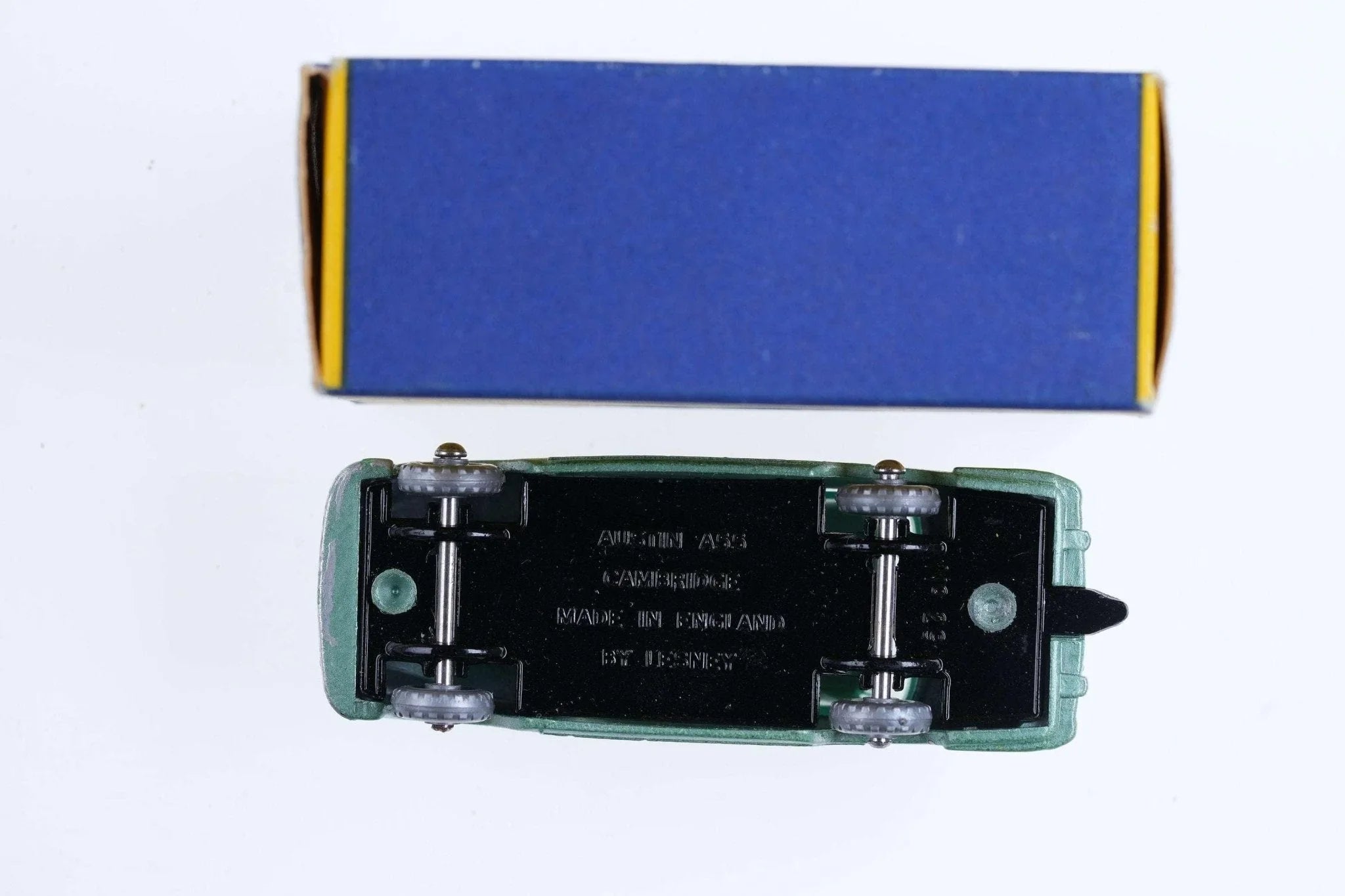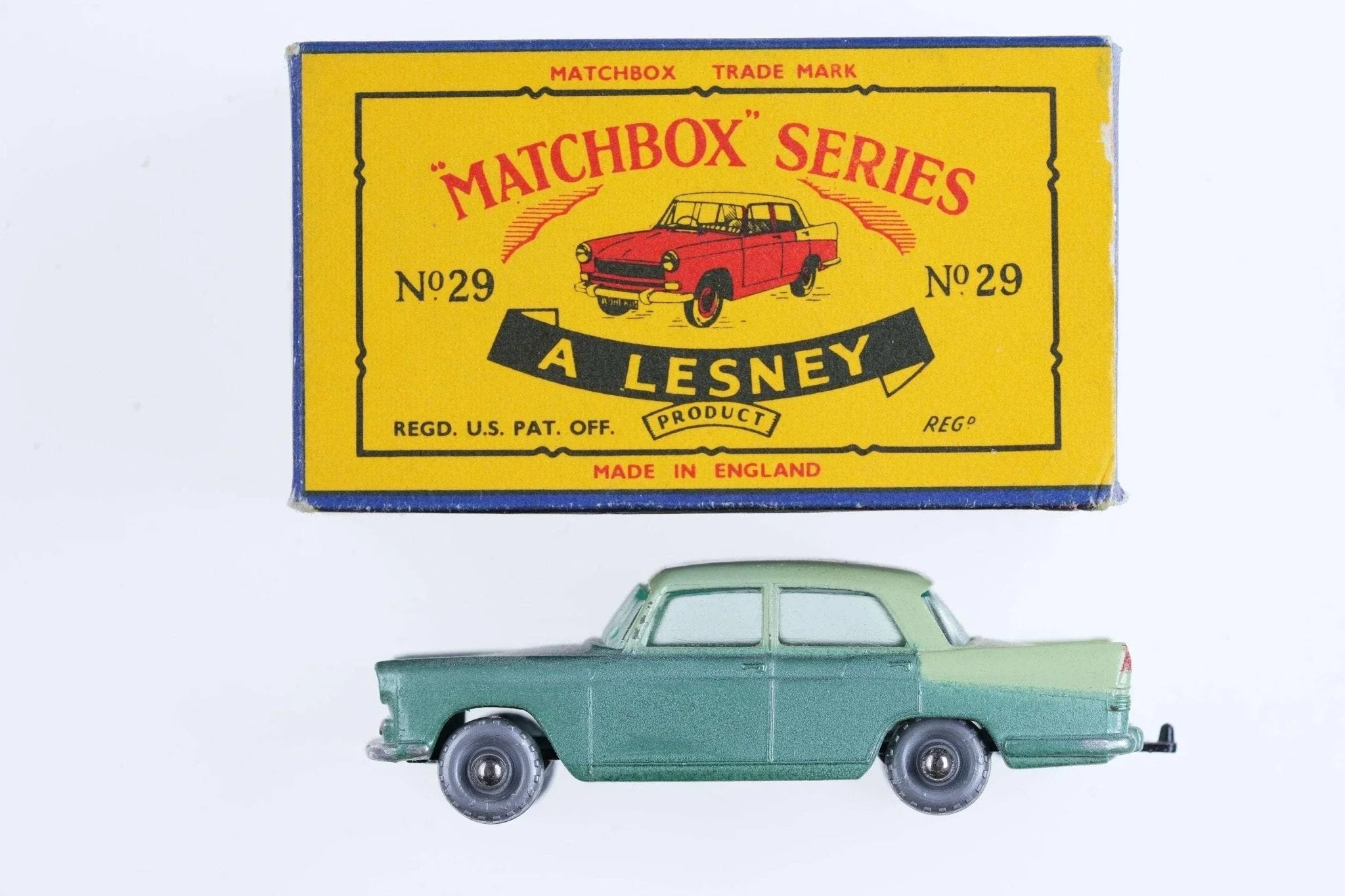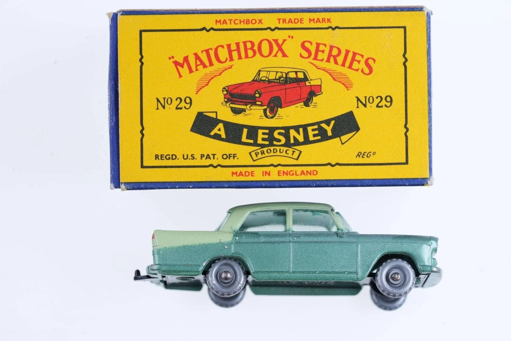 c1960 Matchbox Lesney 29 Austin A55 Cambridge. Clean box as shown, slightest wear to strip between drivers window and windshield, likely a factory flaw, no other dings or loss, front and back not shown are perfect.