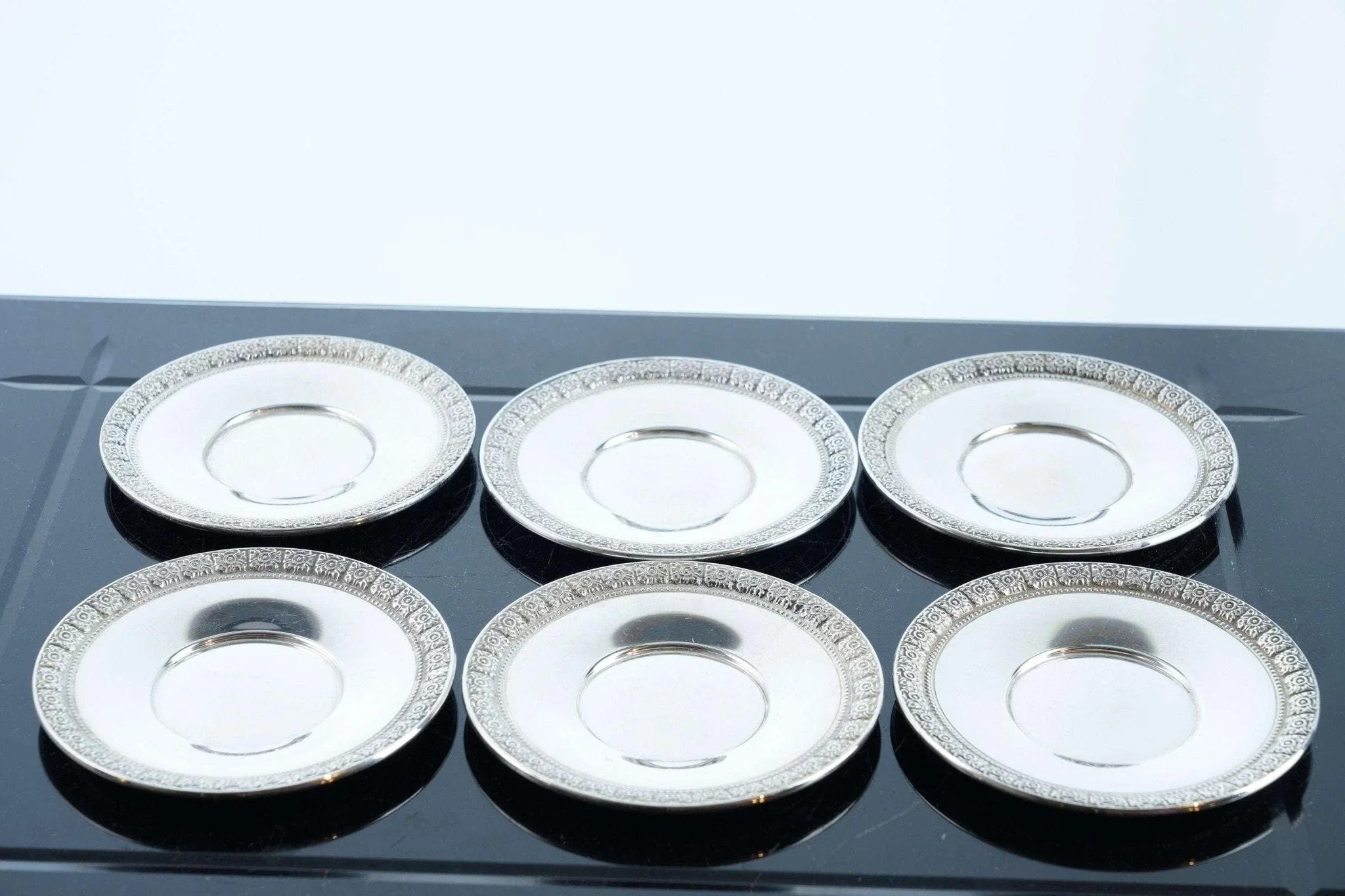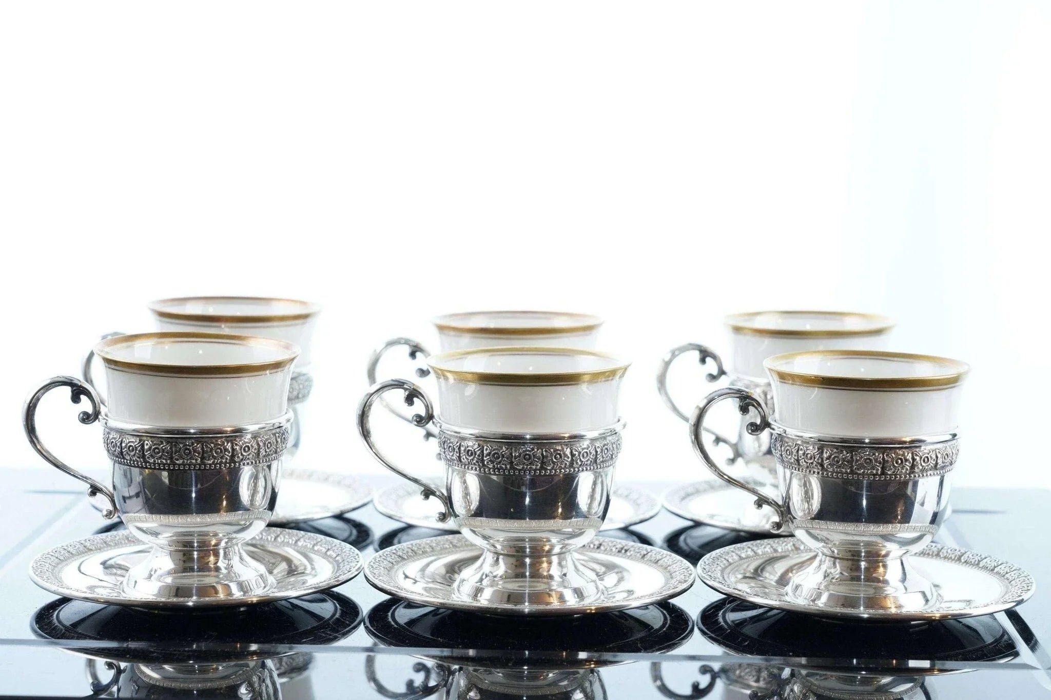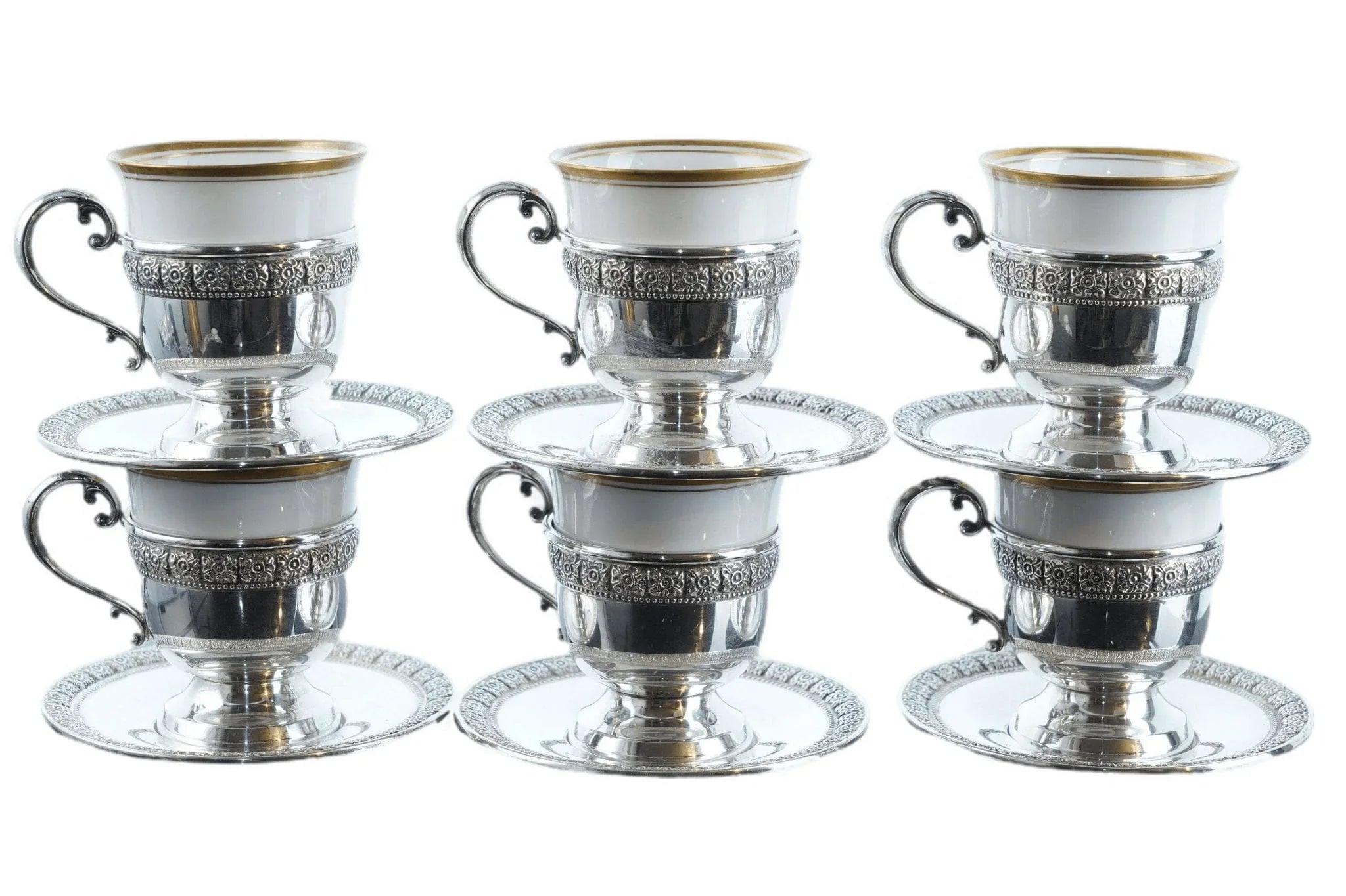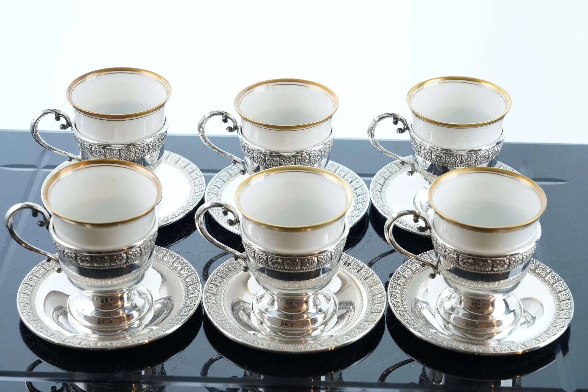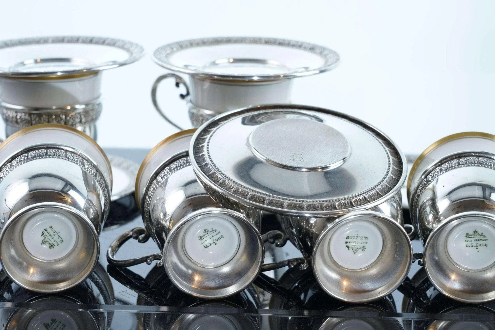 c1940's Rosenthal/Fisher Sterling Demitasse/Espresso Cup and saucer set. Selling the 6 cups and saucers, Rosenthal US Zone inserts with Fisher Sterling Holders and saucers in a very beautiful MCM pattern. Every piece is as clean as they come, I've had a lot of sets similar to this and probably never had one this clean, no bends or dents, cups fit like a glove, so deep scratches or significant wear of any kind. Saucers are 3 7/8" wide, cups are 2.75" tall with the sterling holders.