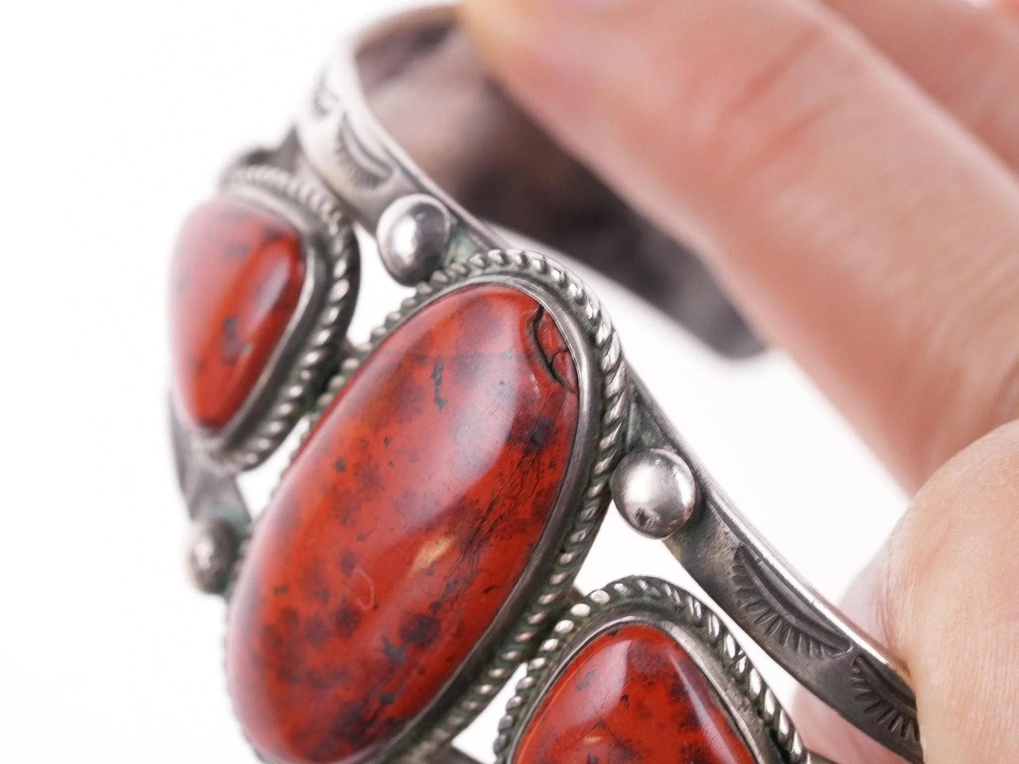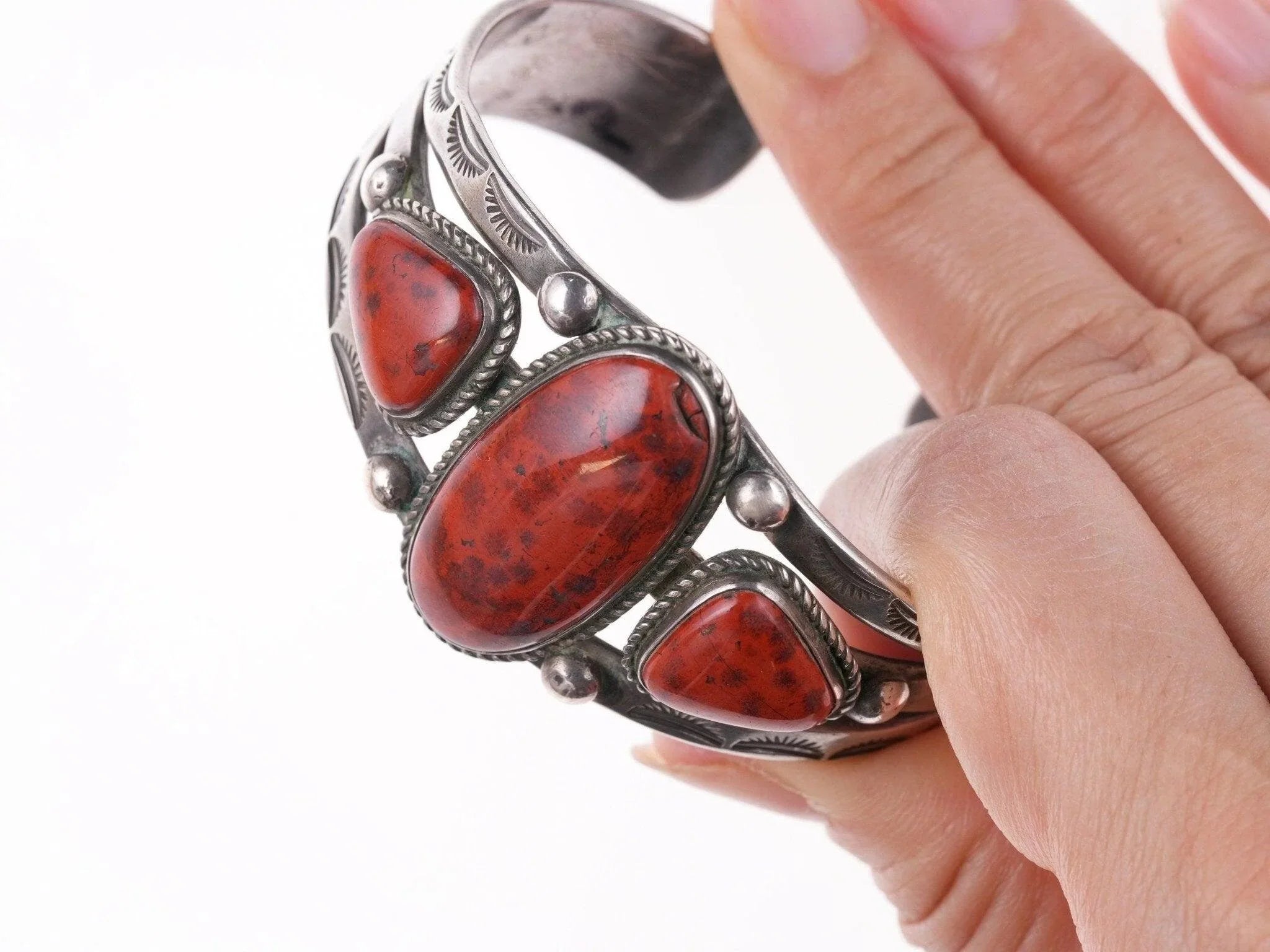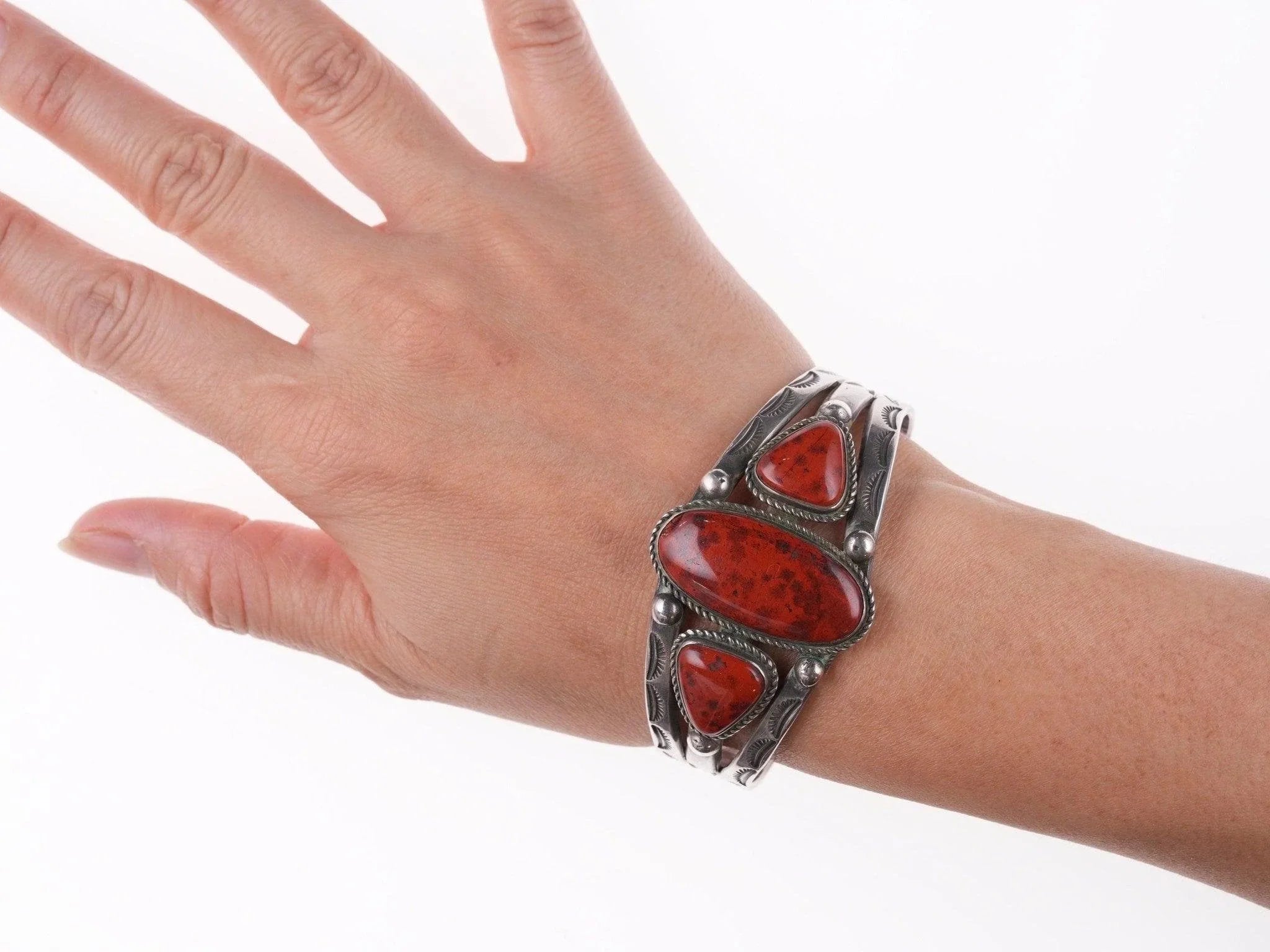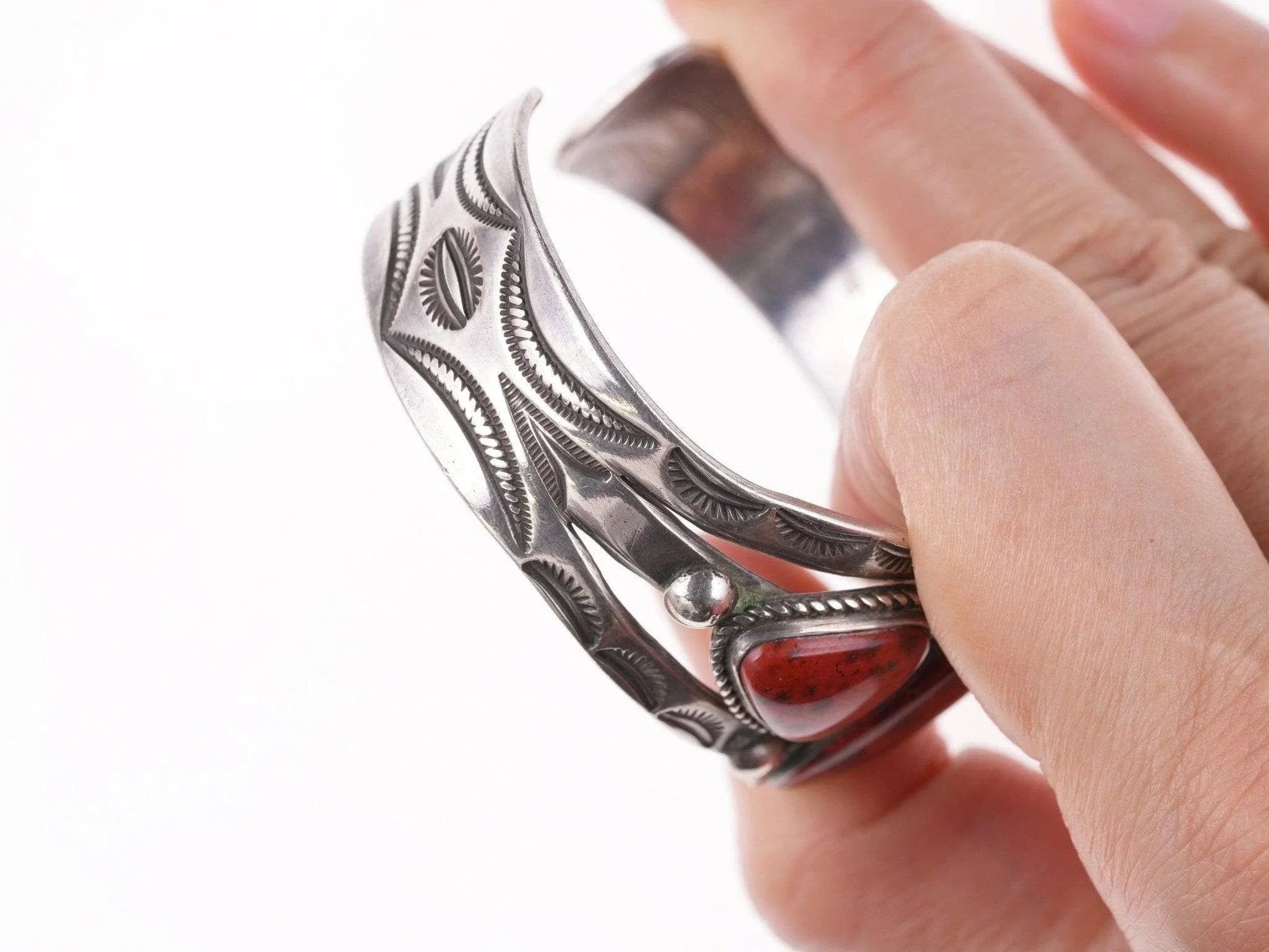6.5" 40's-50's Navajo Stamped silver red jasper cuff bracelet