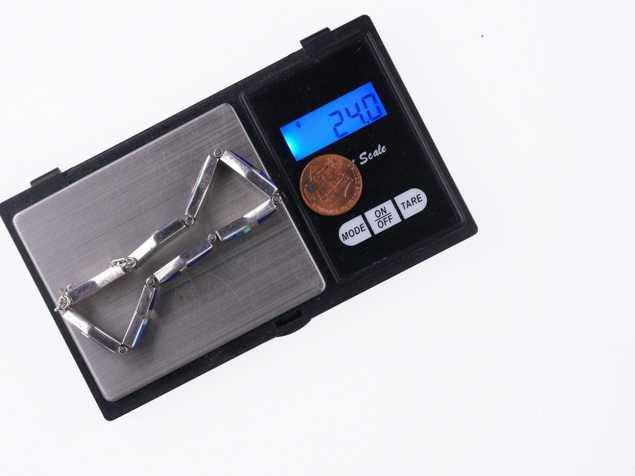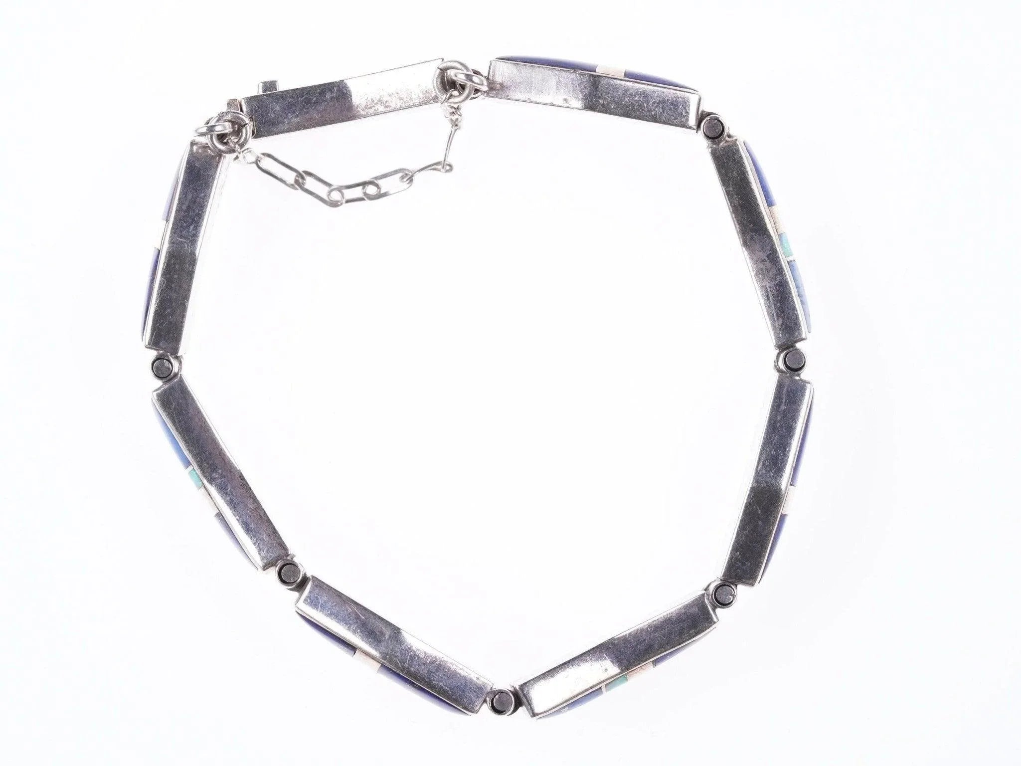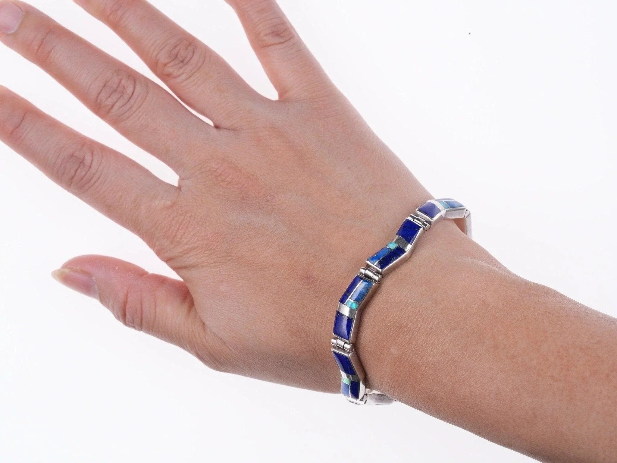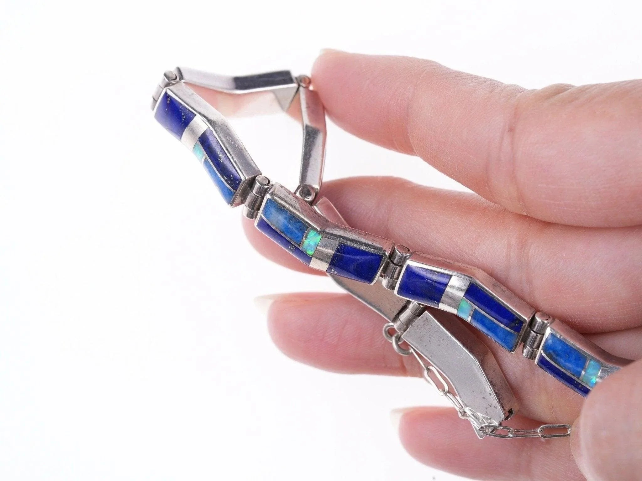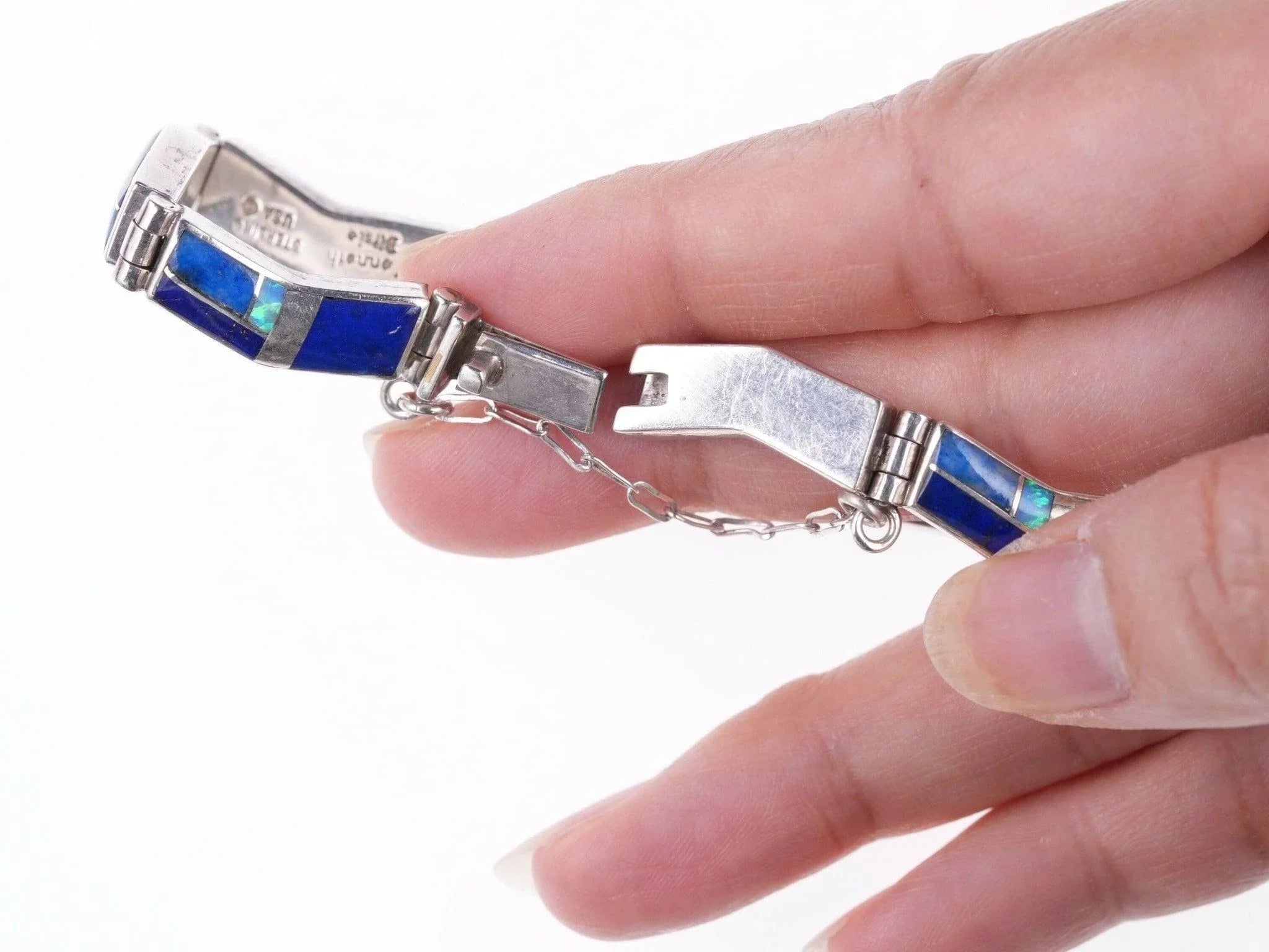 Kenneth Bitsie Navajo Lapis and Opal high grade sterling channel inlay bracelet.<br>Very clean with no issues.<br><br>Acclaimed Native American Navajo Artisan Kenneth Bitsie is an American<br>Silversmith best known for intricate Contemporary Design Inlay Jewelry. Kenneth<br>Bitsie at times has been part of New Mexico local jeweler, Steve Harper of<br>Stoneweaver, select team of master inlay stone and silver artisans to execute<br>his fine contemporary jewelry designs.<br><br>anderas
