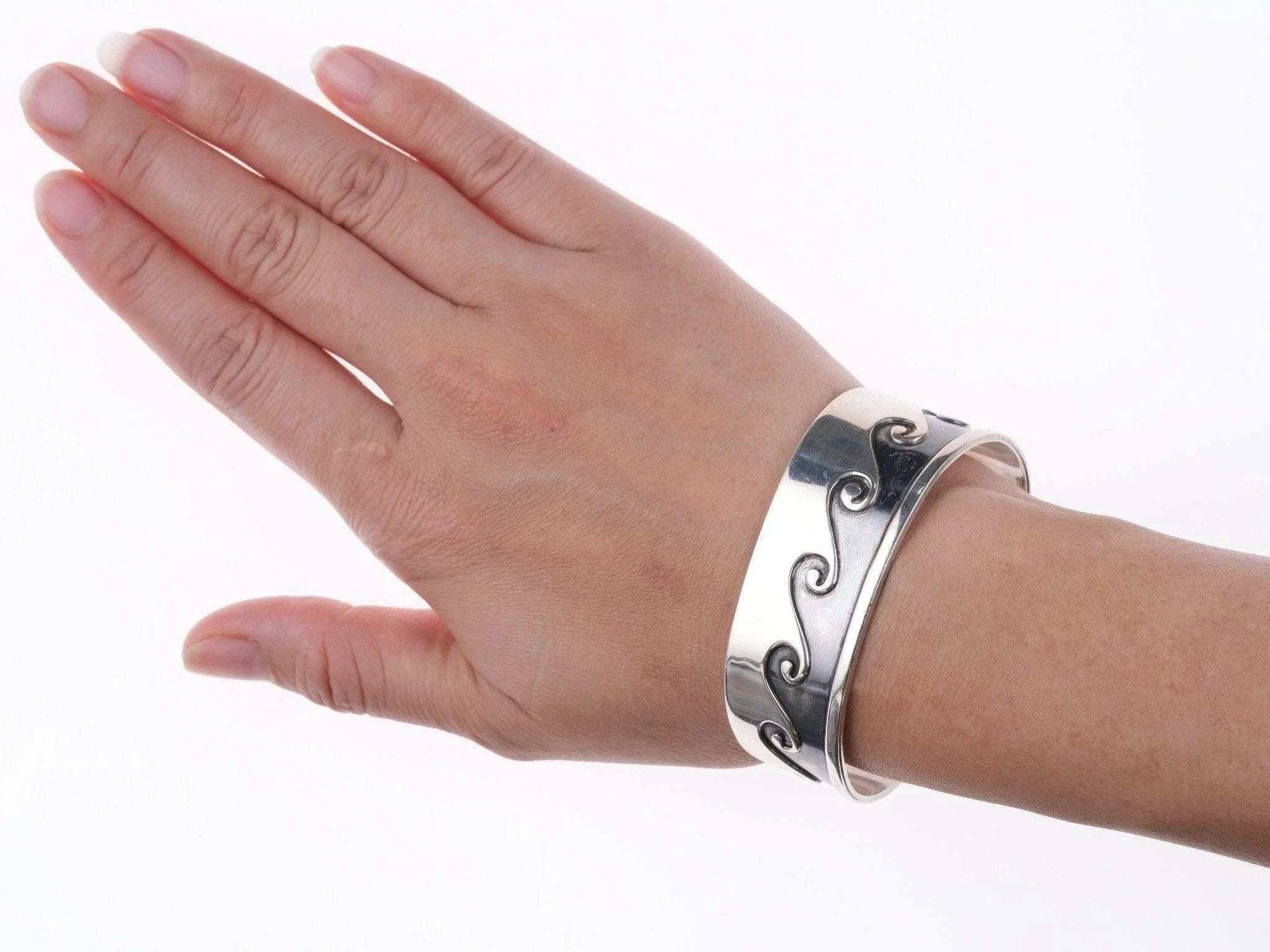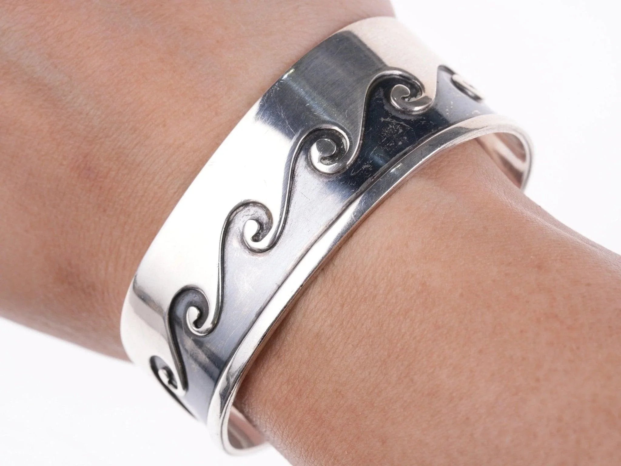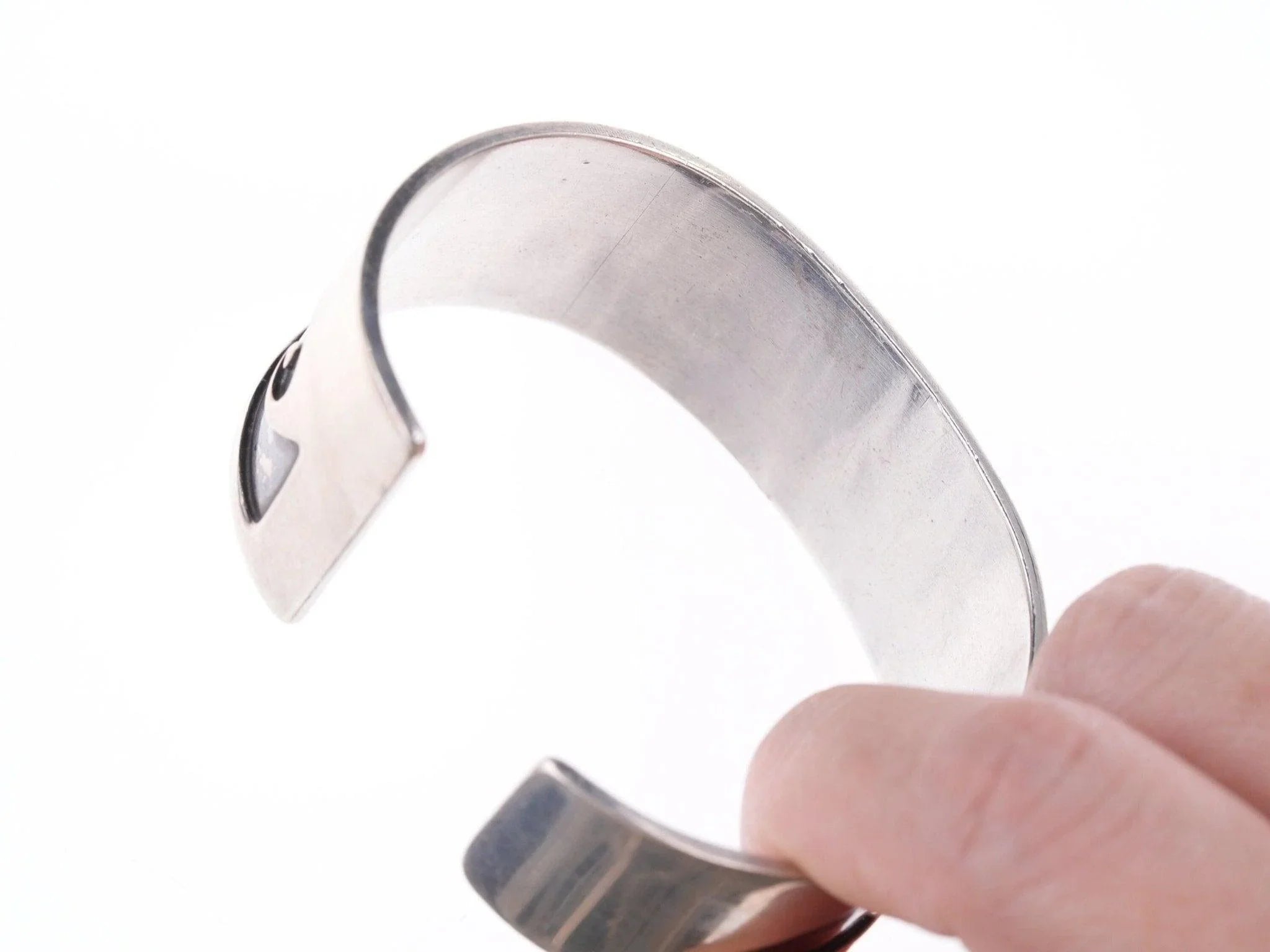 6.5" Vintage Native American Sterling Overlay style bracelet. High quality<br>handmade overlay bracelet with no markings.<br><br>All precious metals are tested and guaranteed, any Native American jewelry<br>referred to as Silver or Sterling is guaranteed to be a minimum of 90% (coin)<br>silver and possibly higher content. Anything marked is guaranteed to be what<br>it's marked, most bracelets are photographed on a 6" wrist (non hairy), rings<br>photographed on the appropriate sized finger when possible. With bracelets if<br>the measurement is not given in the description then inside circumference is<br>shown where the metal meets the number on the the cloth tape measure.