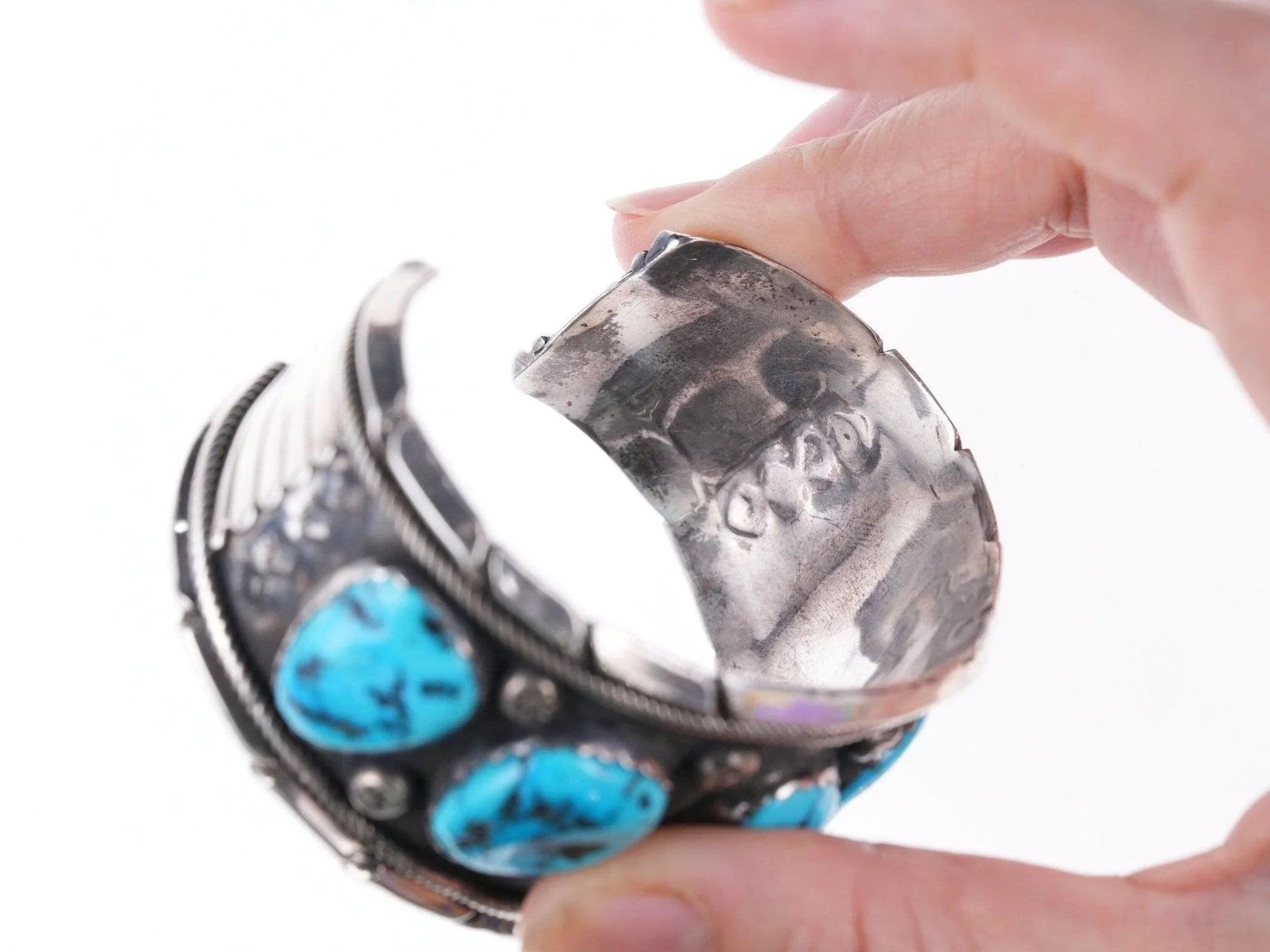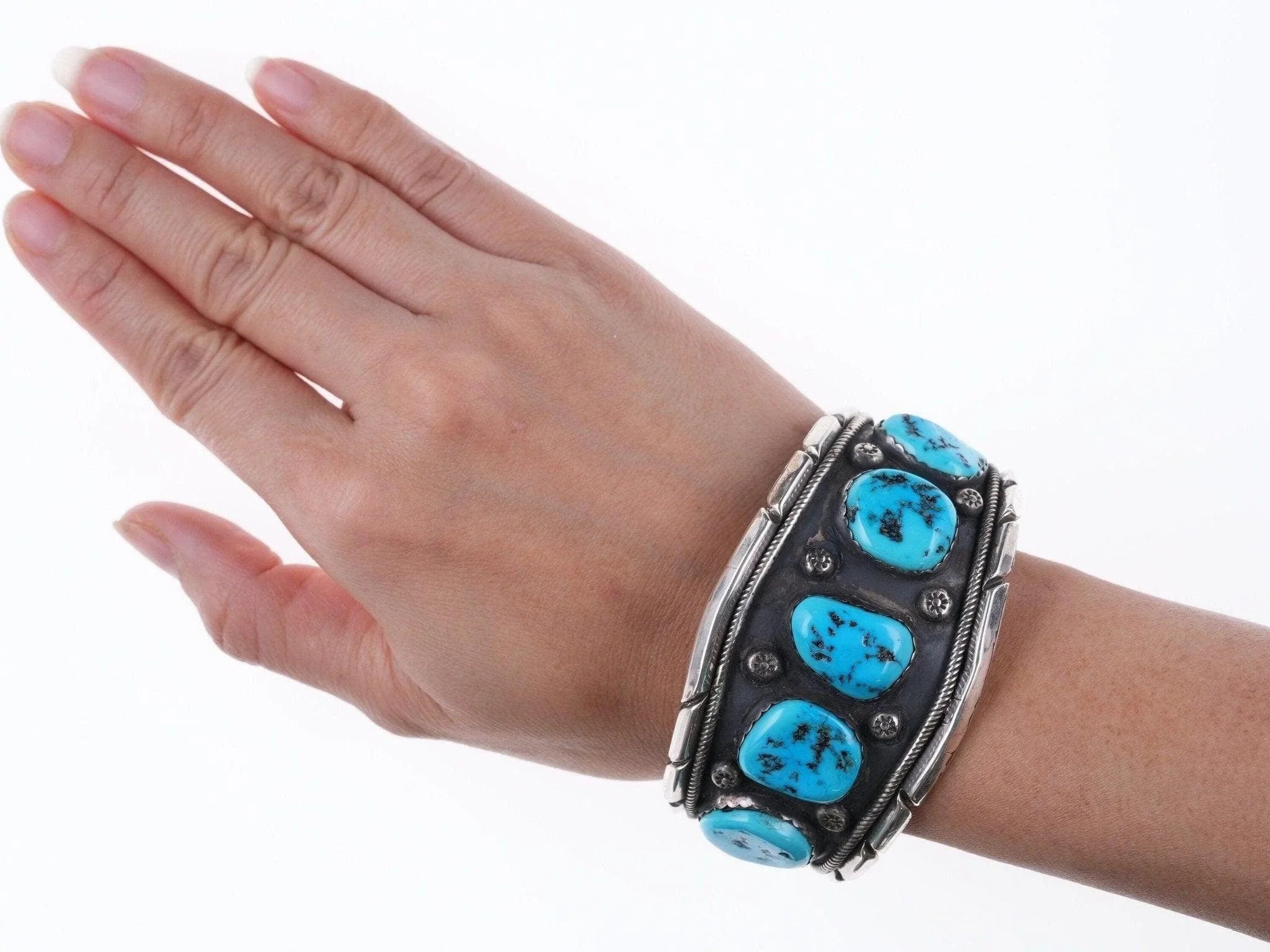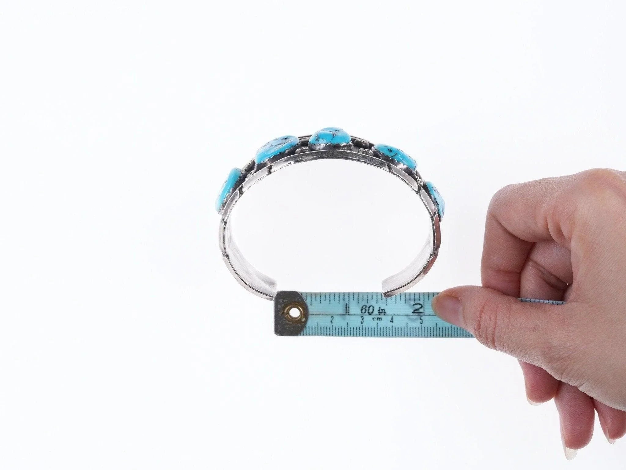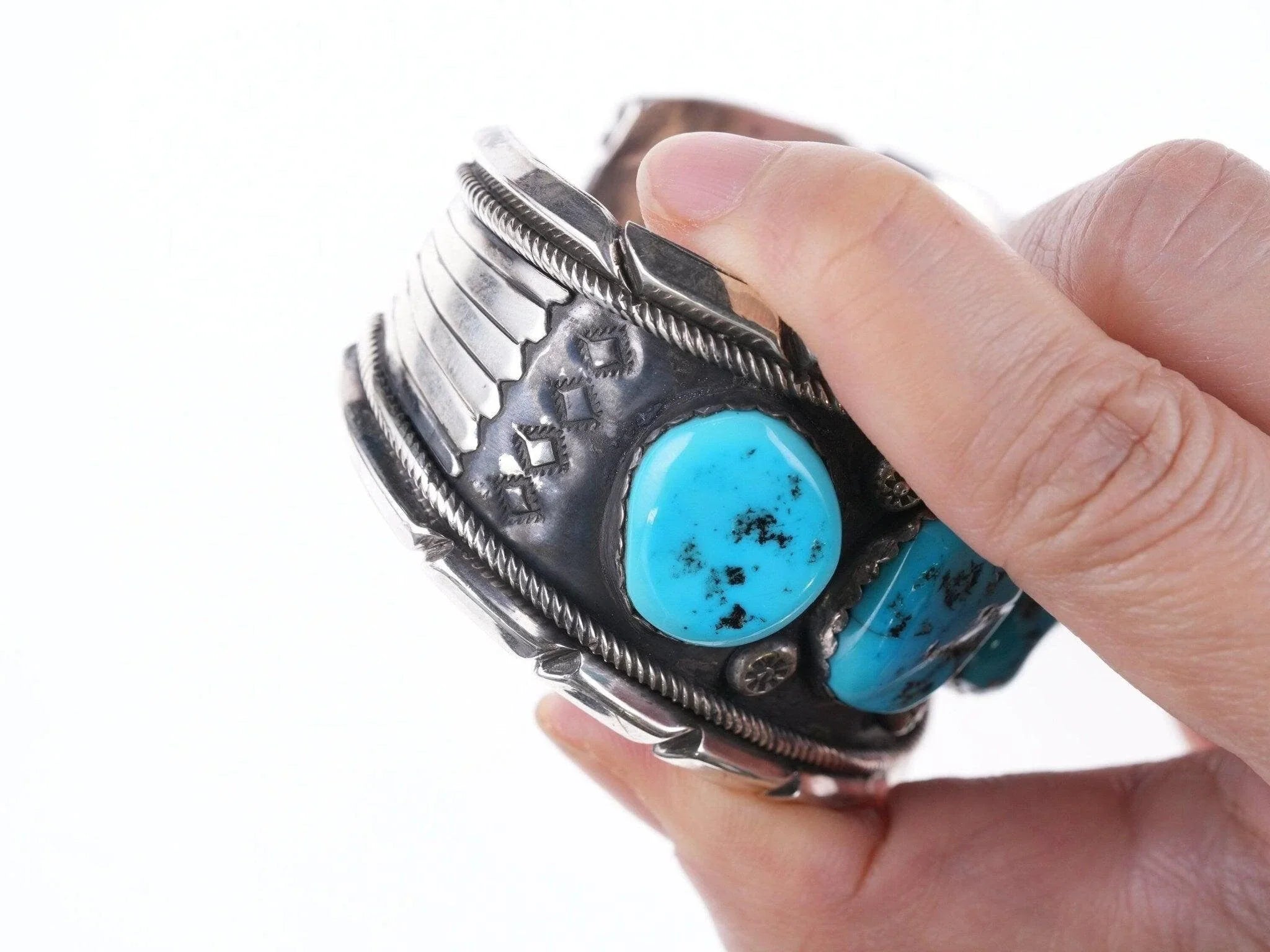 7.25" Large Navajo Sterling and turquoise bracelet. Unmarked, nice old 60's-70's<br>bracelet.<br><br>All precious metals are tested and guaranteed, any Native American jewelry<br>referred to as Silver or Sterling is guaranteed to be a minimum of 90% (coin)<br>silver and possibly higher content. Anything marked is guaranteed to be what<br>it's marked, most bracelets are photographed on a 6" wrist (non hairy), rings<br>photographed on the appropriate sized finger when possible. With bracelets if<br>the measurement is not given in the description then inside circumference is<br>shown where the metal meets the number on the the cloth tape measure.