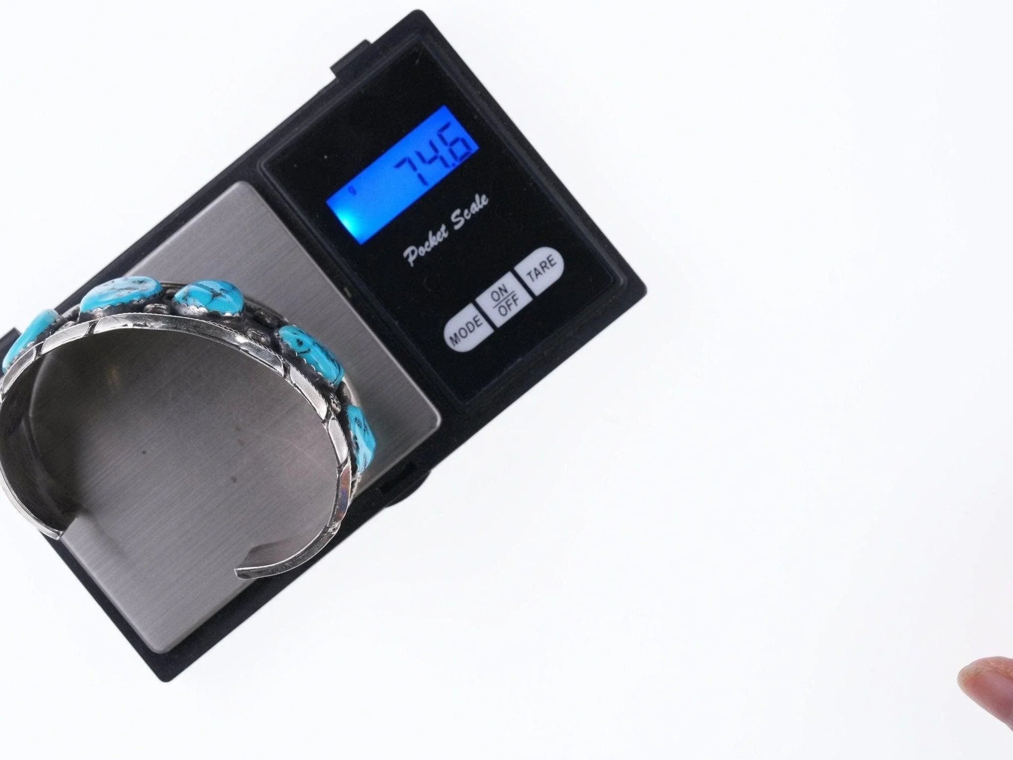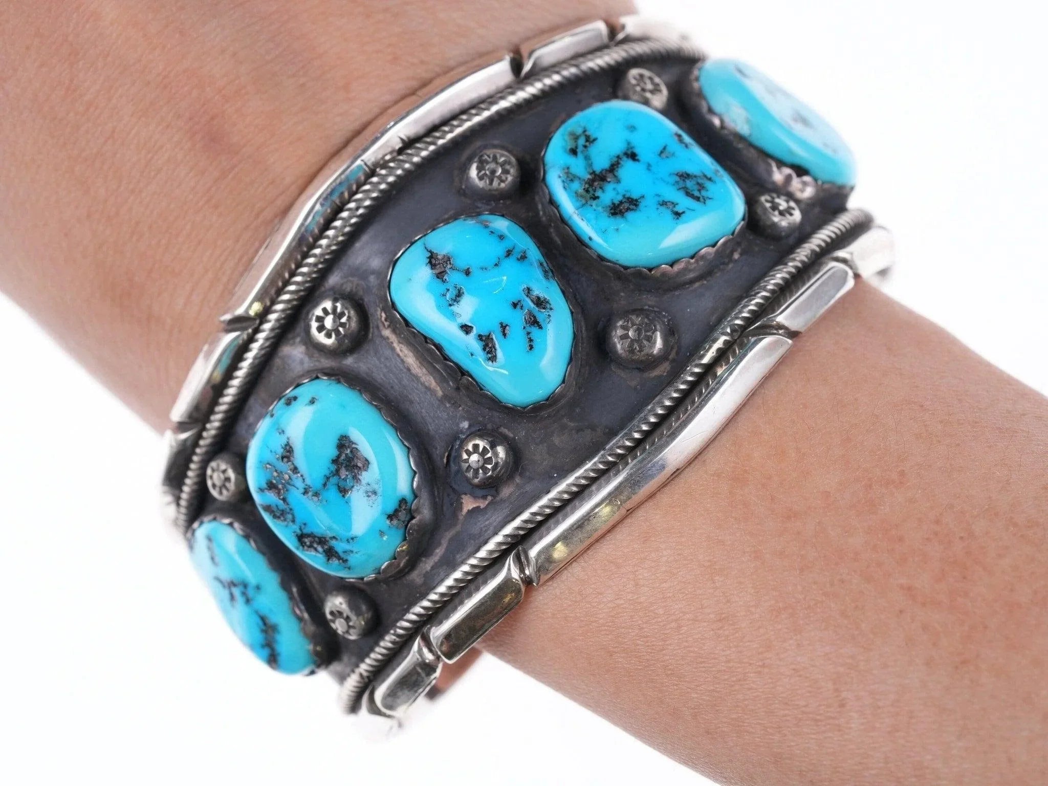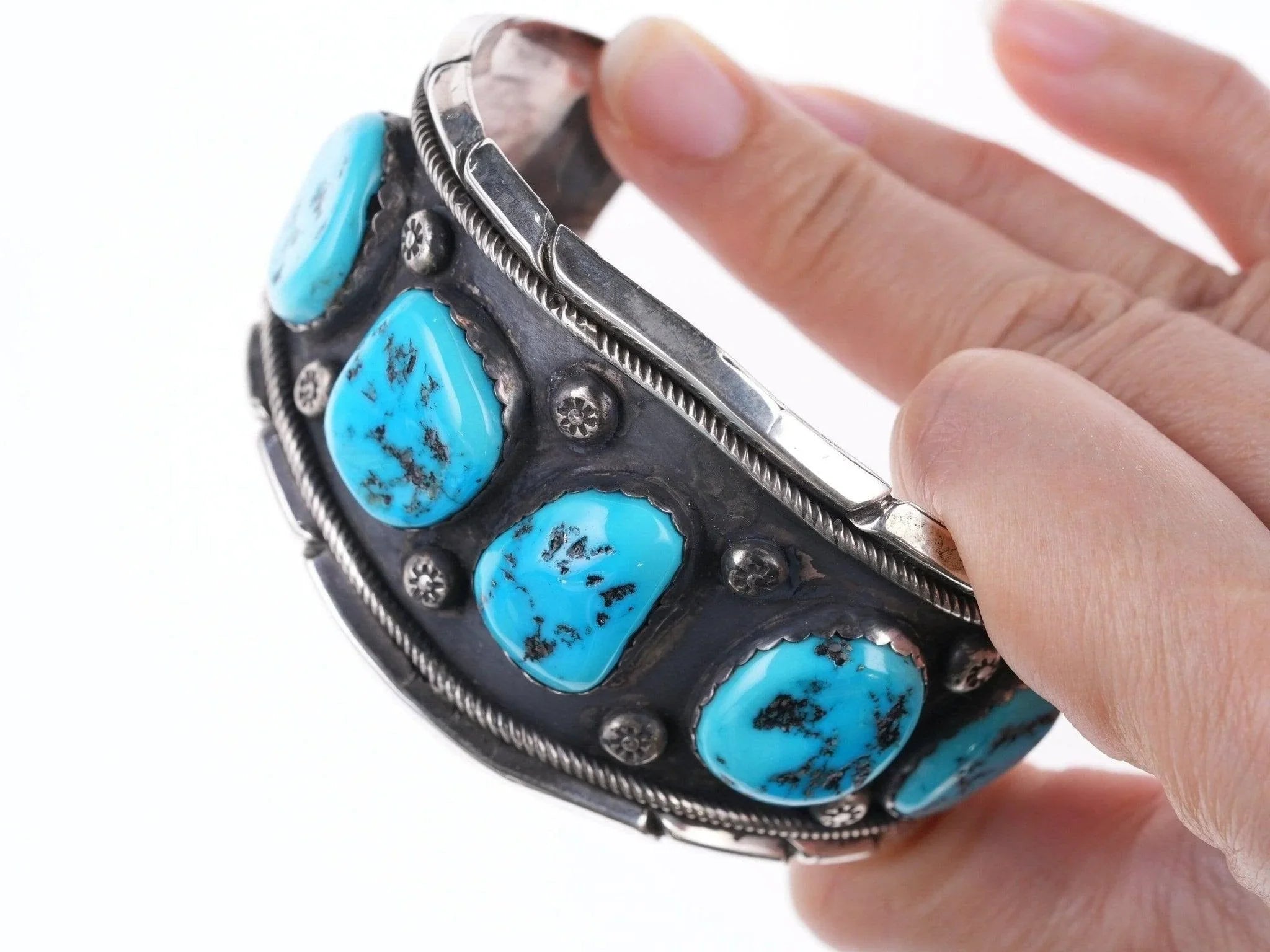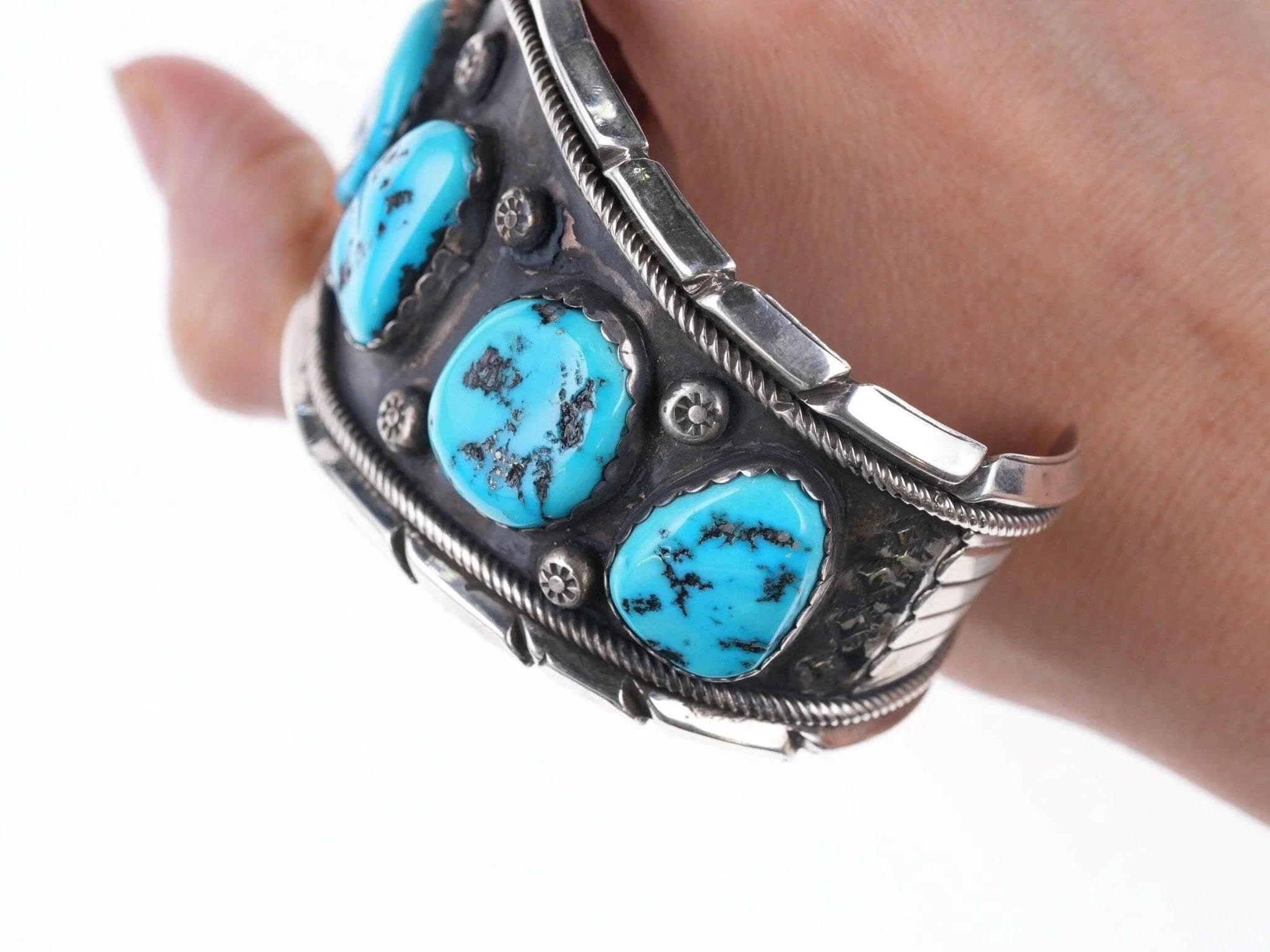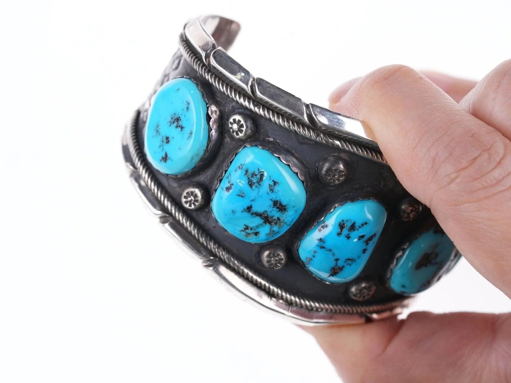 7.25" Large Navajo Sterling and turquoise bracelet. Unmarked, nice old 60's-70's<br>bracelet.<br><br>All precious metals are tested and guaranteed, any Native American jewelry<br>referred to as Silver or Sterling is guaranteed to be a minimum of 90% (coin)<br>silver and possibly higher content. Anything marked is guaranteed to be what<br>it's marked, most bracelets are photographed on a 6" wrist (non hairy), rings<br>photographed on the appropriate sized finger when possible. With bracelets if<br>the measurement is not given in the description then inside circumference is<br>shown where the metal meets the number on the the cloth tape measure.