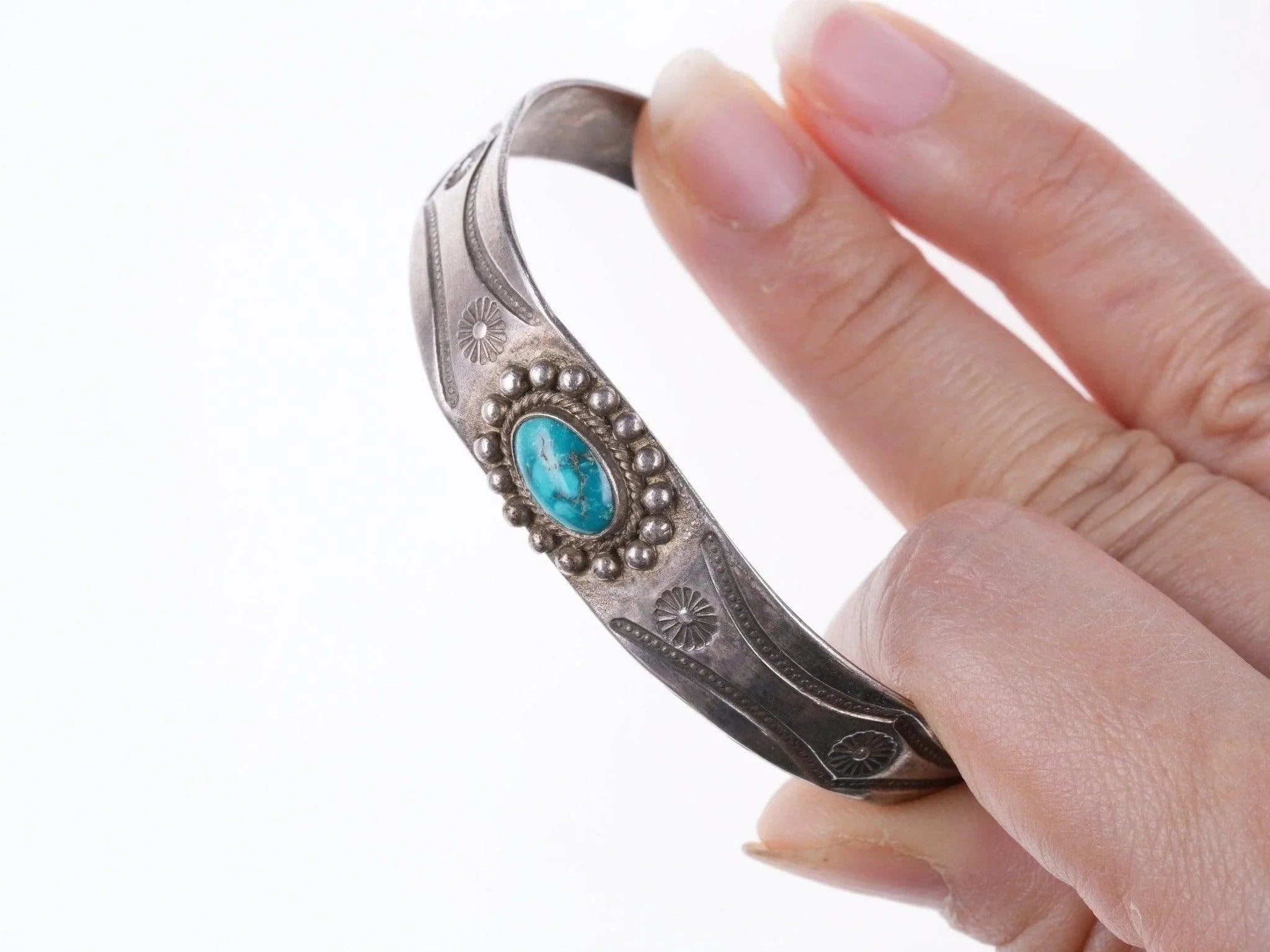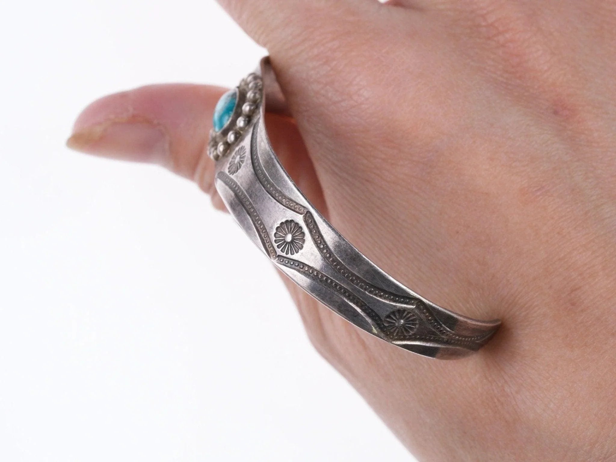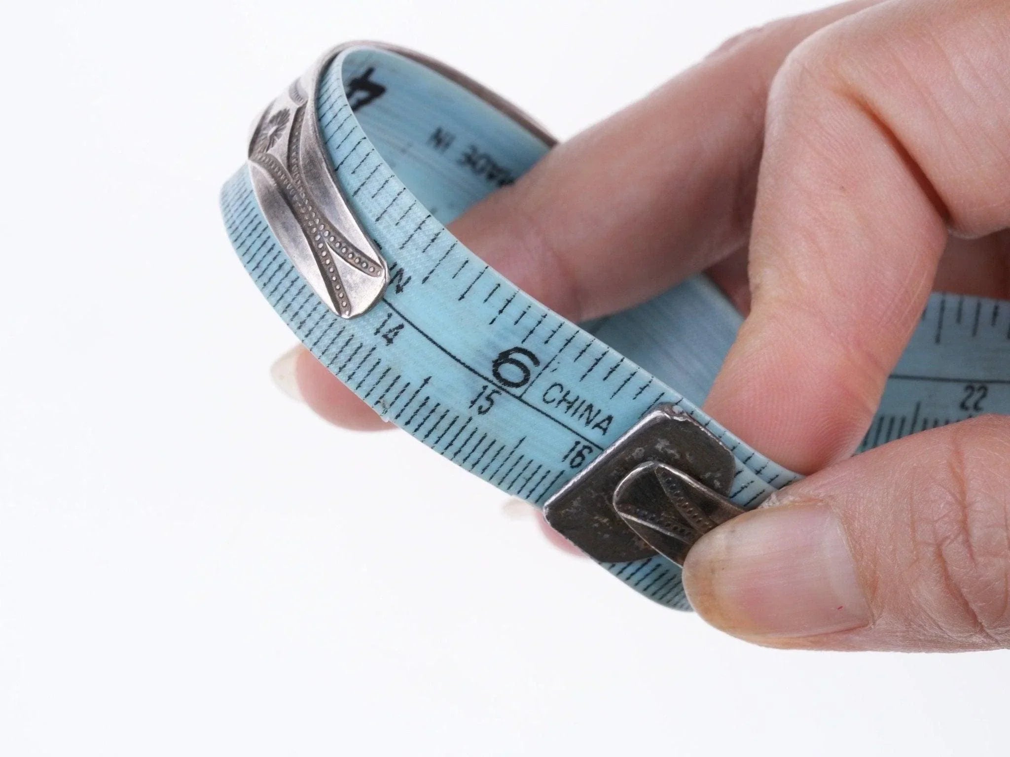 6 3/8" 30's Navajo Hand stamped silver and turquoise Fred Harvey era bracelet. >All precious metals are tested and guaranteed, any Native American jewelry<br>referred to as Silver or Sterling is guaranteed to be a minimum of 90% (coin)<br>silver and possibly higher content. Anything marked is guaranteed to be what<br>it's marked, most bracelets are photographed on a 6" wrist (non hairy), rings<br>photographed on the appropriate sized finger when possible. With bracelets if<br>the measurement is not given in the description then inside circumference is<br>shown where the metal meets the number on the the cloth tape measure.