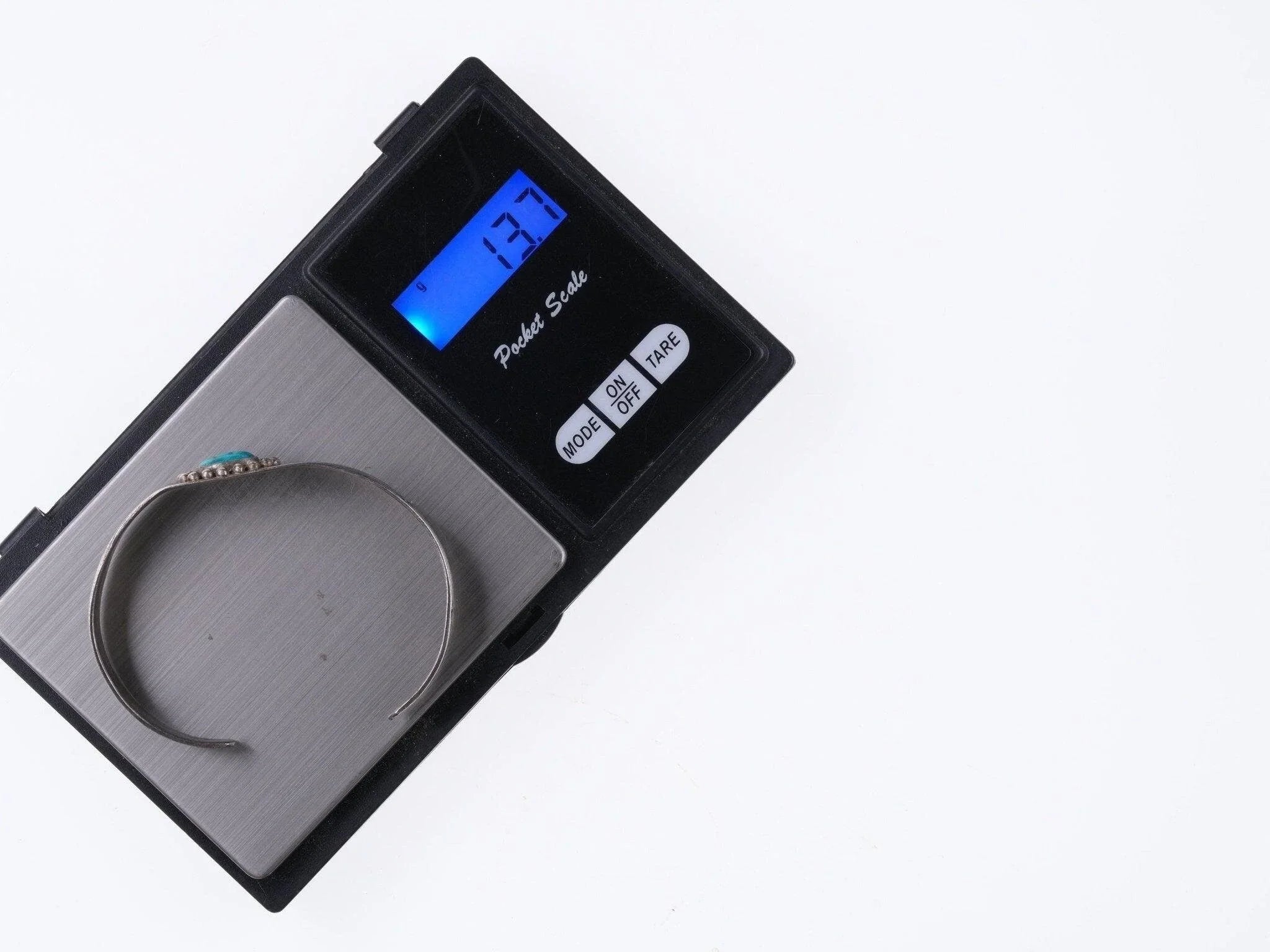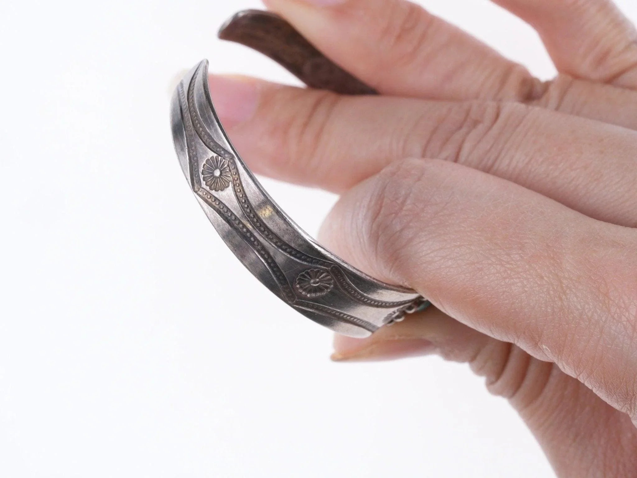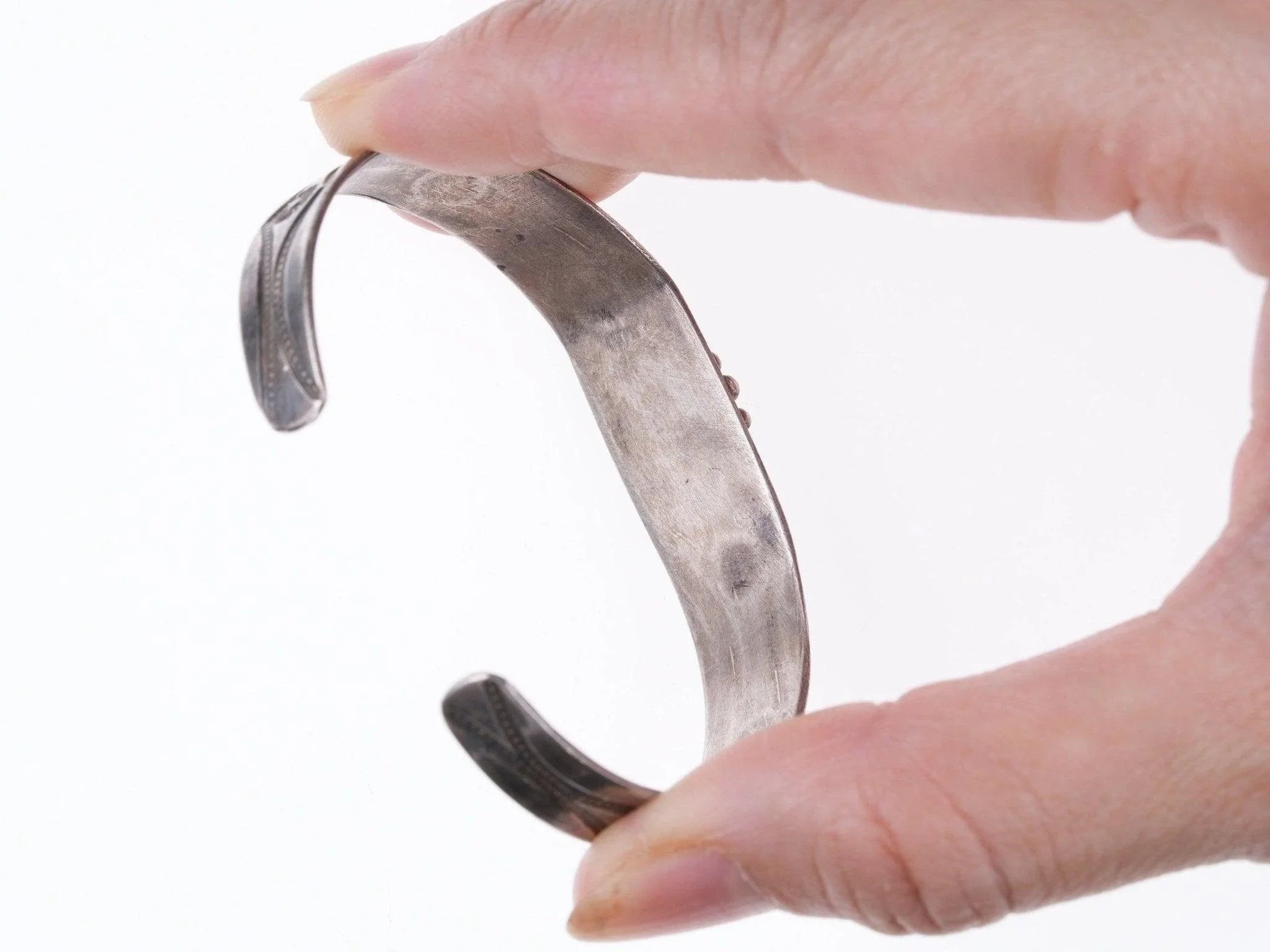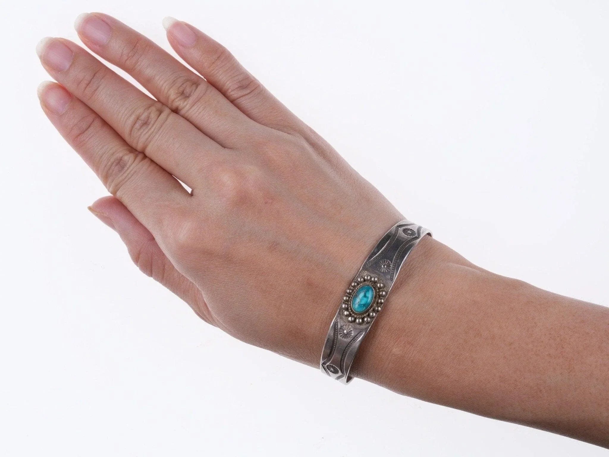 6 3/8" 30's Navajo Hand stamped silver and turquoise Fred Harvey era bracelet. >All precious metals are tested and guaranteed, any Native American jewelry<br>referred to as Silver or Sterling is guaranteed to be a minimum of 90% (coin)<br>silver and possibly higher content. Anything marked is guaranteed to be what<br>it's marked, most bracelets are photographed on a 6" wrist (non hairy), rings<br>photographed on the appropriate sized finger when possible. With bracelets if<br>the measurement is not given in the description then inside circumference is<br>shown where the metal meets the number on the the cloth tape measure.