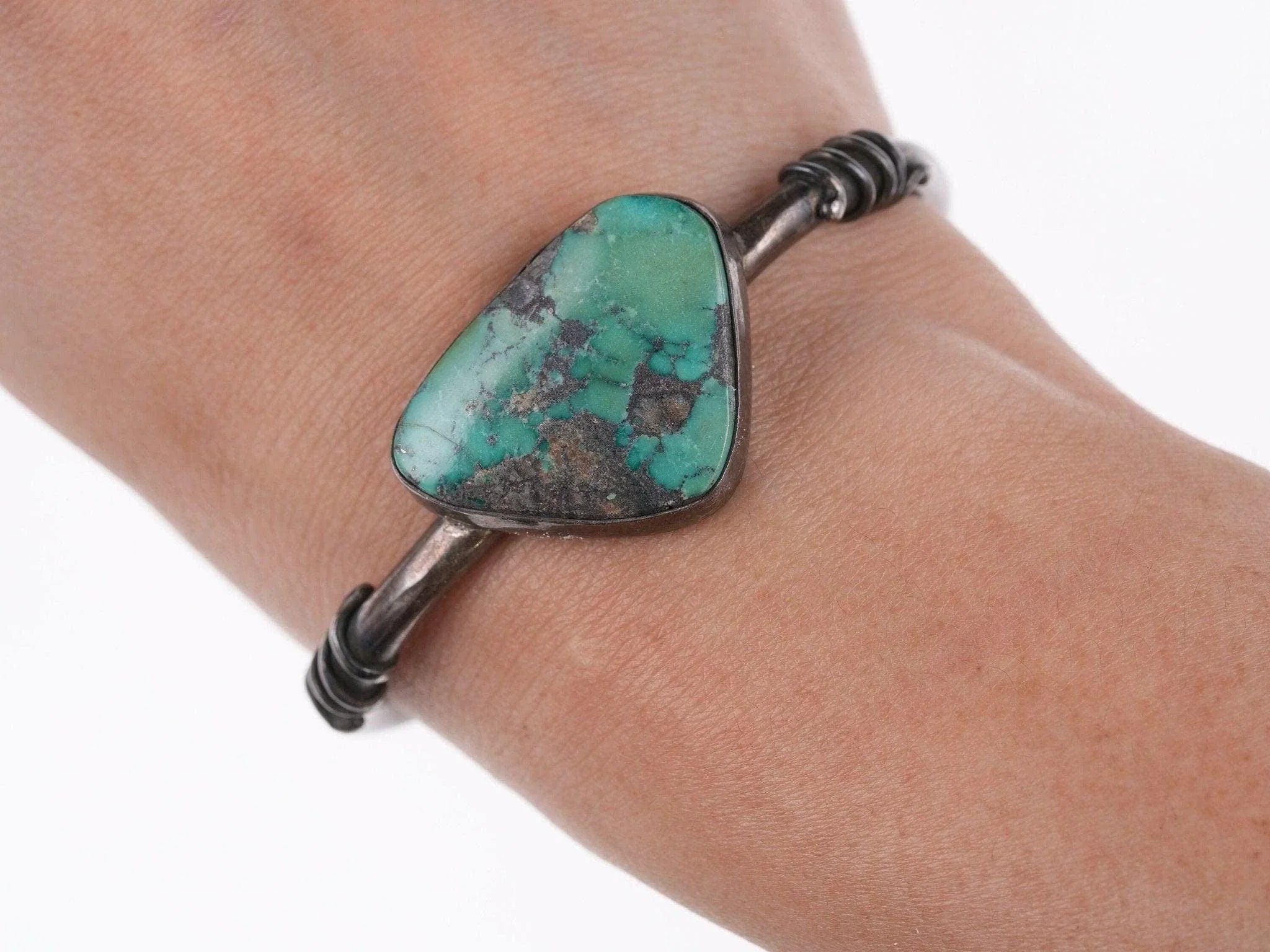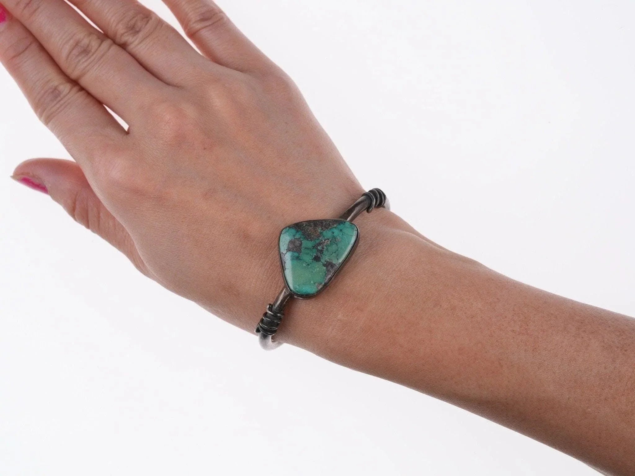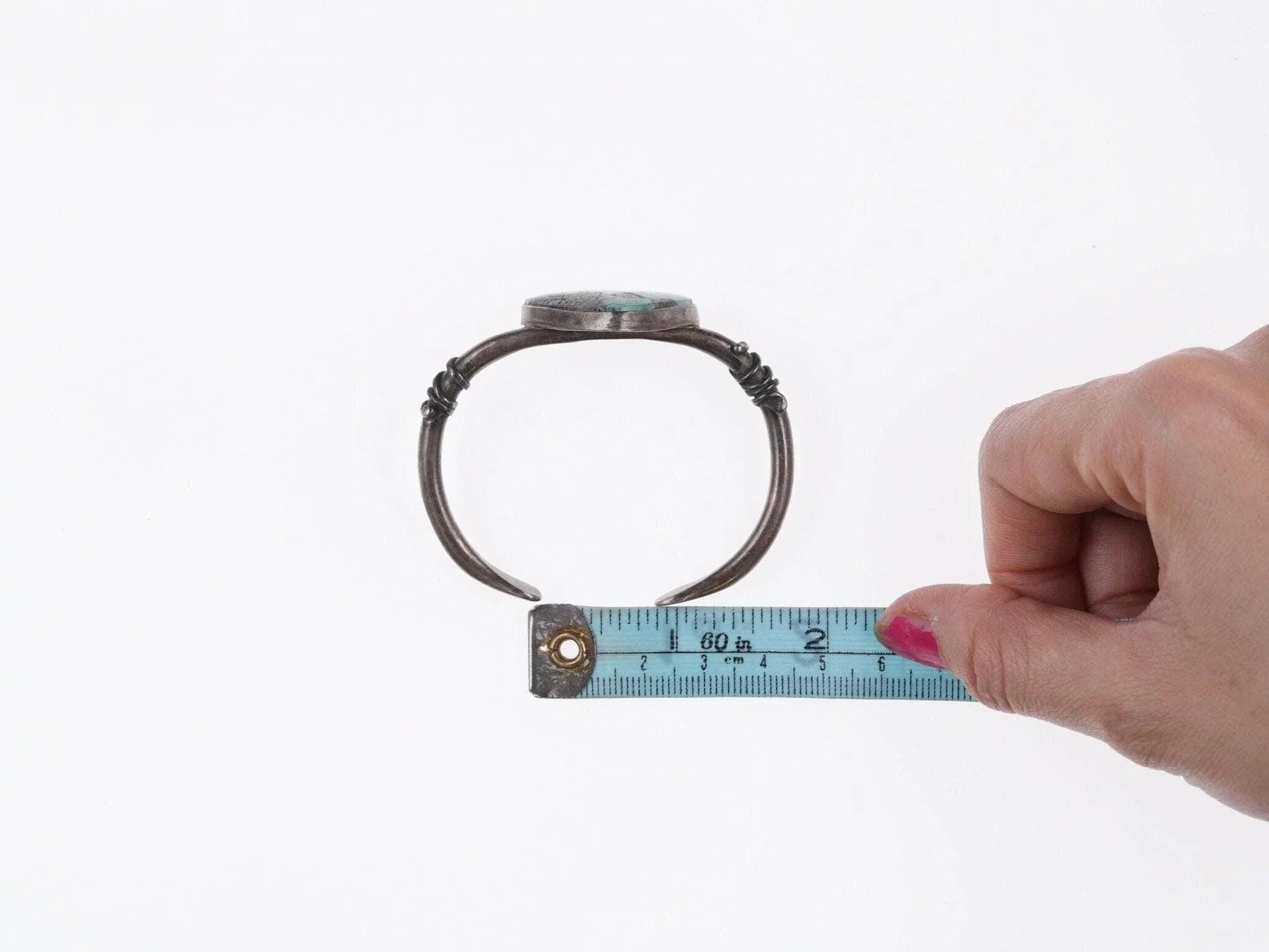 6.25" Vintage Southwestern sterling and turquoise bracelet<br><br>All precious metals are tested and guaranteed, any Native American jewelry<br>referred to as Silver or Sterling is guaranteed to be a minimum of 90% (coin)<br>silver and possibly higher content. Anything marked is guaranteed to be what<br>it's marked, most bracelets are photographed on a 6" wrist (non hairy), rings<br>photographed on the appropriate sized finger when possible. With bracelets if<br>the measurement is not given in the description then inside circumference is<br>shown where the metal meets the number on the the cloth tape measure.