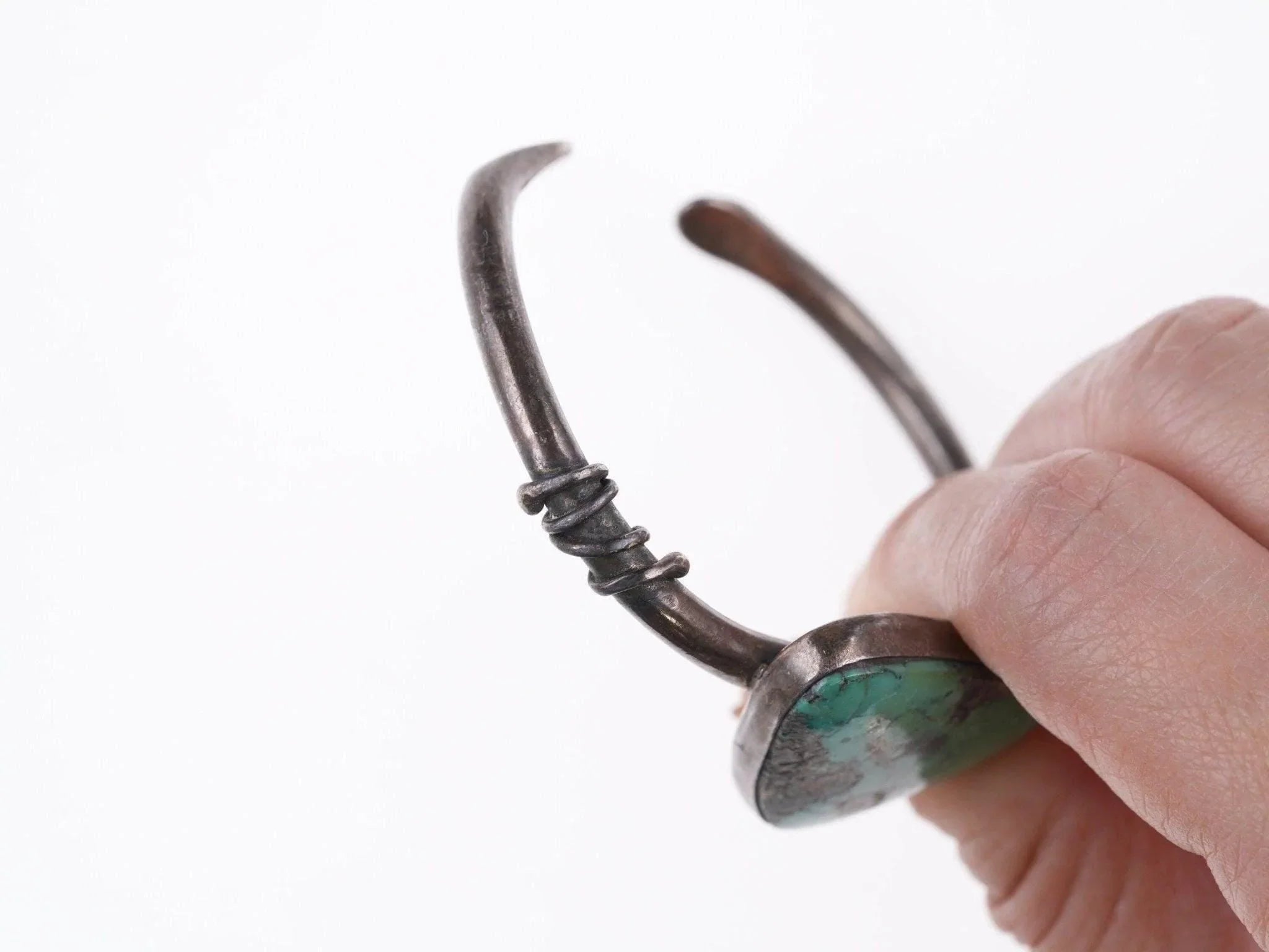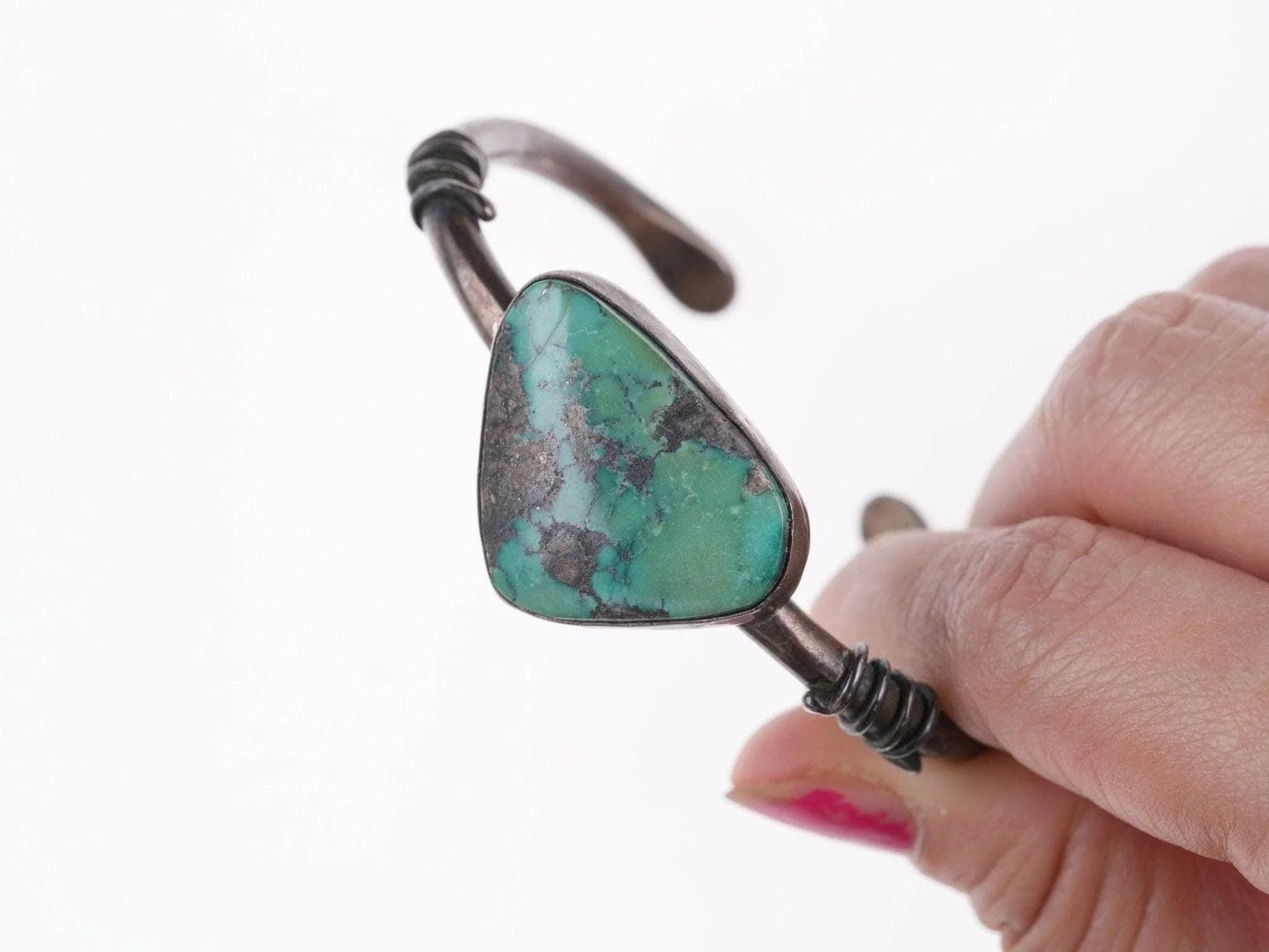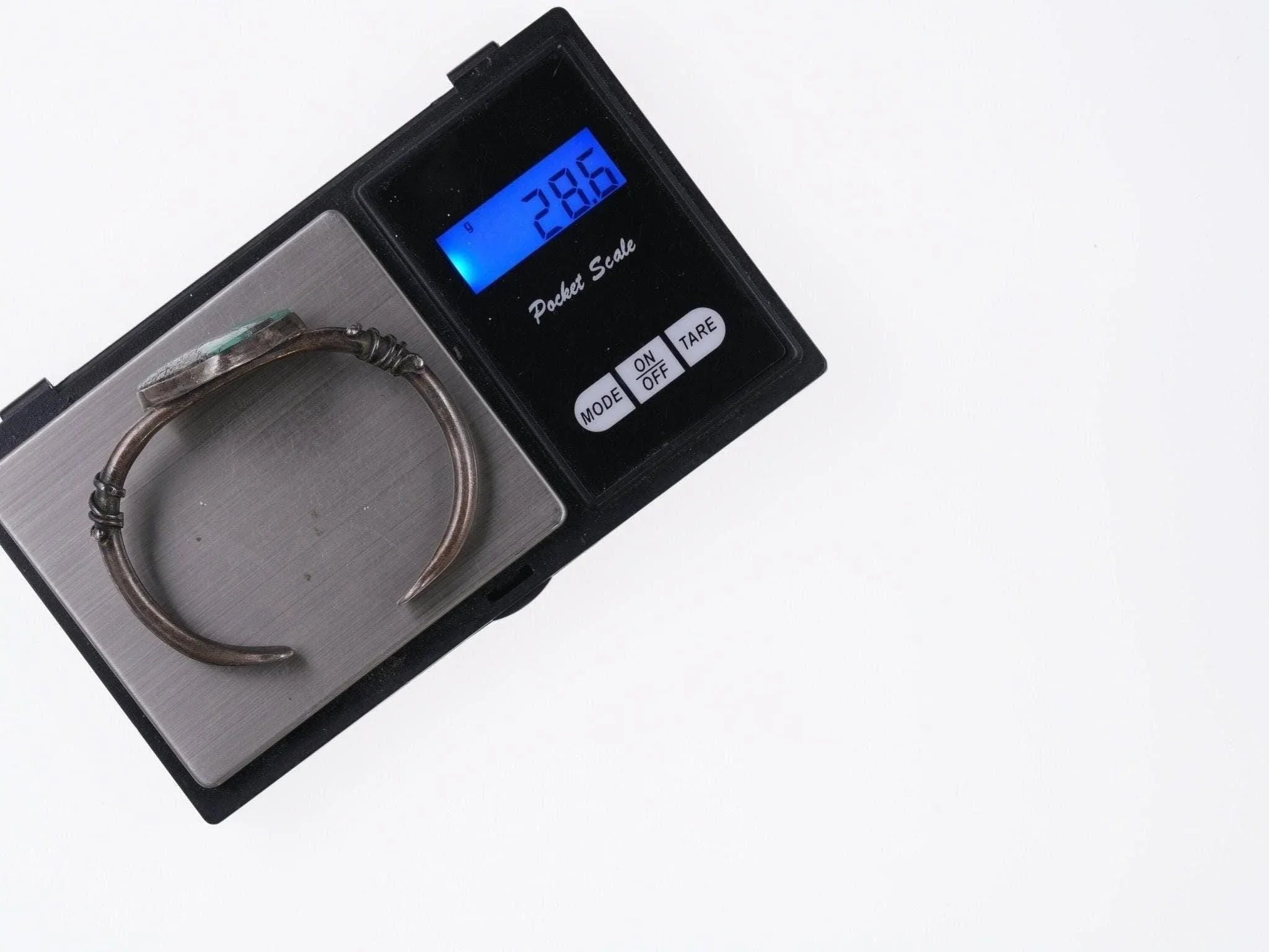6.25" Vintage Southwestern sterling and turquoise bracelet<br><br>All precious metals are tested and guaranteed, any Native American jewelry<br>referred to as Silver or Sterling is guaranteed to be a minimum of 90% (coin)<br>silver and possibly higher content. Anything marked is guaranteed to be what<br>it's marked, most bracelets are photographed on a 6" wrist (non hairy), rings<br>photographed on the appropriate sized finger when possible. With bracelets if<br>the measurement is not given in the description then inside circumference is<br>shown where the metal meets the number on the the cloth tape measure.