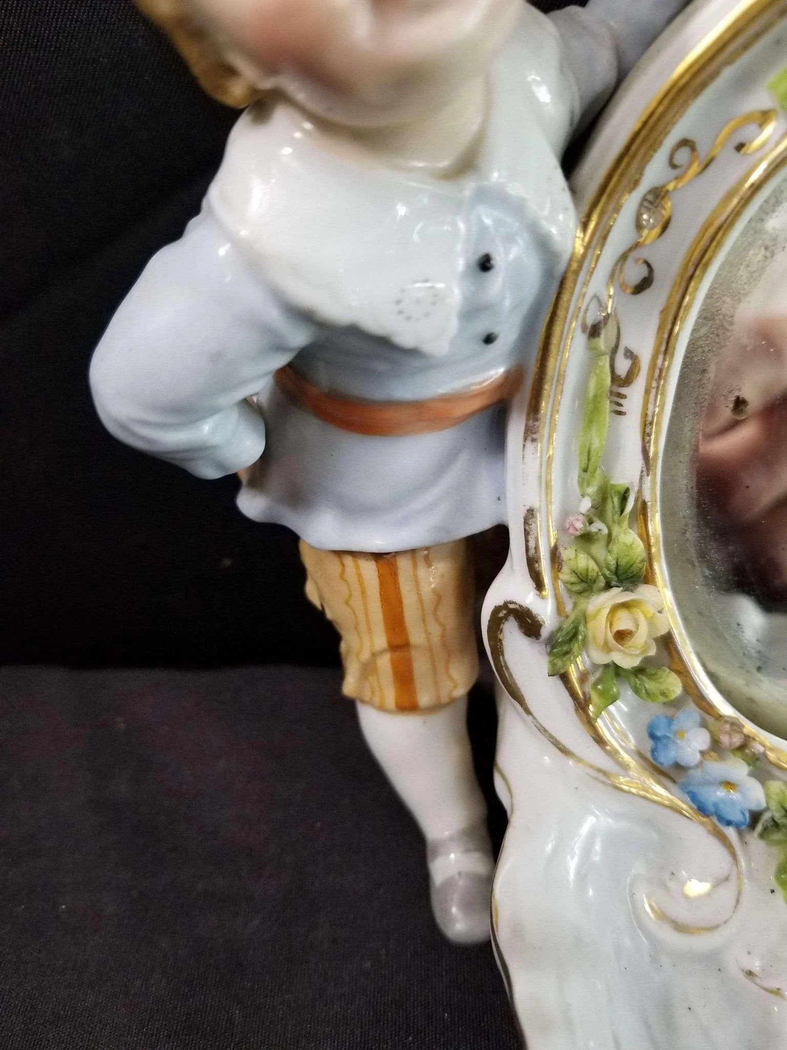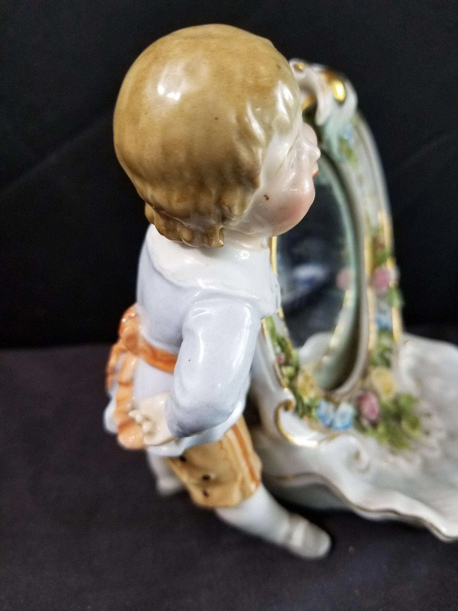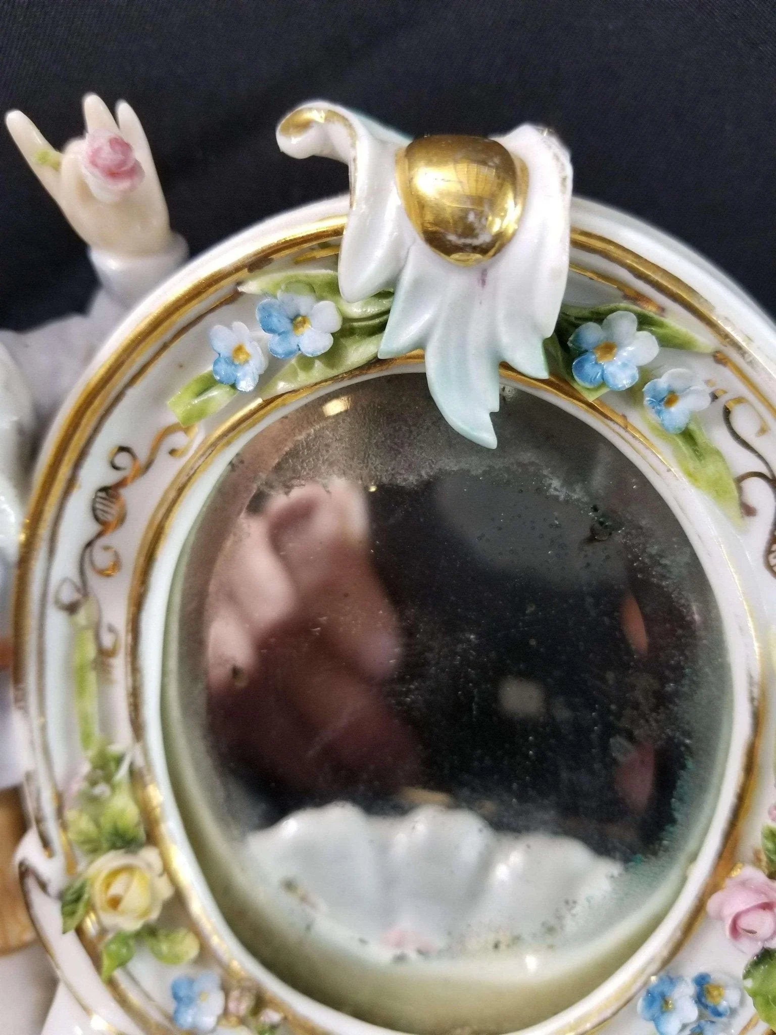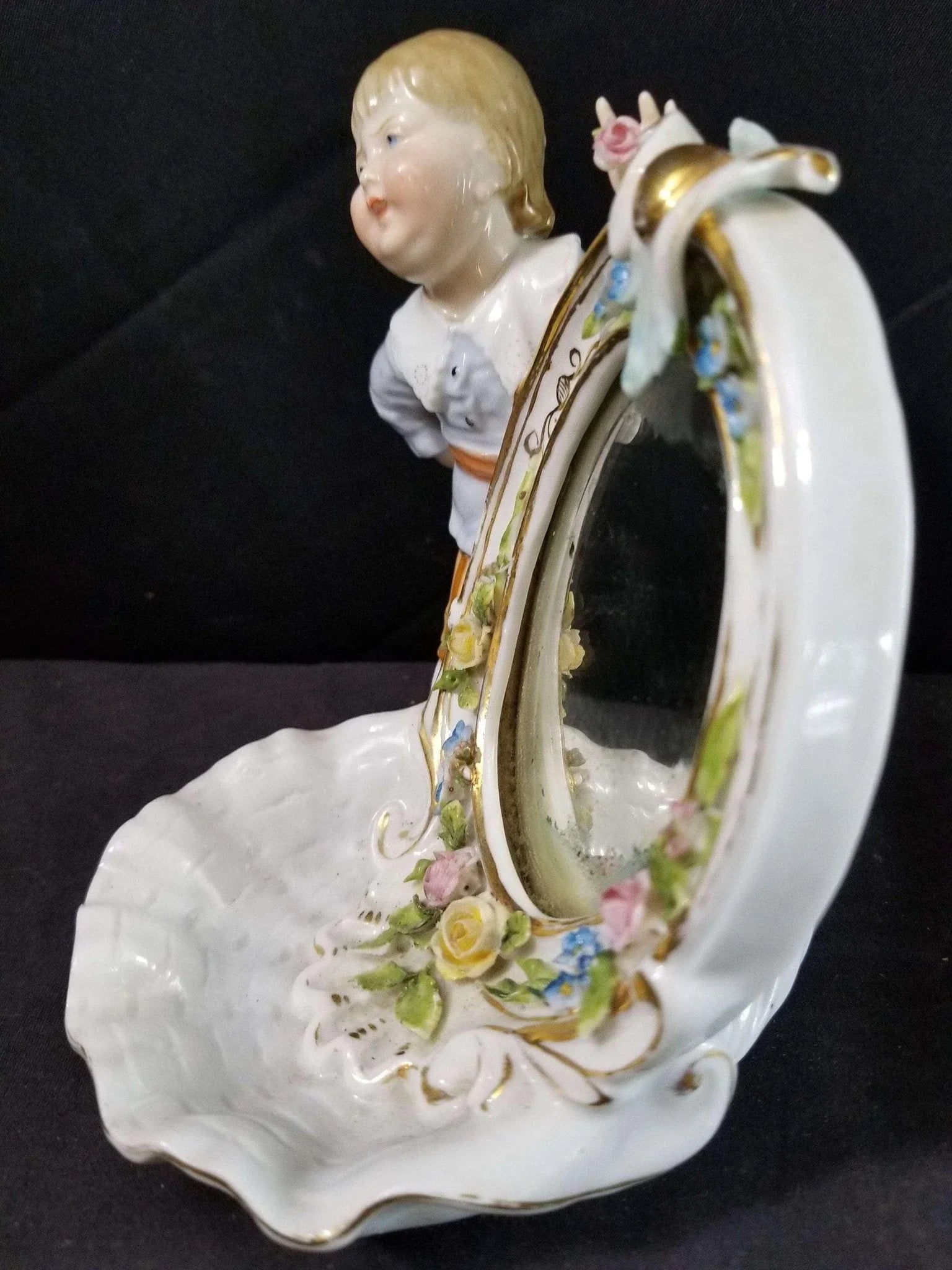 Dresden Porcelain Mirror With Boy Encrusted Flowers Ring Holder Whimsical 19th c