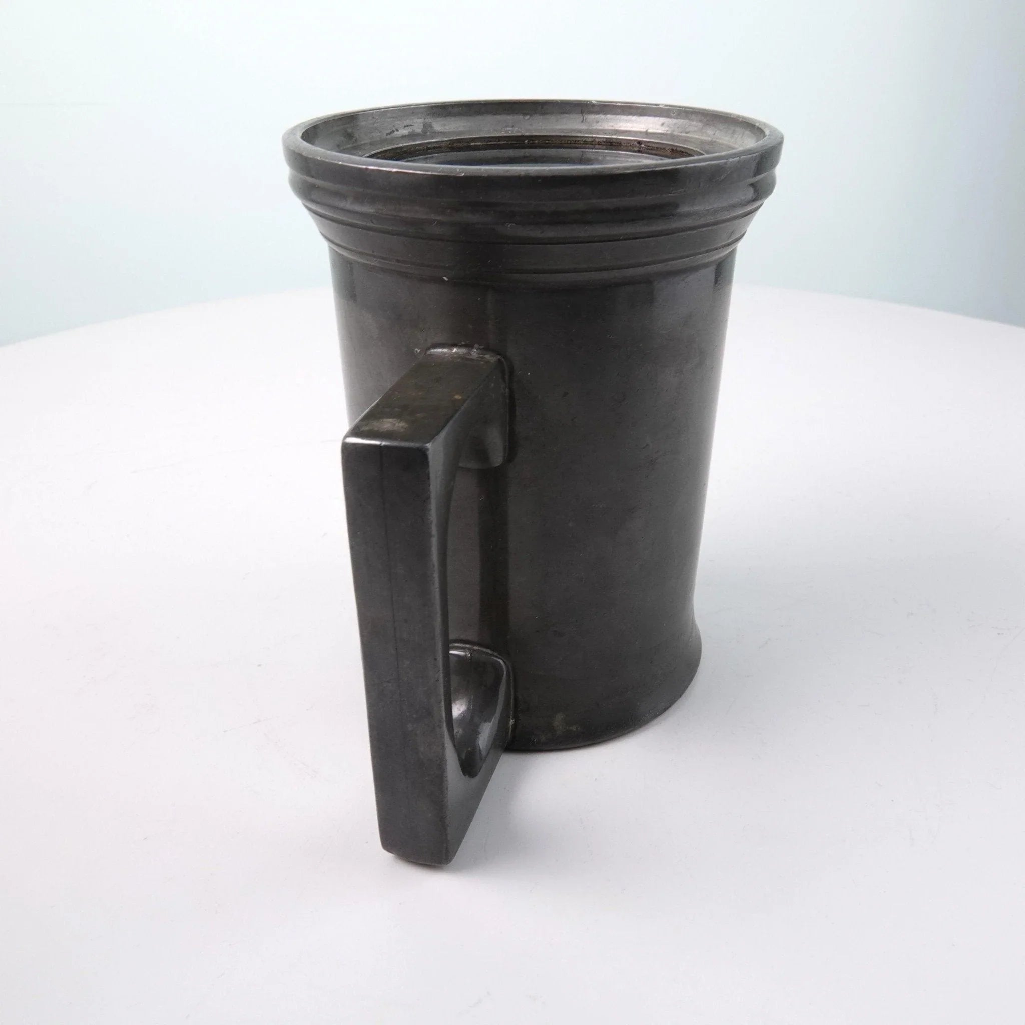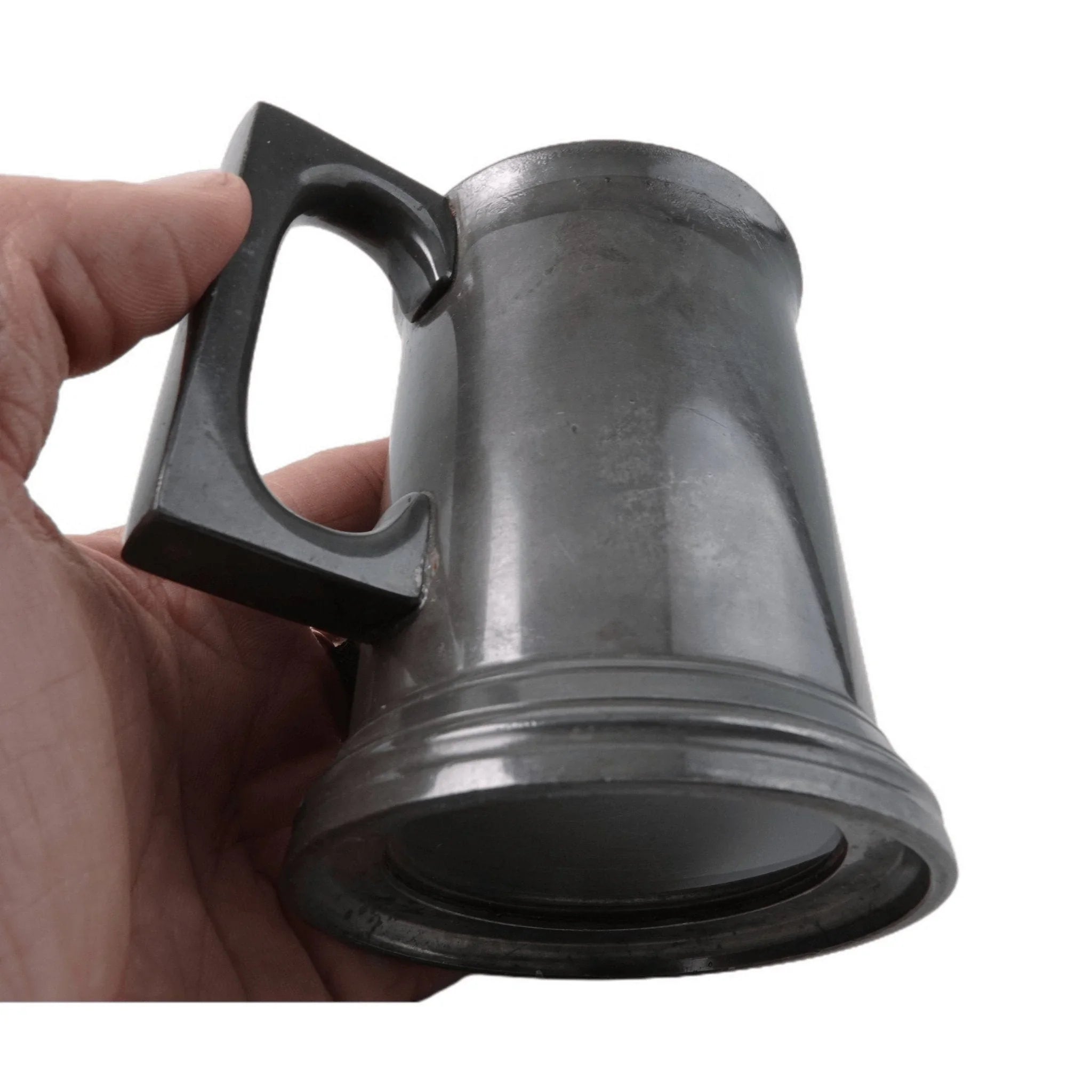 c1880 Glass Bottomed Pewter Tankard Half Pint by James Dixon. Exceptional patina, holds liquid. Some expected wear that has been naturally patinized over time. 4" tall. TW94