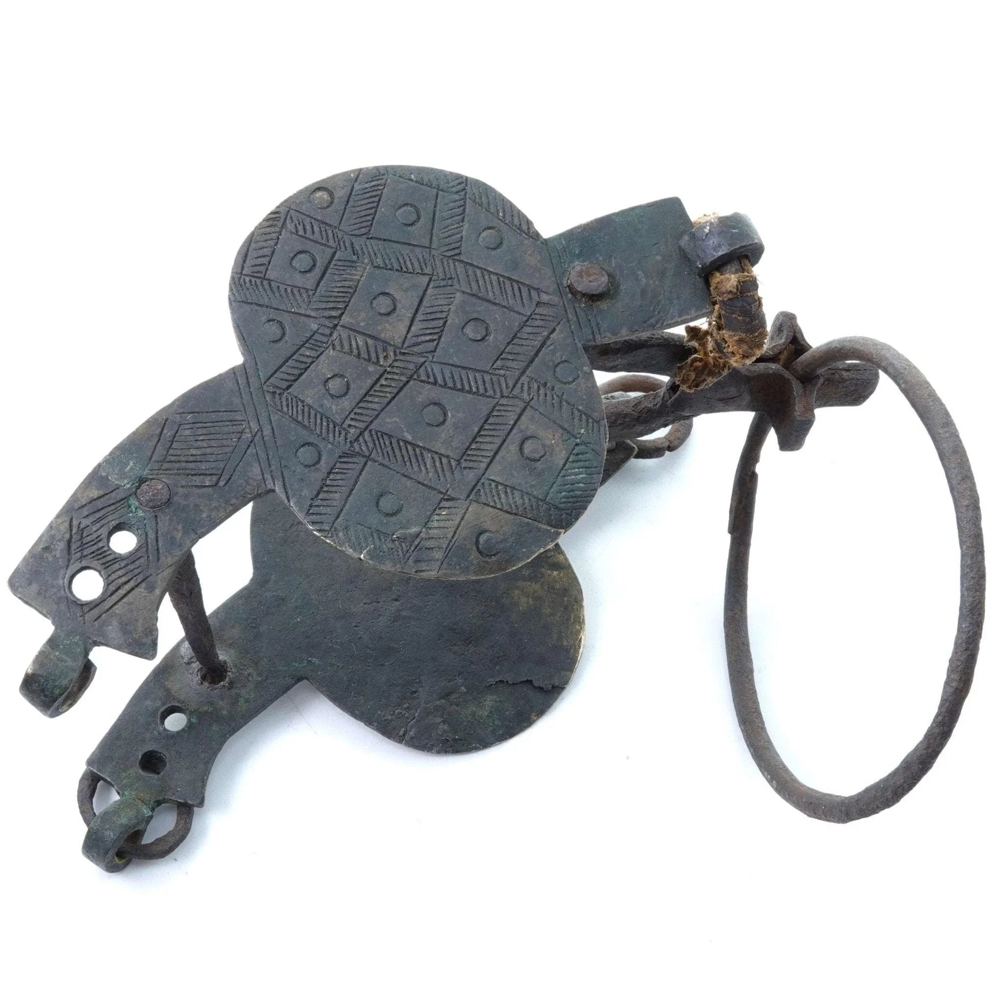 African Dogon/ Taureg brass and iron horse ring bit, early 19th c., with<br>engraved geometric designs, approx 12"h, 5"w, 3.5"d, 1.25lbs. Great no brainer<br>patina as shown, guaranteed authentic some small old cracks to brass as shown.<br>B12
