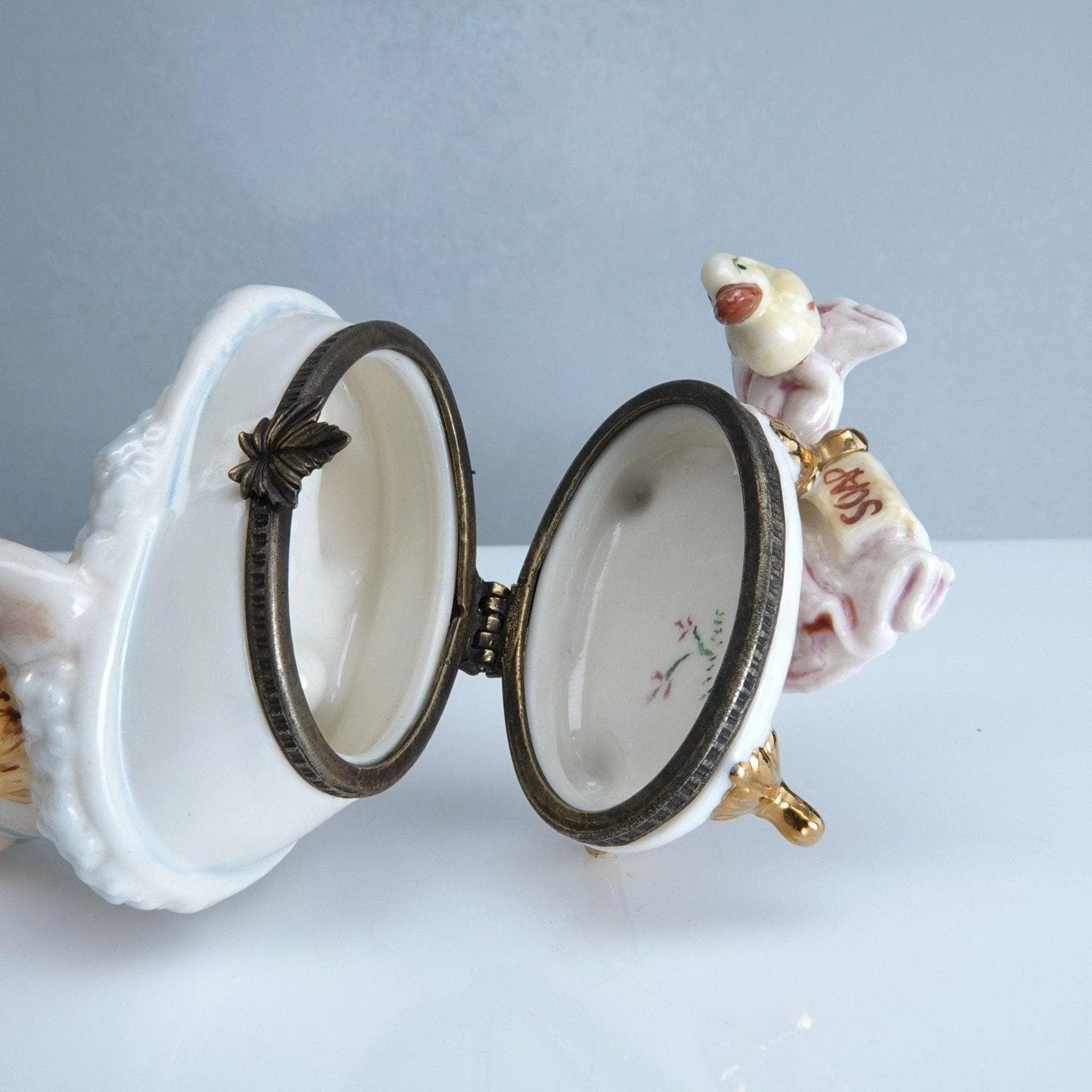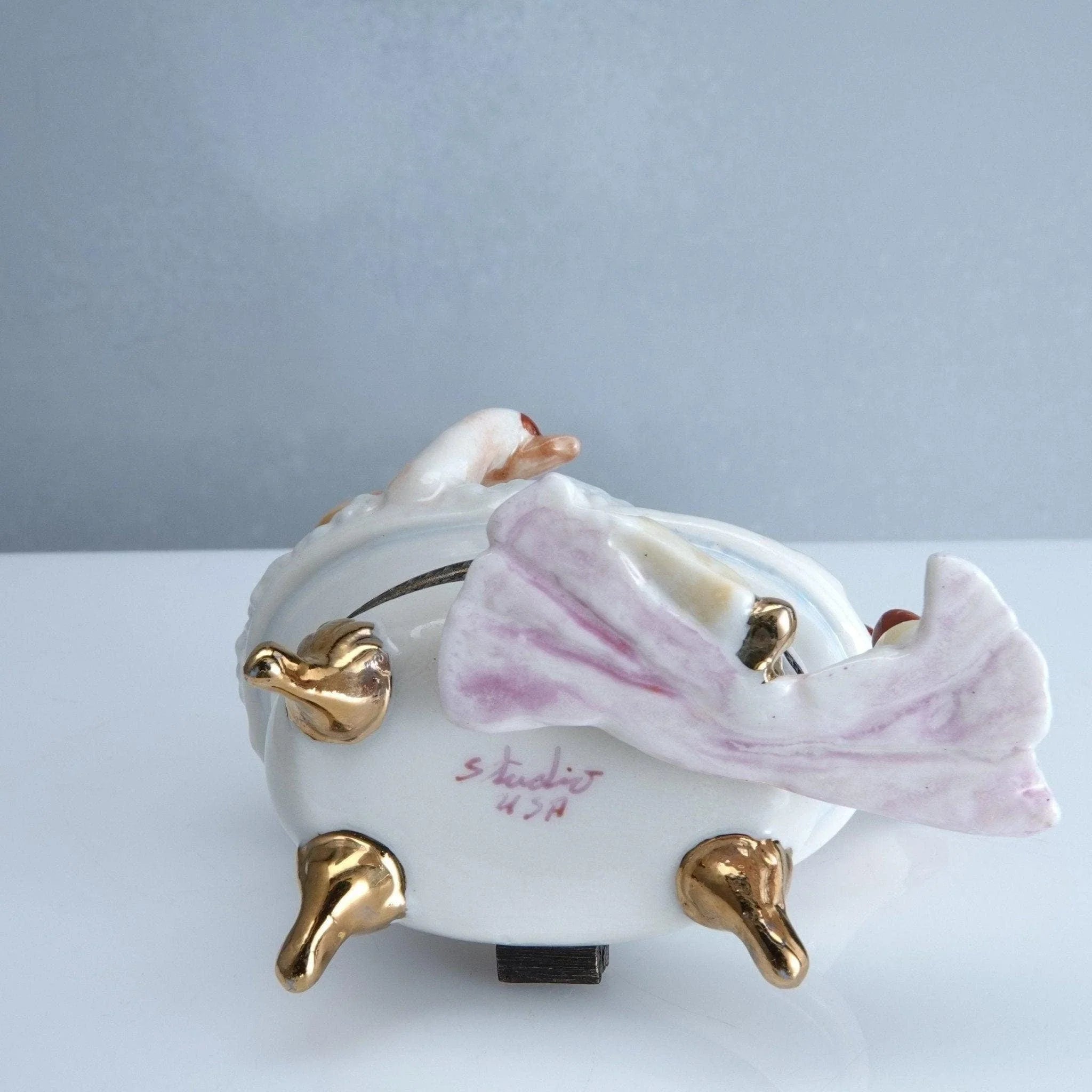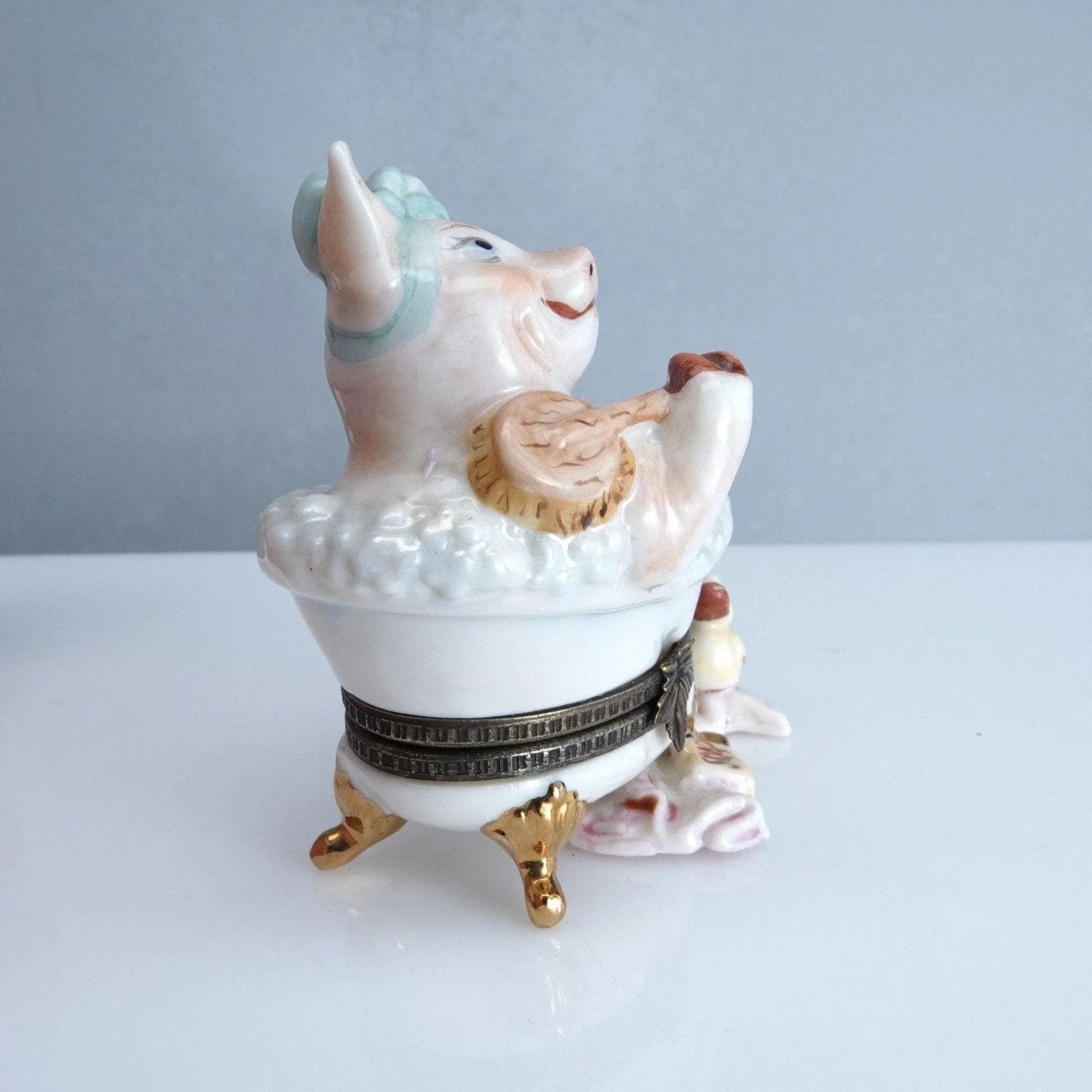 1990's Studio USA Pig in a bathtub Trinket Box Hand Painted 2 7/8" tall with no<br>damage whatsoever. Nice tight fitting lid with nice tight hinge.<br>This piece was made by Studio USA - a company that made quality porcelain boxes<br>in the USA. They were of the same quality and prices as the Limoges Boxes from<br>France. They made very high quality boxes circa 1990's. I will be adding a nice<br>little collection of them to my store at a fraction of what they cost 25 years<br>ago and they are all in mint condition have been stored in a china cabinet for<br>25 years.<br>TW52