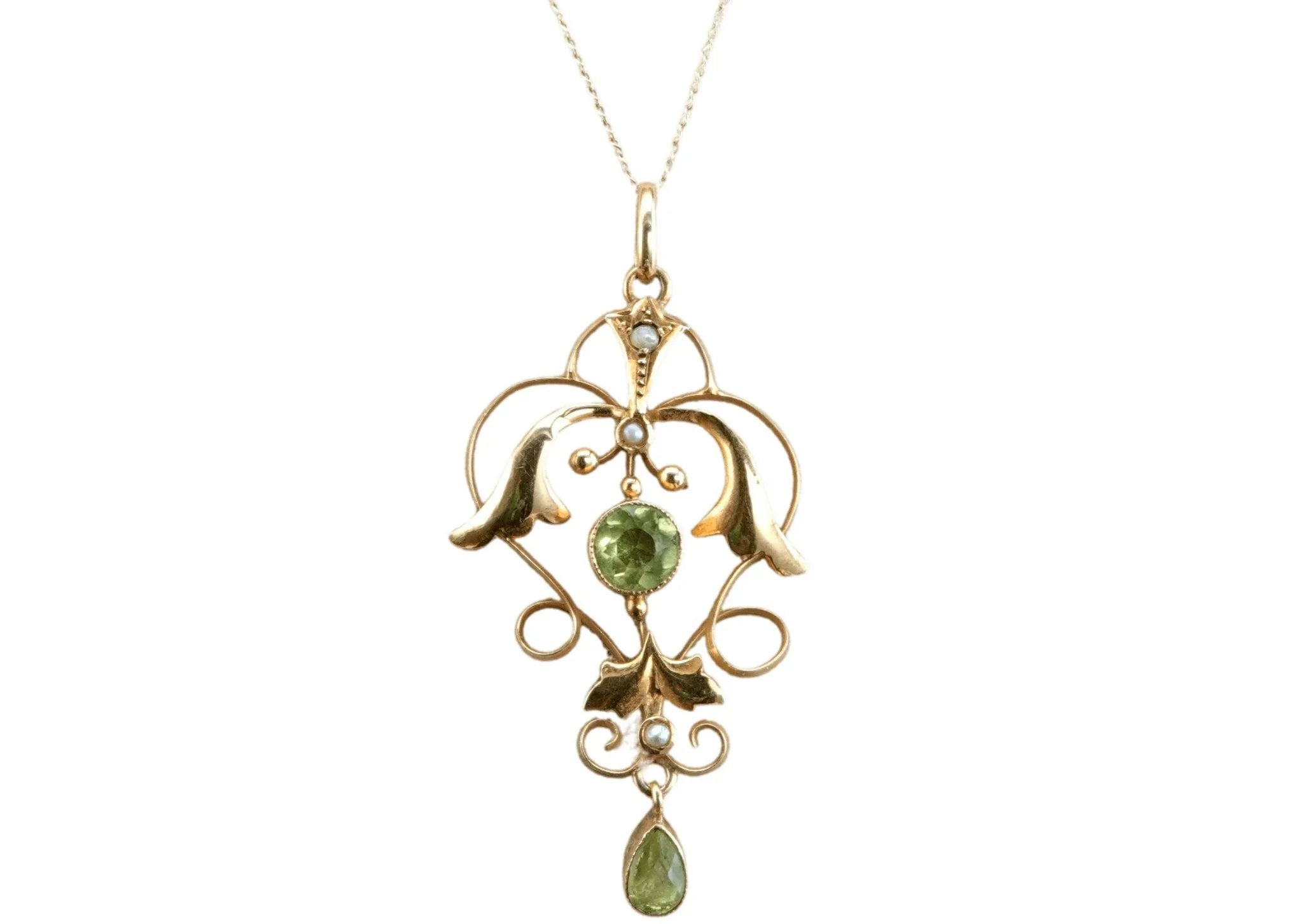 c1900 9ct Gold Edwardian Natural Pearl/Peridot Lavaliere Pendant on 14K gold nec