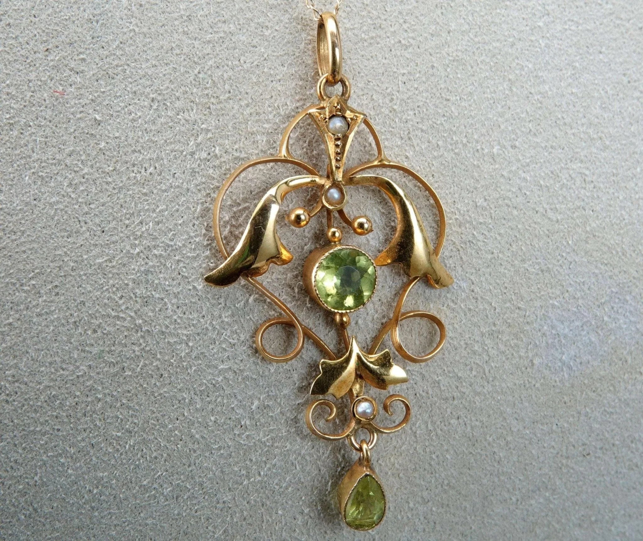 c1900 9ct Gold Edwardian Natural Pearl/Peridot Lavaliere Pendant on 14K gold necklace. The pendant is c1899, the necklace is later. Both are gold, marked and tested. Selling both. 18" necklace 1.75" long pendant. 2.4 grams.
