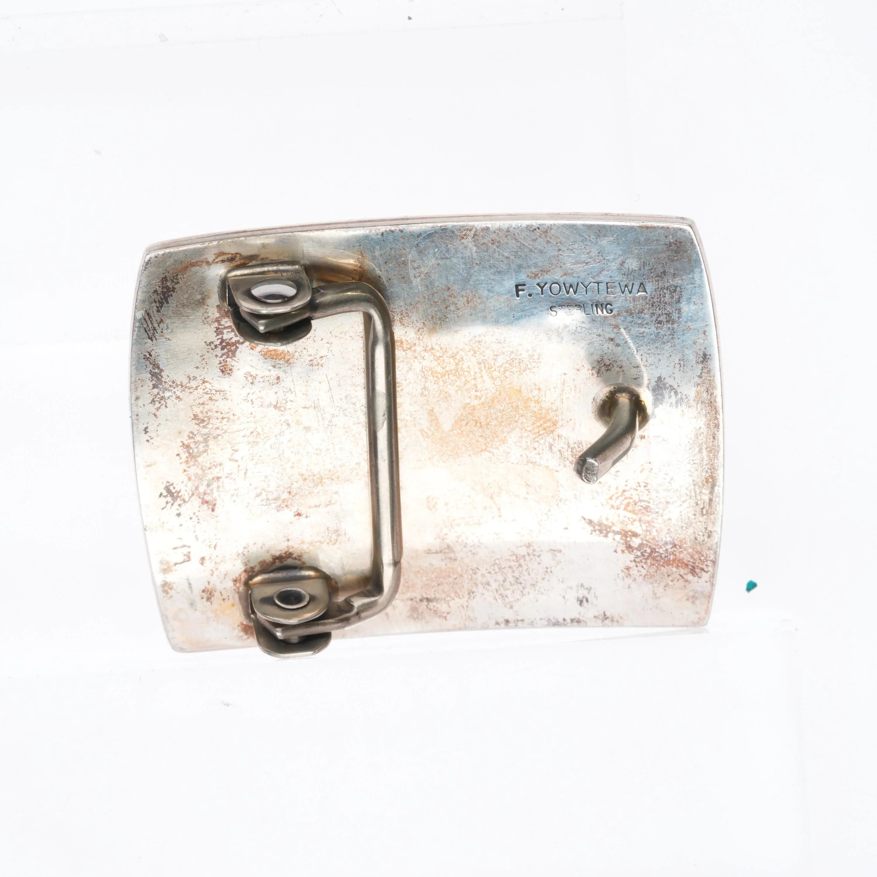 Faron Yowytewa Hopi Overlay Kokopelli belt buckle sterling silver. Tested and guaranteed solid sterling silver. Fits up to a 1" wide belt. Some expected wear, marked as shown with the artists hallmark. Good condition, functional. Circa last quarter of the 20th century.