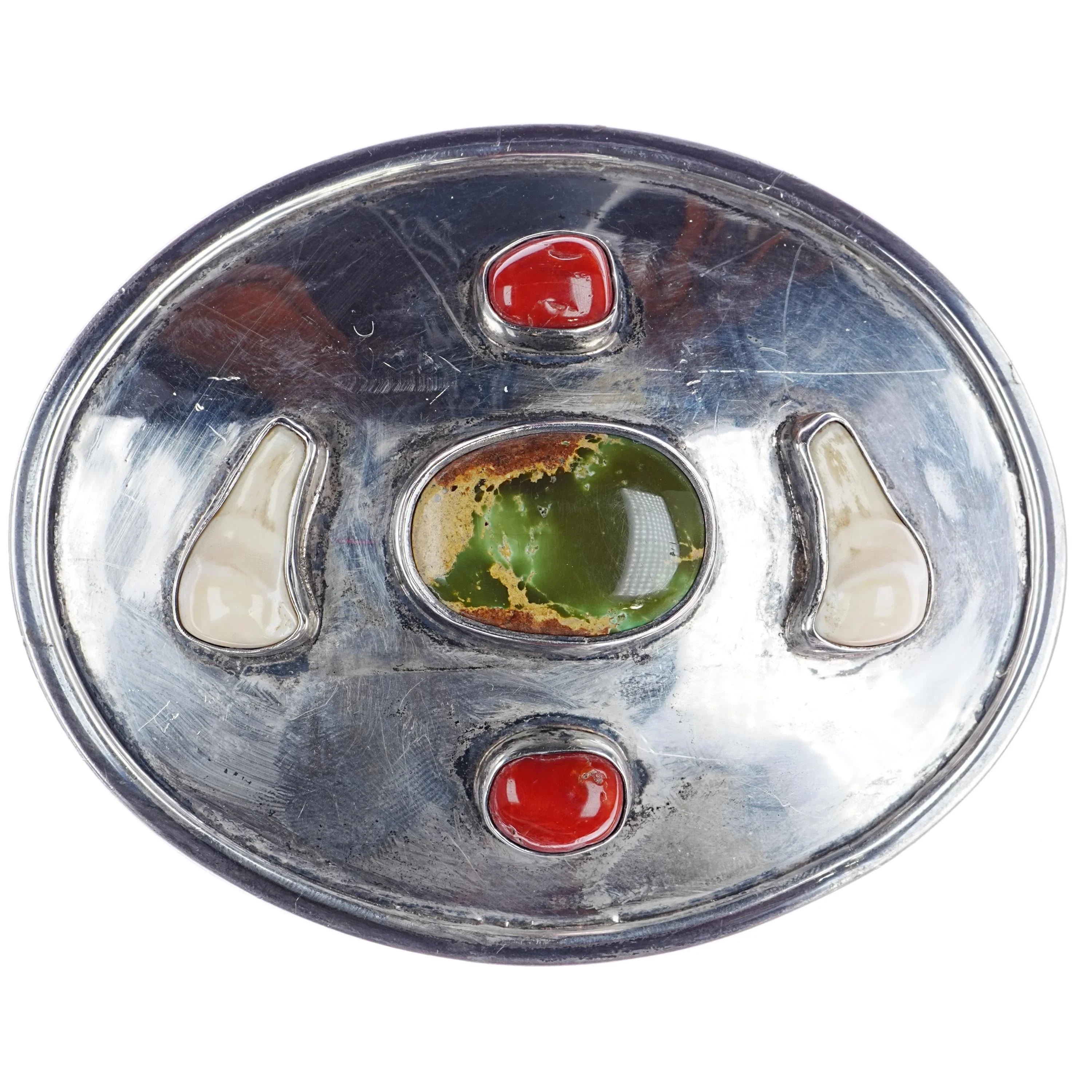 Huge Sterling silver high grade turquoise, coral, fossil belt buckle. Solid sterling silver with weight and other measurements in the pictures. Unmarked, circa 60‘s-70‘s. This likely had a different belt loop and possibly it broke and they soldered this rotating buckle design on the back which is really cool and evidently worked. The added buckle is marked 925 and solid sterling silver. All the metal is sterling silver and very heavy.