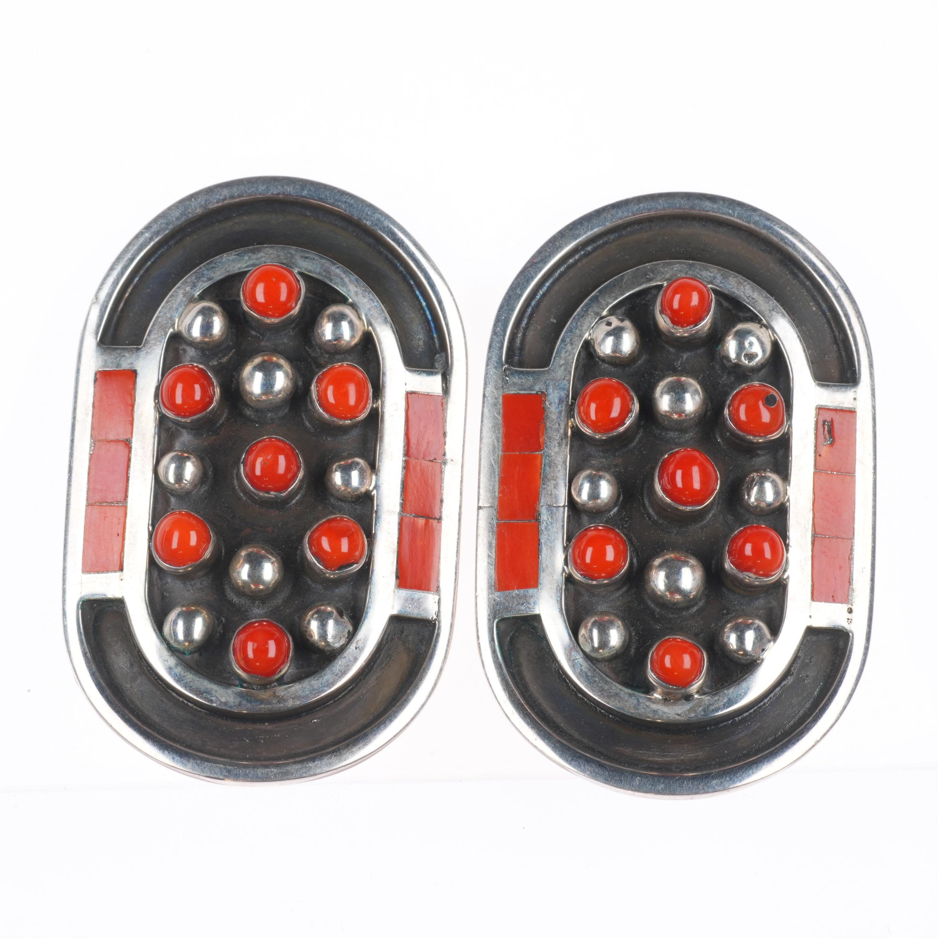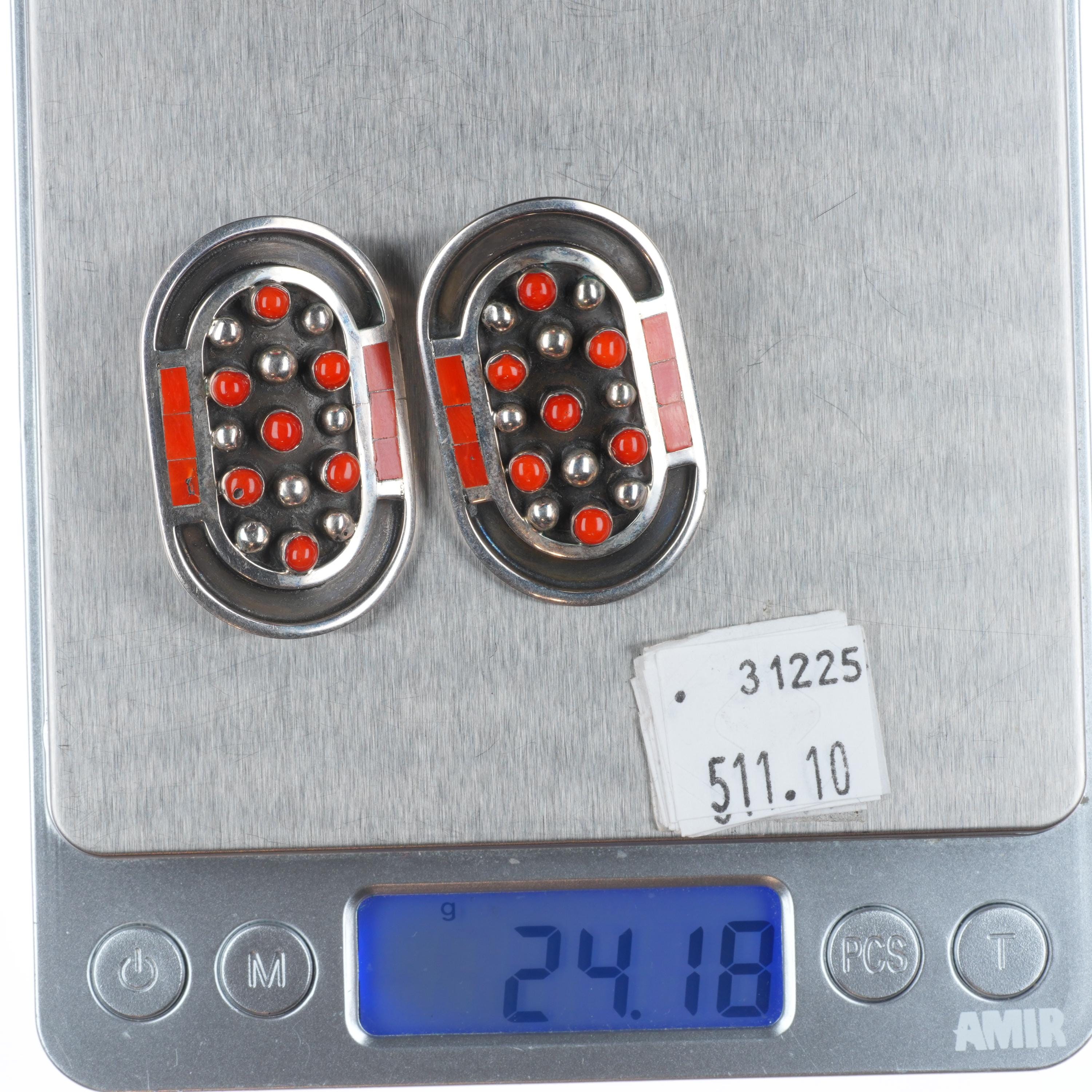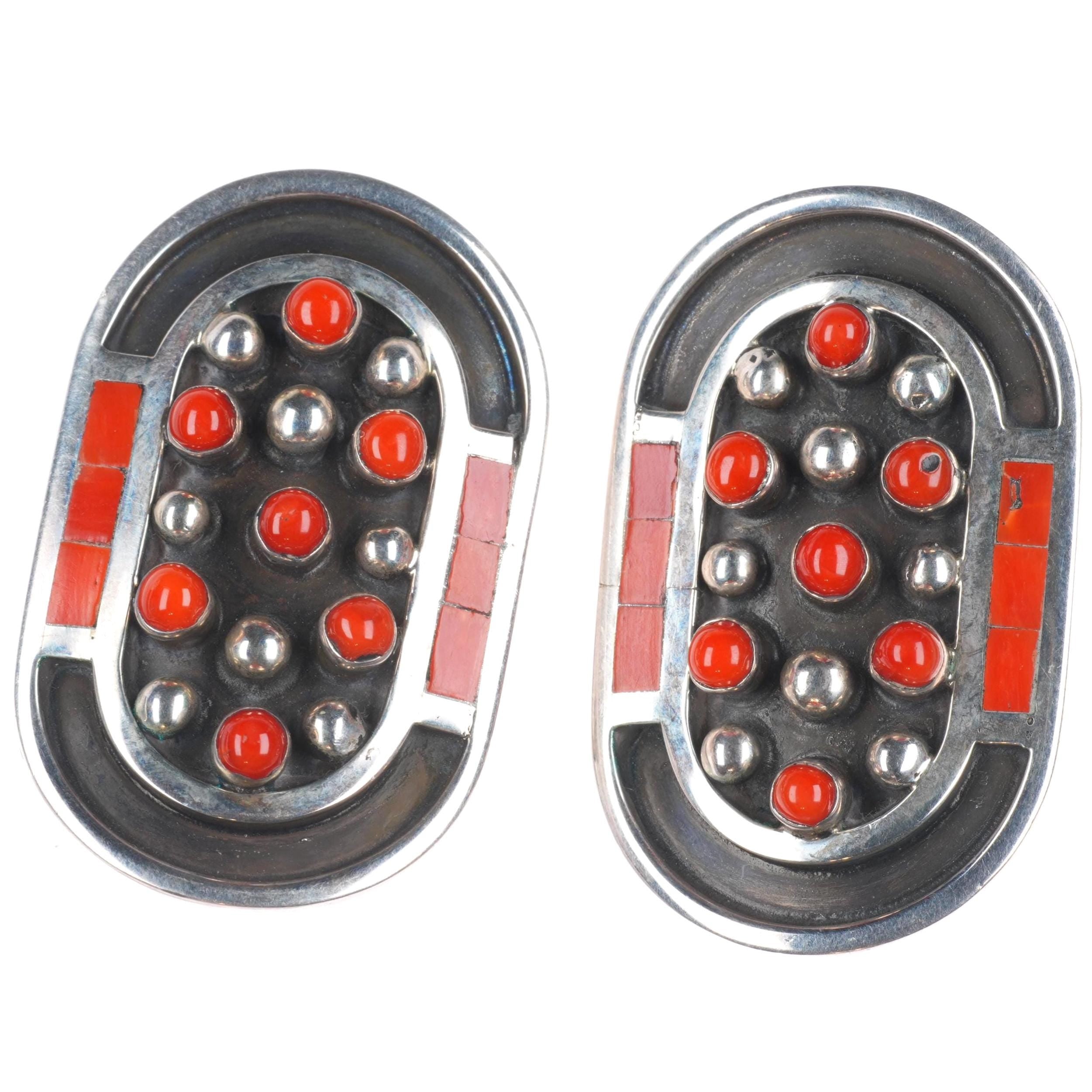 Jobeth Mayes Zuni sterling silver mediterranean coral snake eye/inlay earrings Great earrings, tested and guaranteed solid sterling silver with weight, and measurements will be shown in the pictures. Circa third quarter of the 20th century. Clip on earrings as shown. Strong springs on clips.