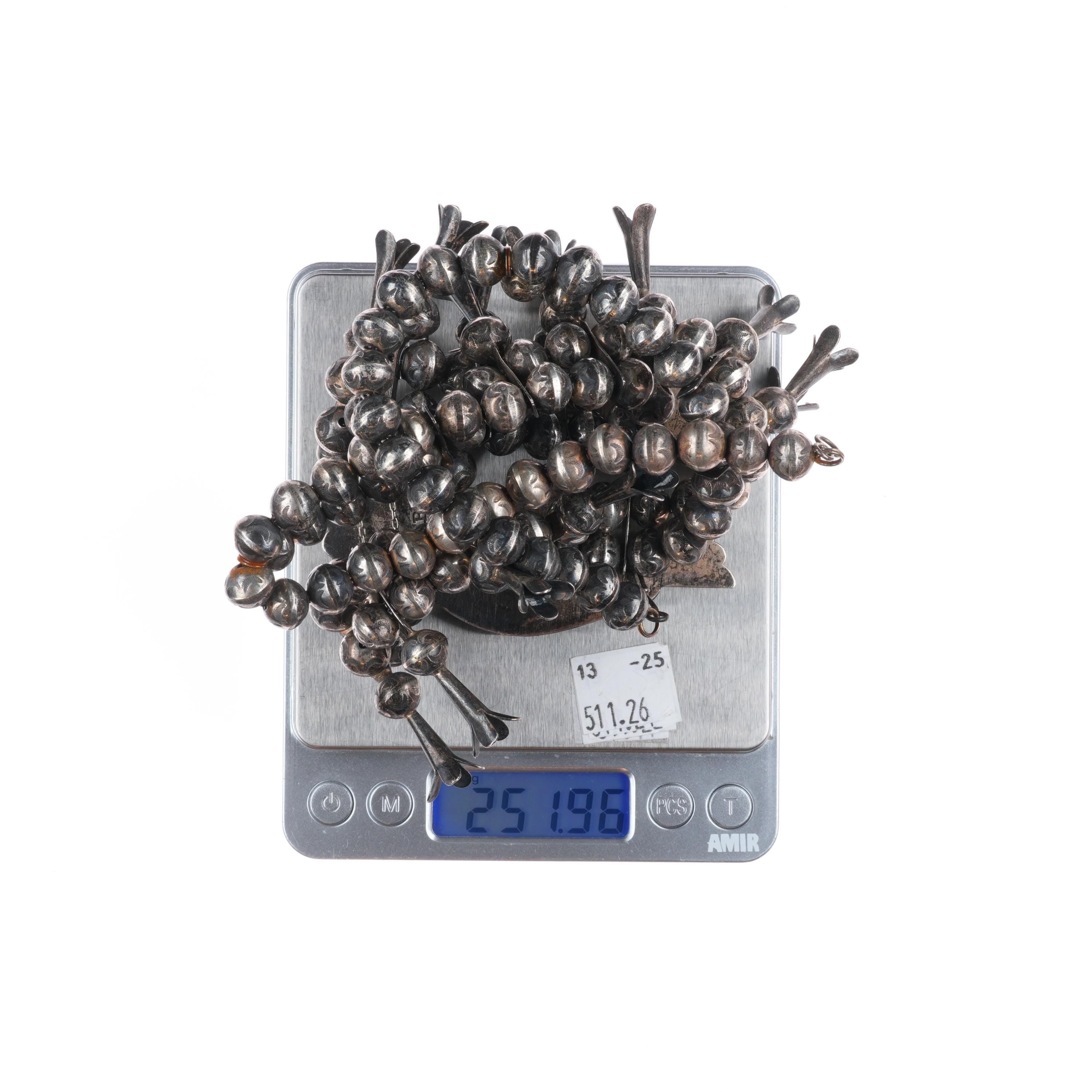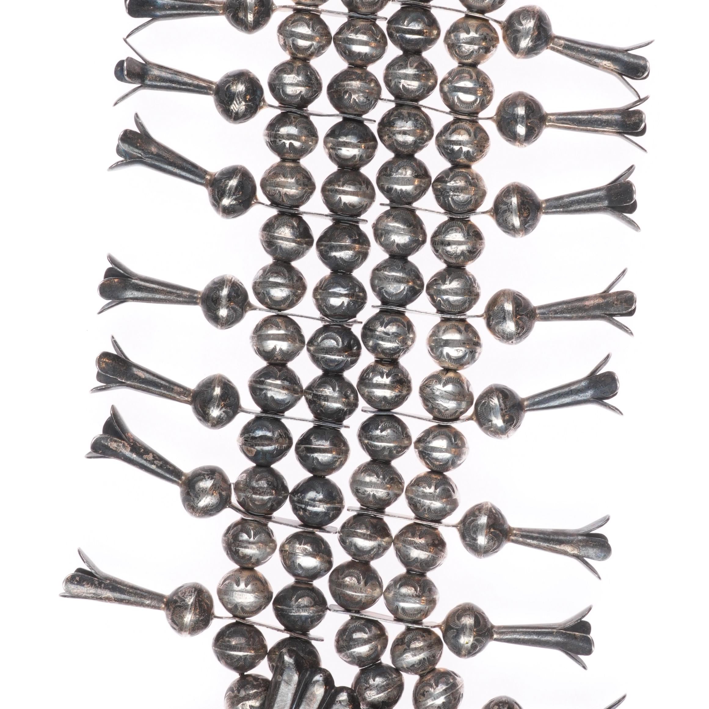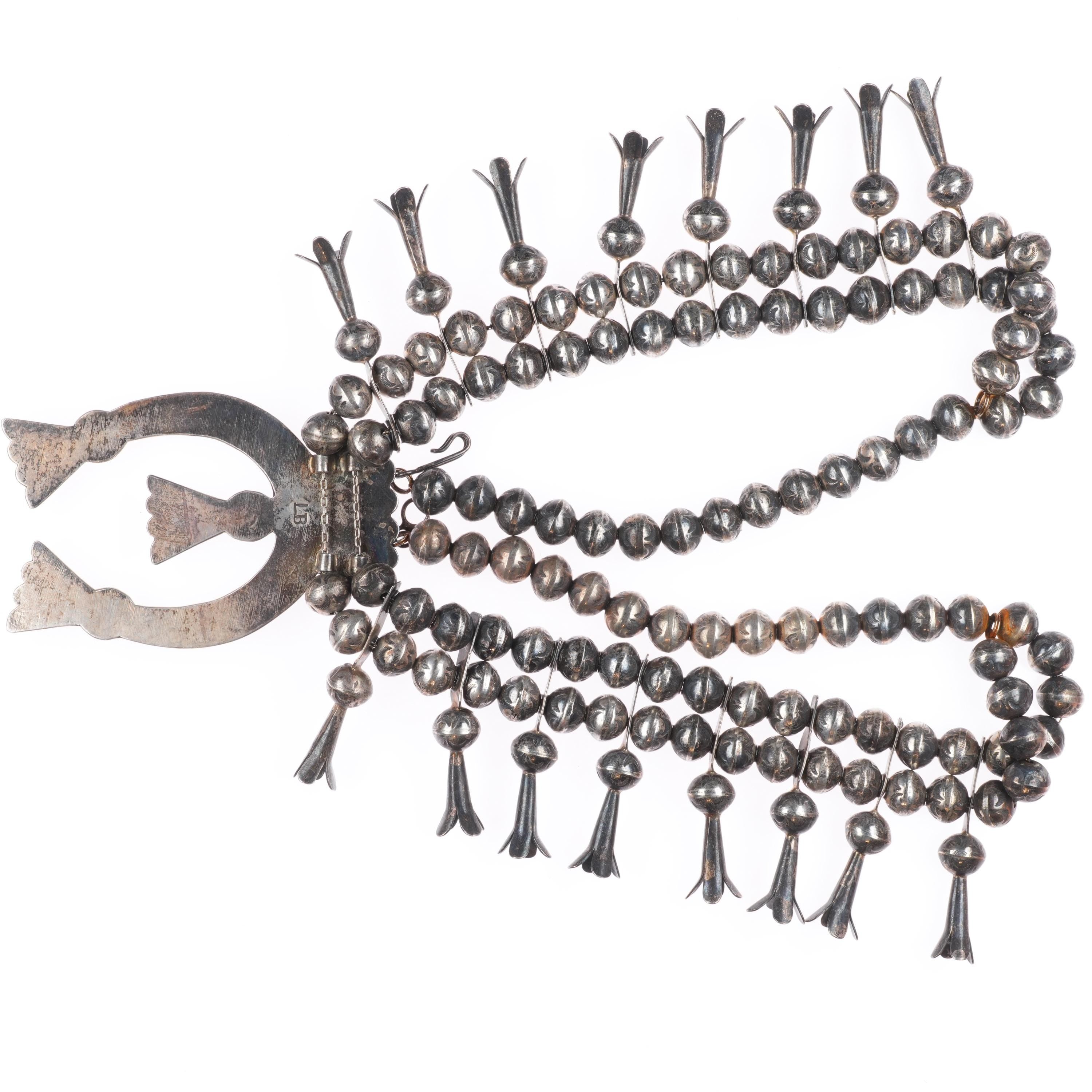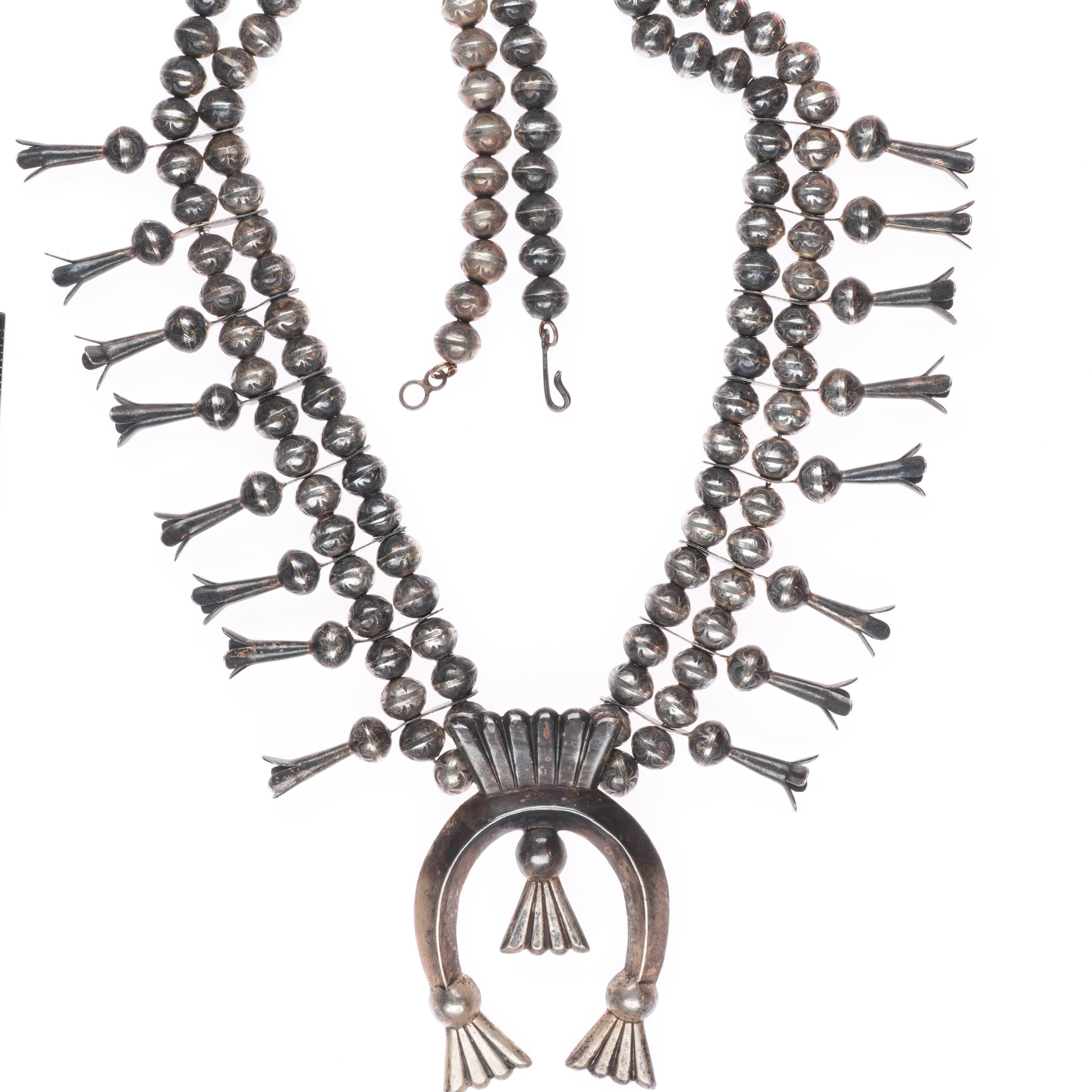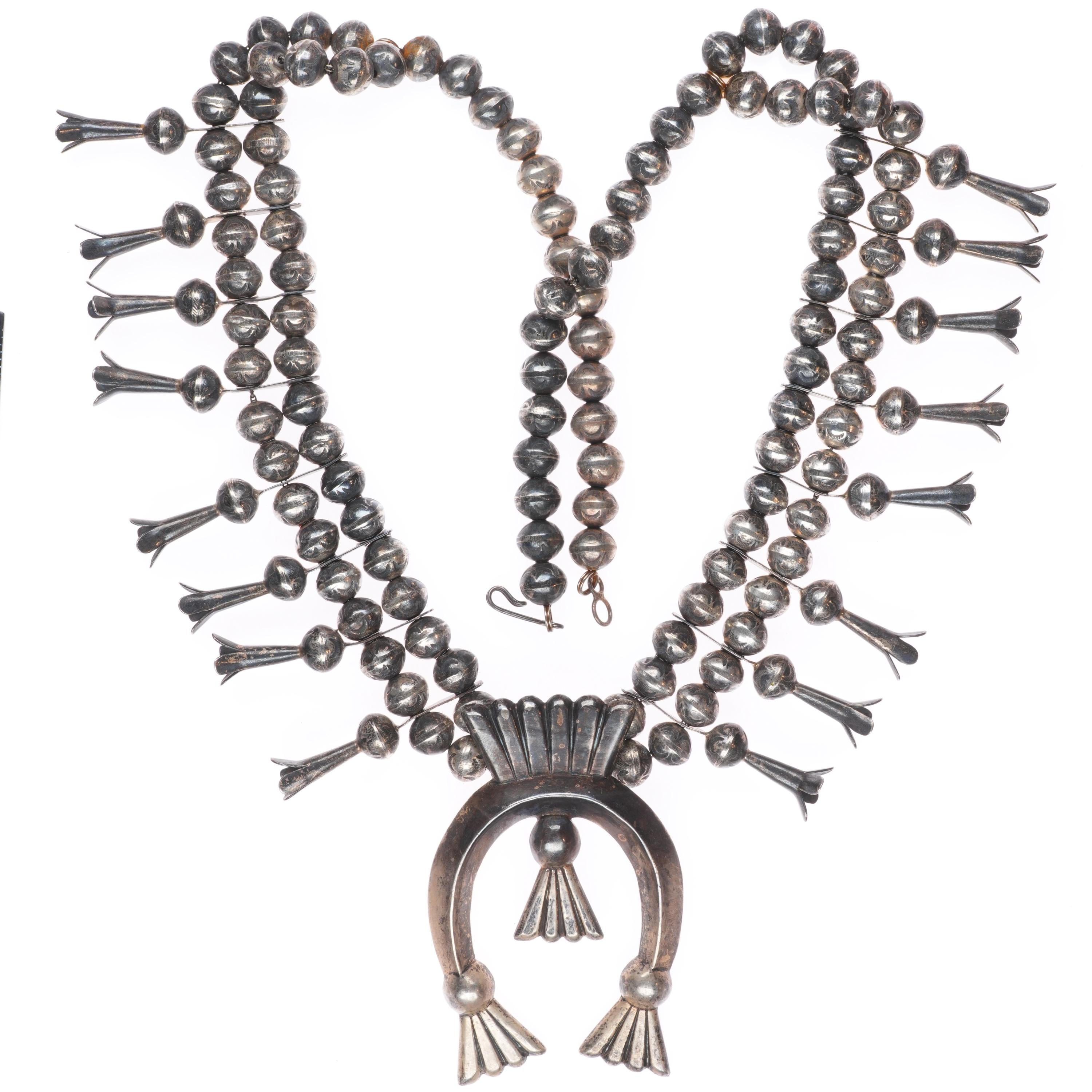 L Burnside Navajo vintage sterling silver stamped beads squash blossom necklace