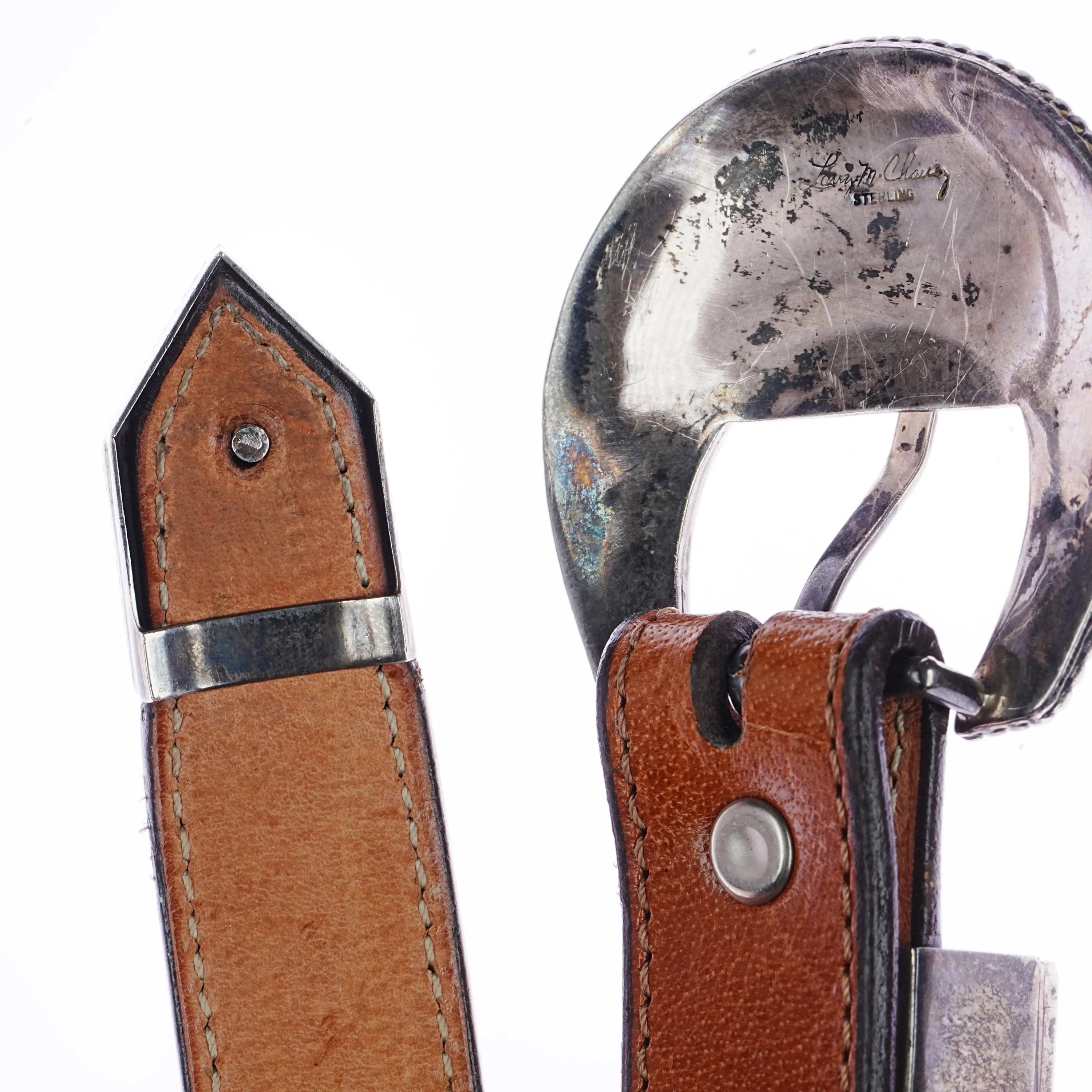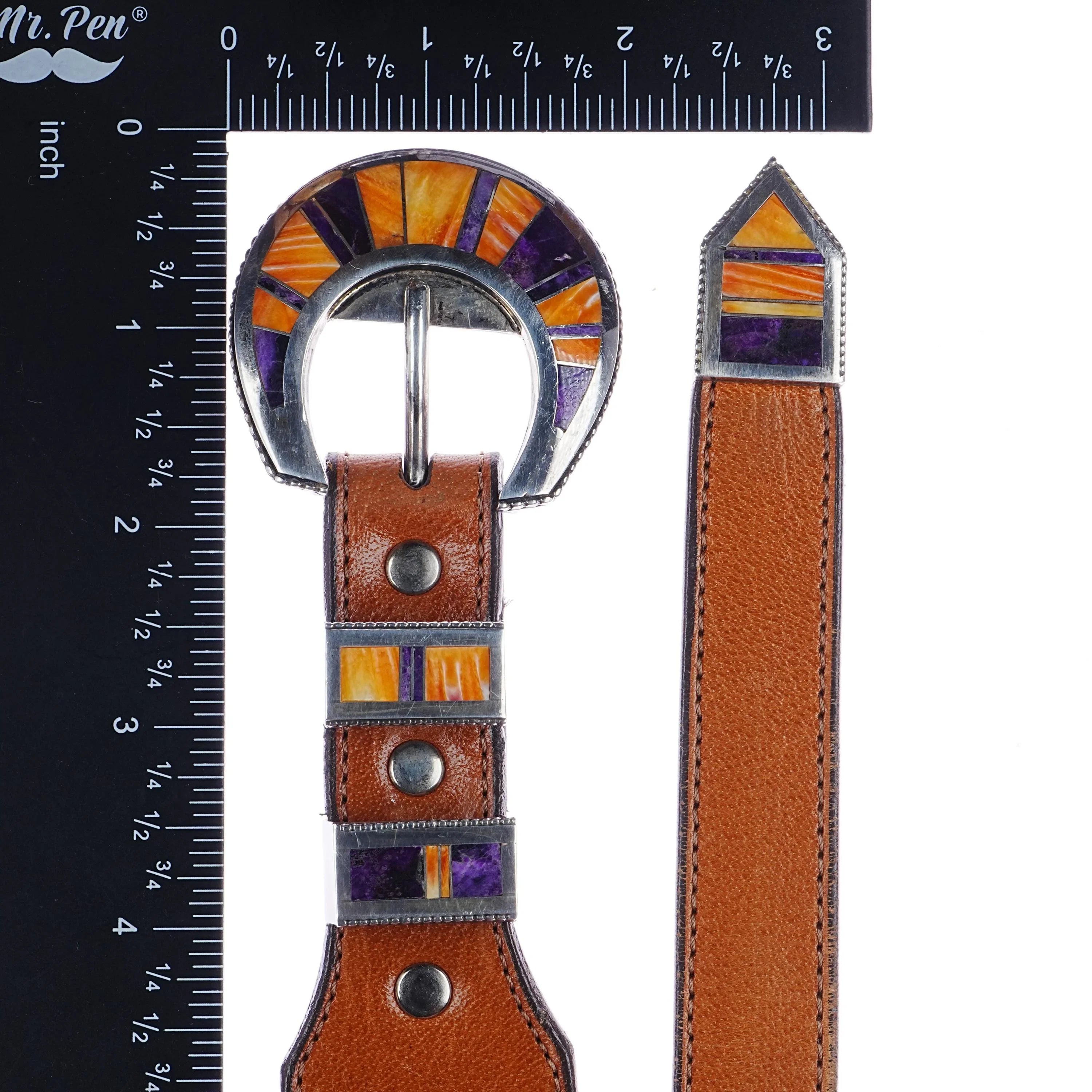 Larry Martinez Chavez Navajo Sterling Sugilite, spiny oyster ranger belt buckle. This is on a 1.5" belt that tapers down to 3/4" for the buckle/keepers/tip, the center hole is 34" and two on each side, more could be added, belt is high quality and in good condition and it is free with the very heavy solid sterling silver, Buckle, keeper, and tip that I am selling. Weights and measurements are in the pictures.