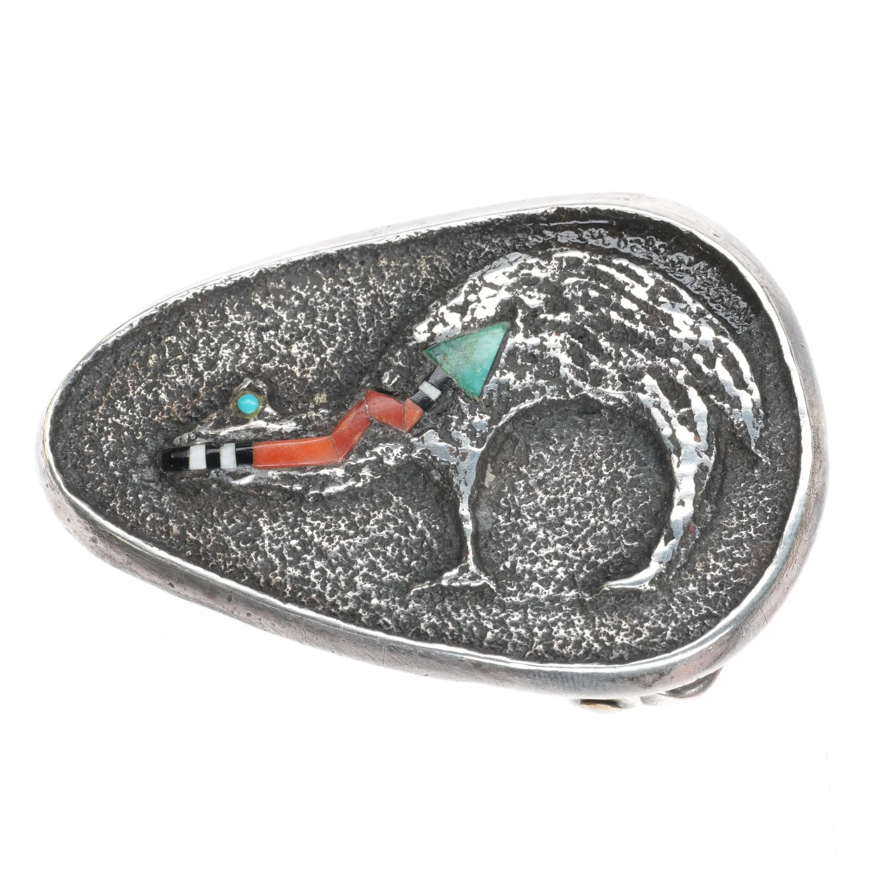 Preston Monongye Hopi Sterling silver turquoise coral bear tufa cast belt buckle