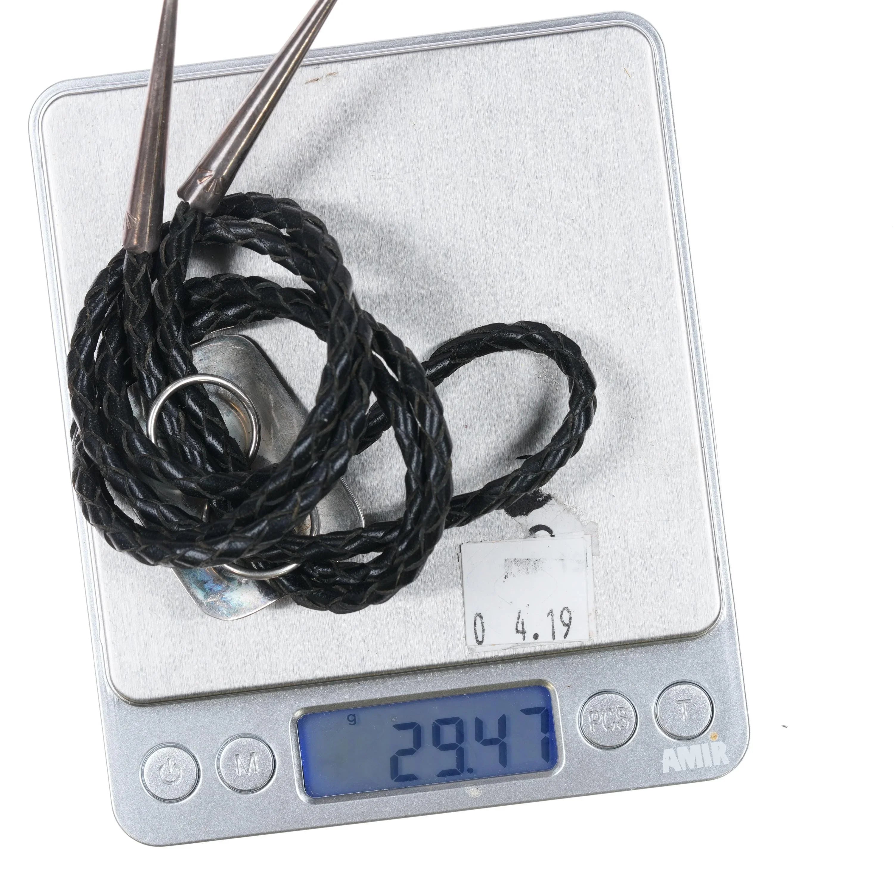 Southwestern Santo Domingo inlay turquoise/spiny oyster sterling silver bolo tie. Solid sterling silver slide and tips. Weight and measurements in pics. 39" long. Expected wear with no apparent damage. Weight shown is just the entire bolo, if there is a tray pictured it will be tared out of course. Unmarked.