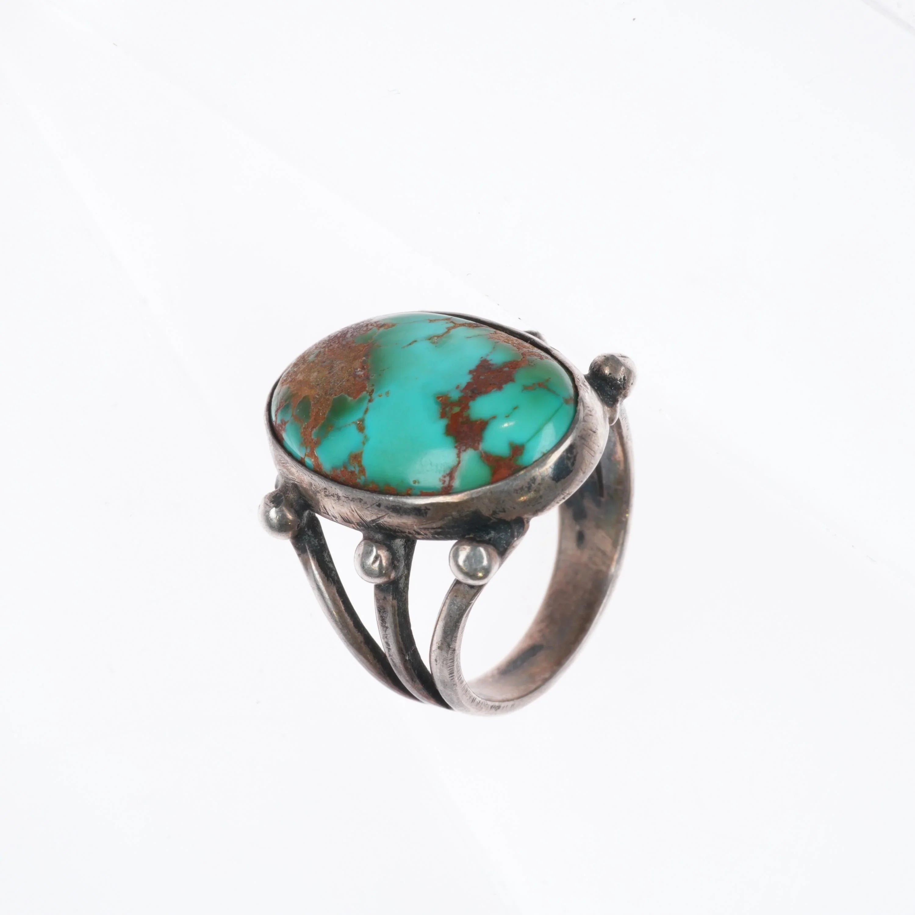 sz5 c1930‘s Navajo sterling silver 3 stone stoplight turquoise row ring. Great looking ring from the second quarter of the 20th century. Tested and guaranteed solid sterling silver with no issues unless some are already stated previously in the description. Some wear/tiny holes to beads on sides.