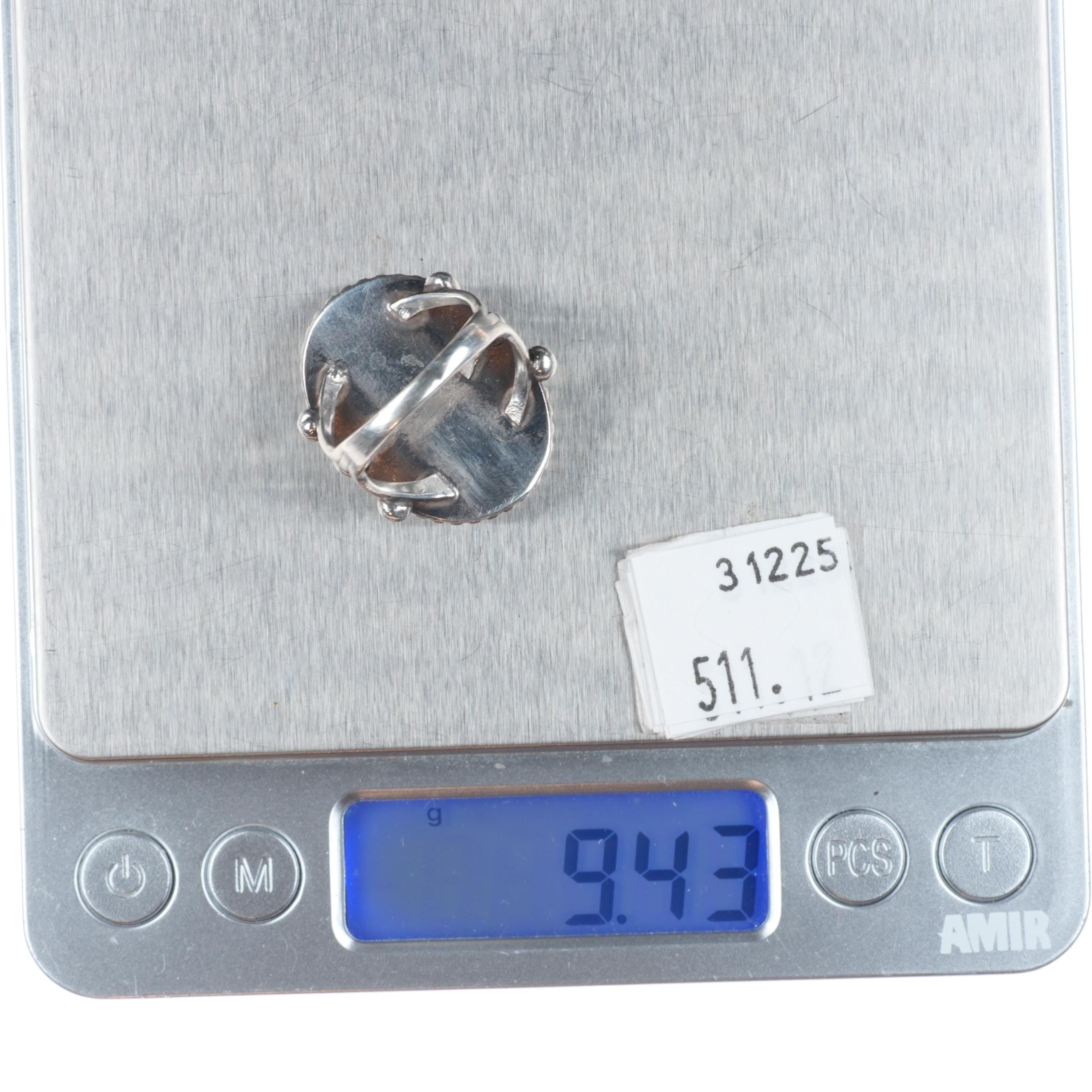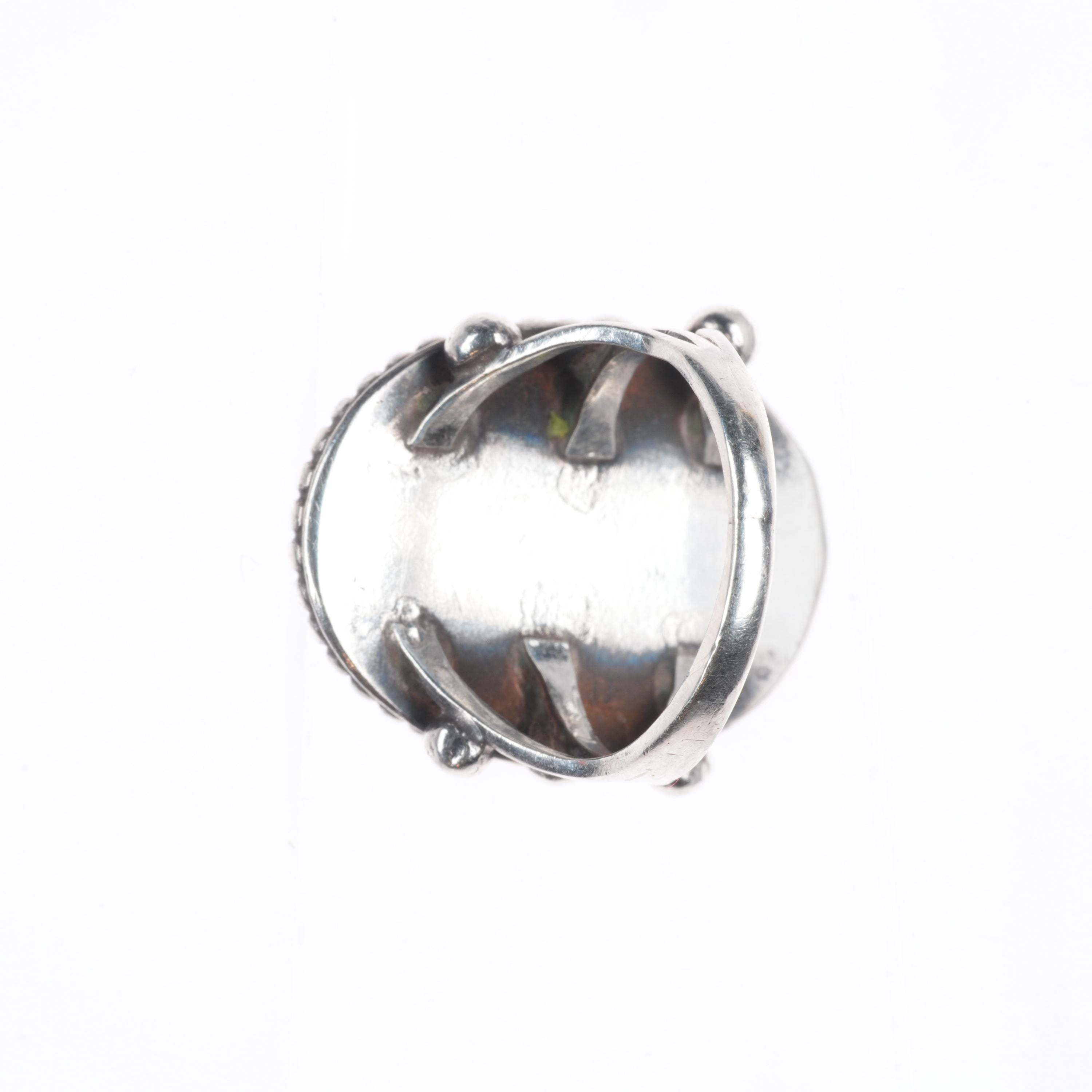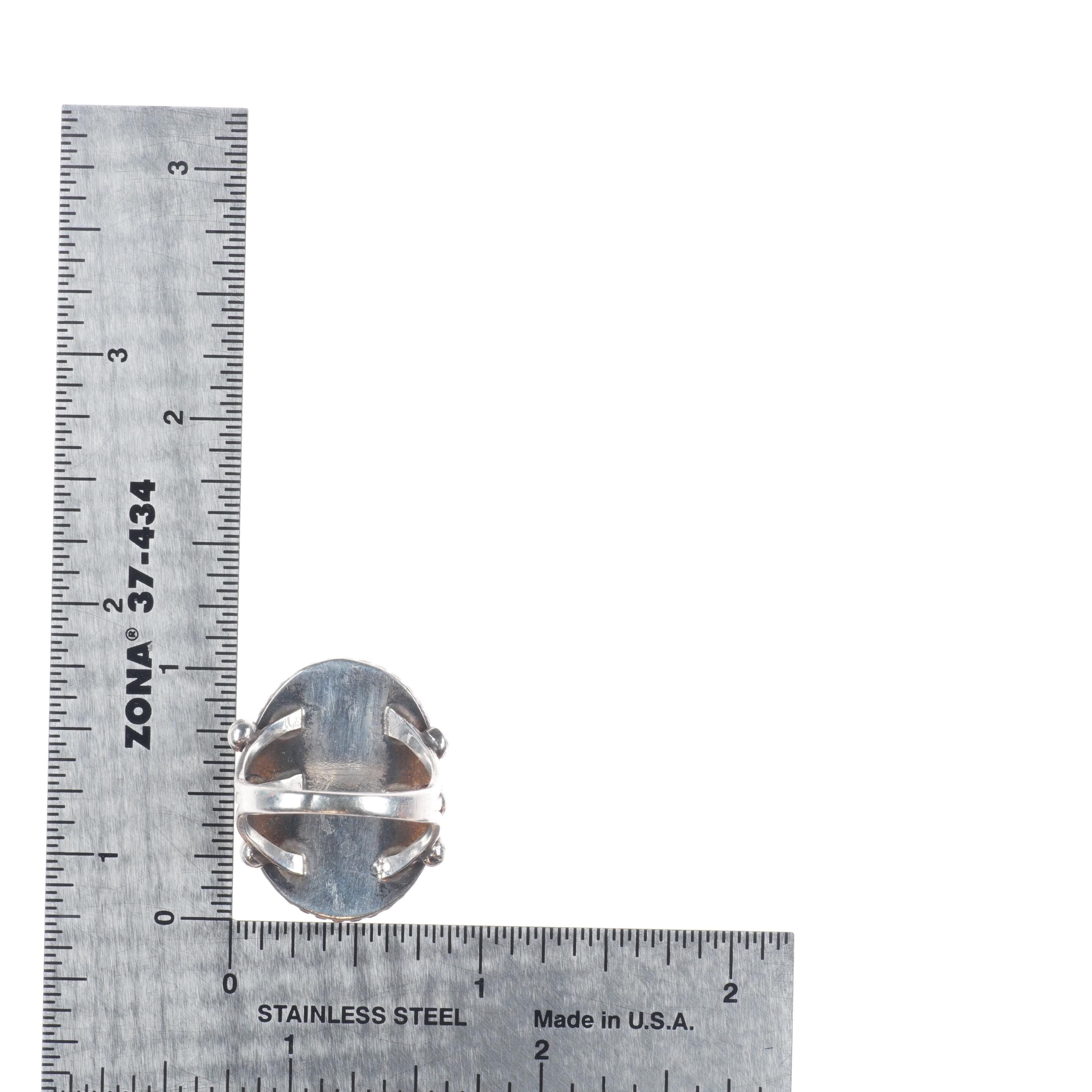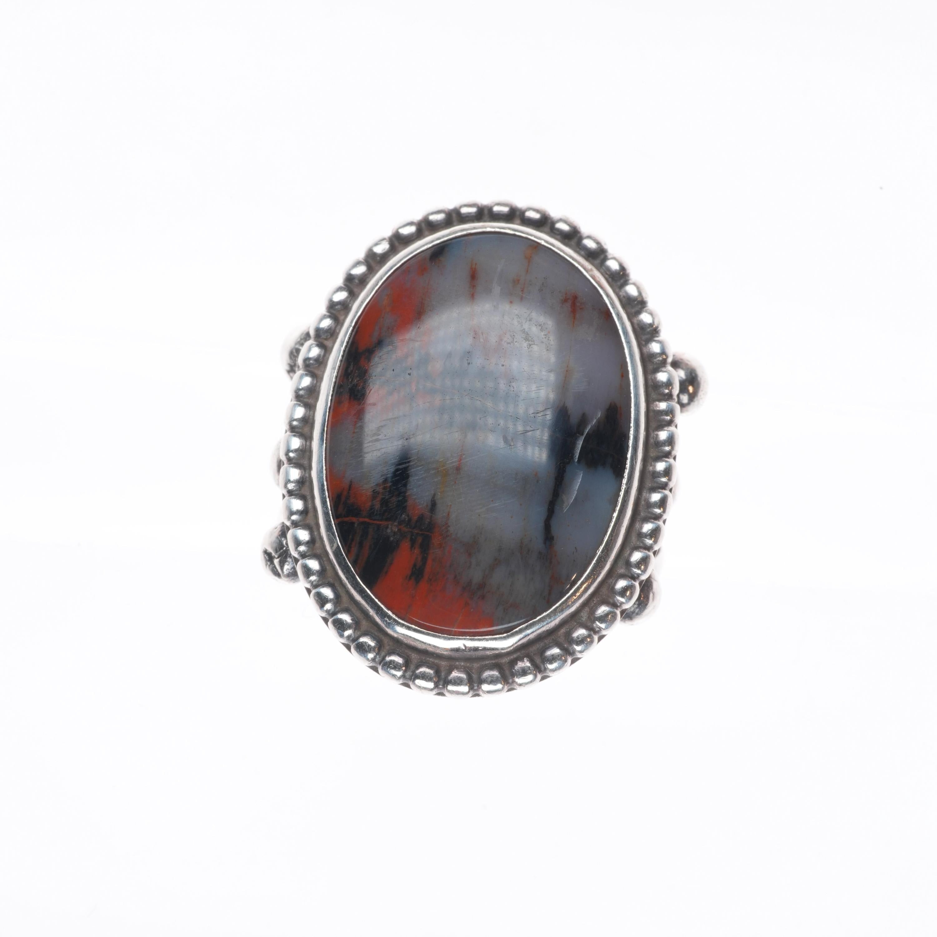sz7 30‘s-40‘s Navajo sterling silver petrified wood agate beaded bezel ring. Nice ring from the second quarter of the 20th century.