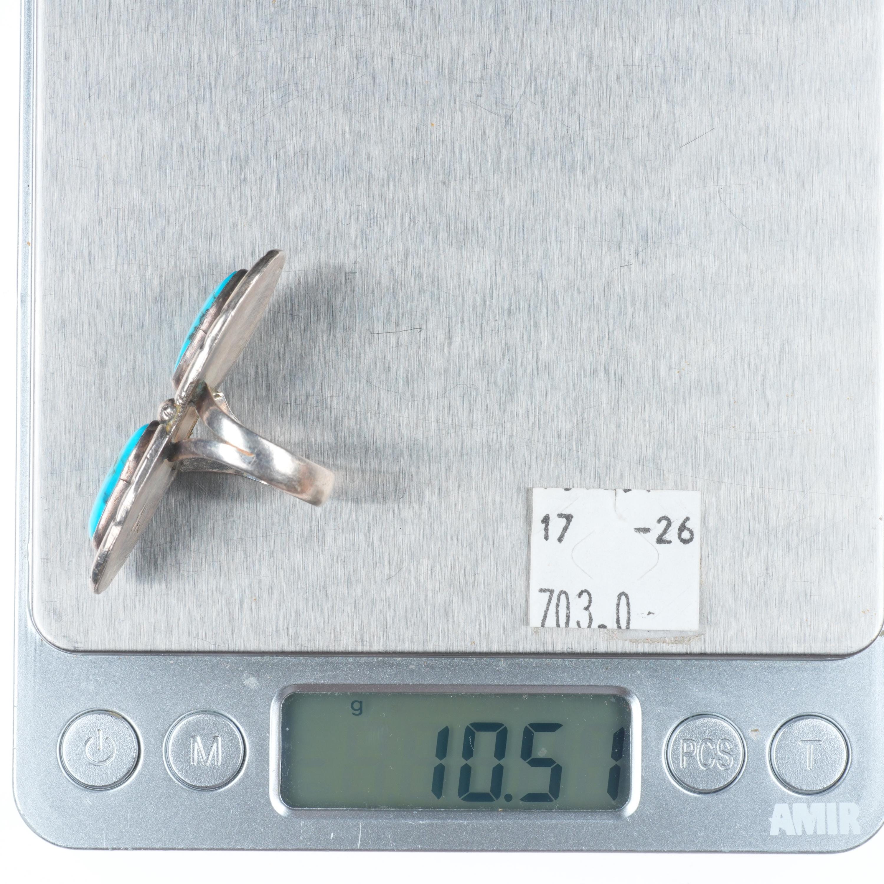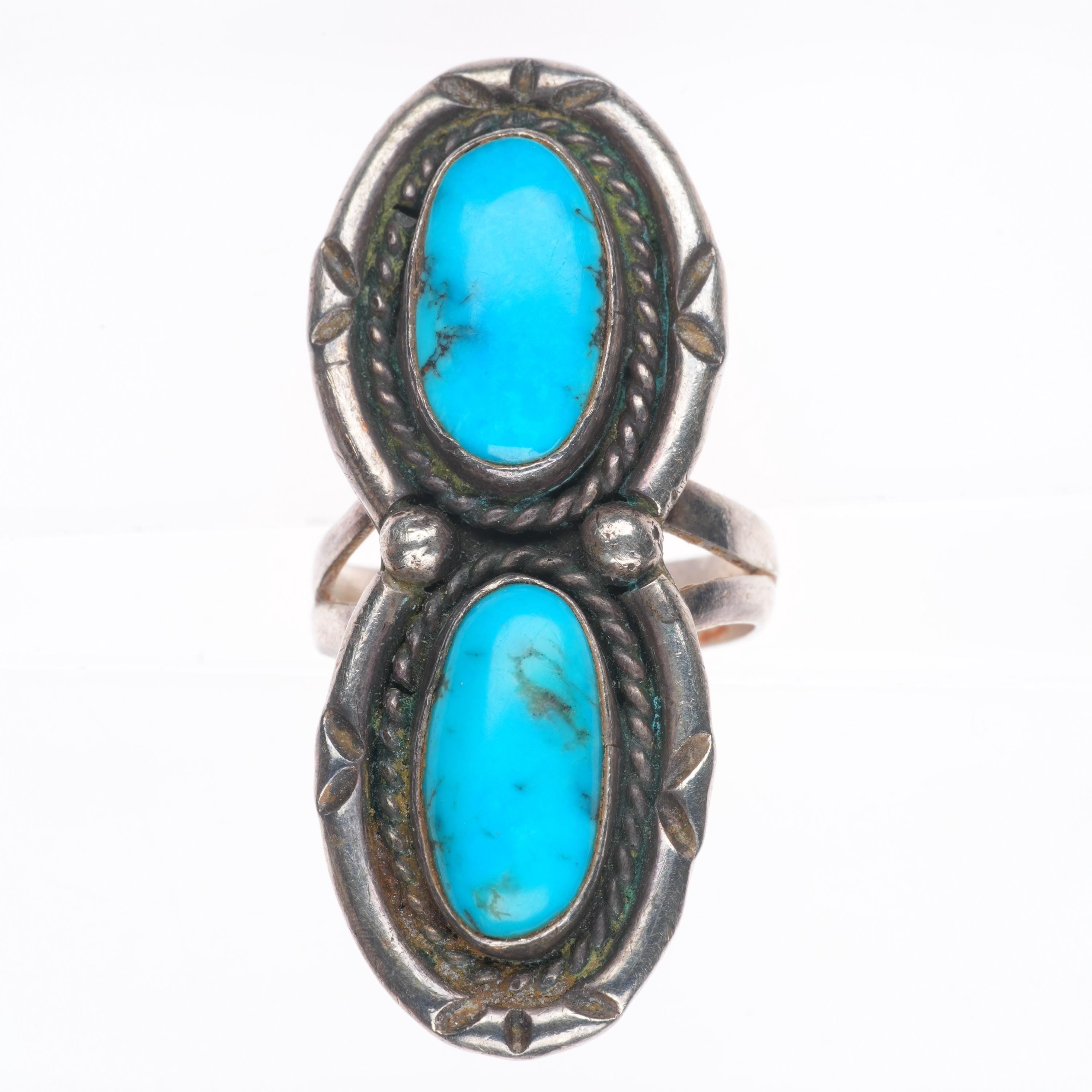 sz7 CM Vintage Navajo sterling silver 2 stone turquoise long ring. Tested and guaranteed solid sterling silver, circa third quarter of the 20th century. Some expected wear, weight and measurements in pictures.