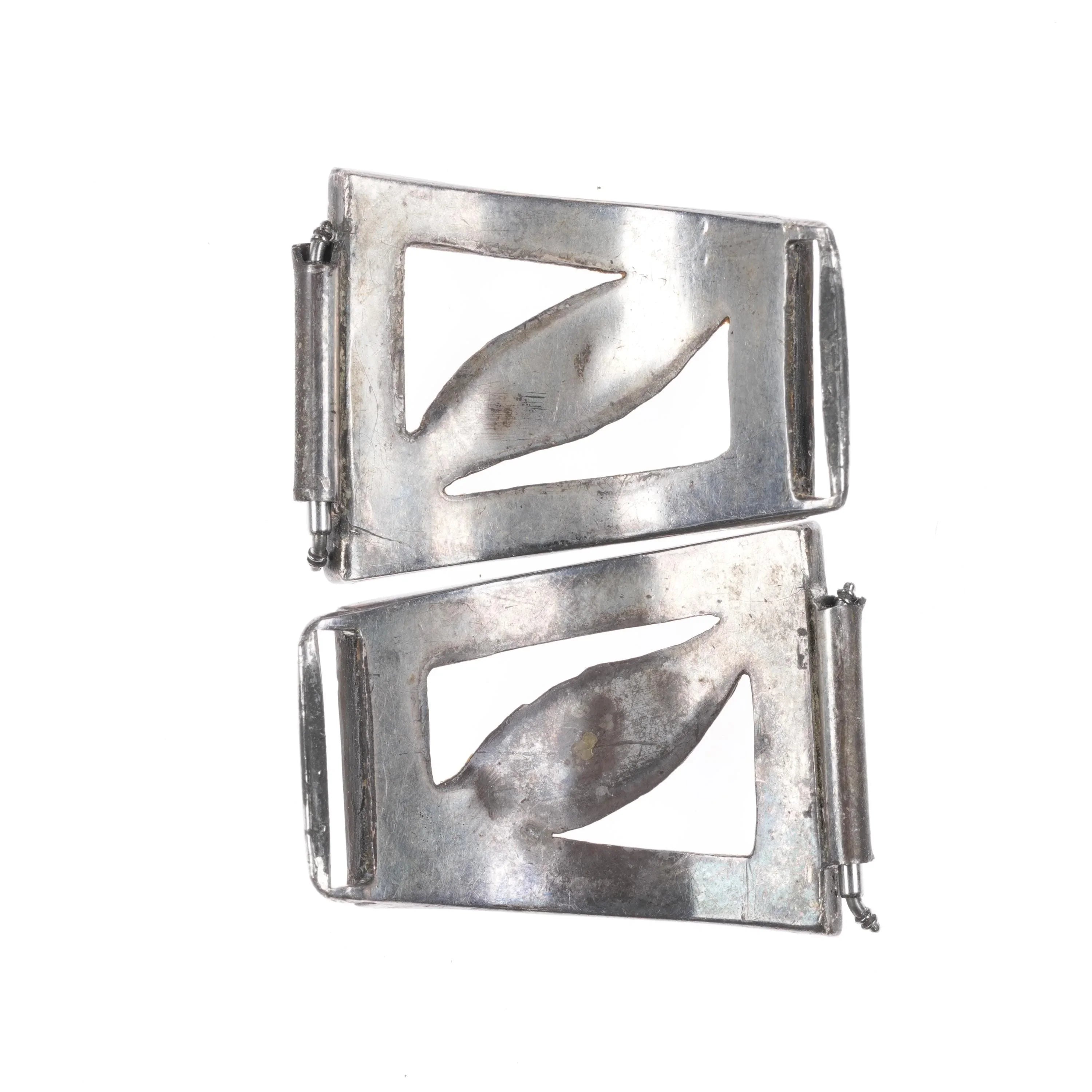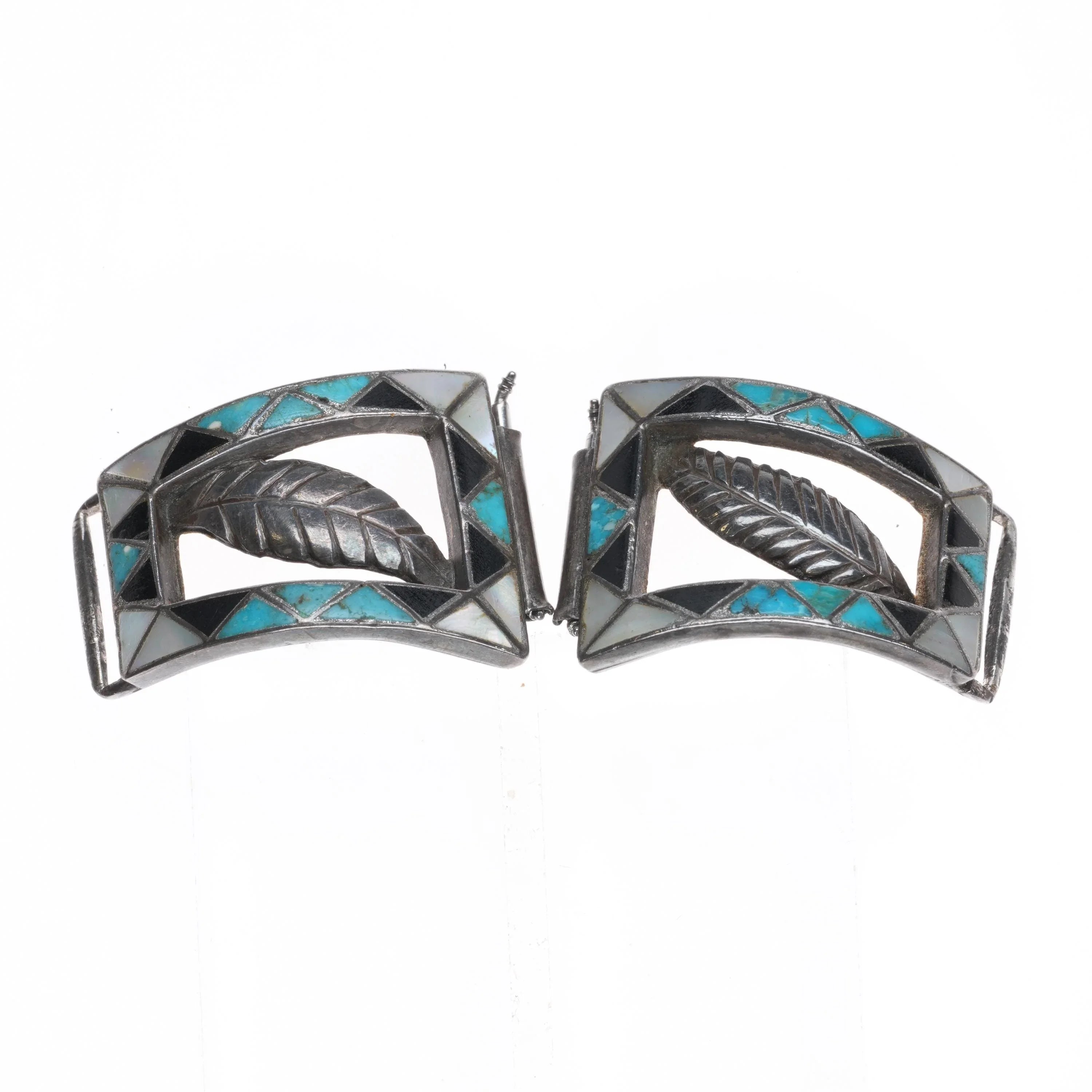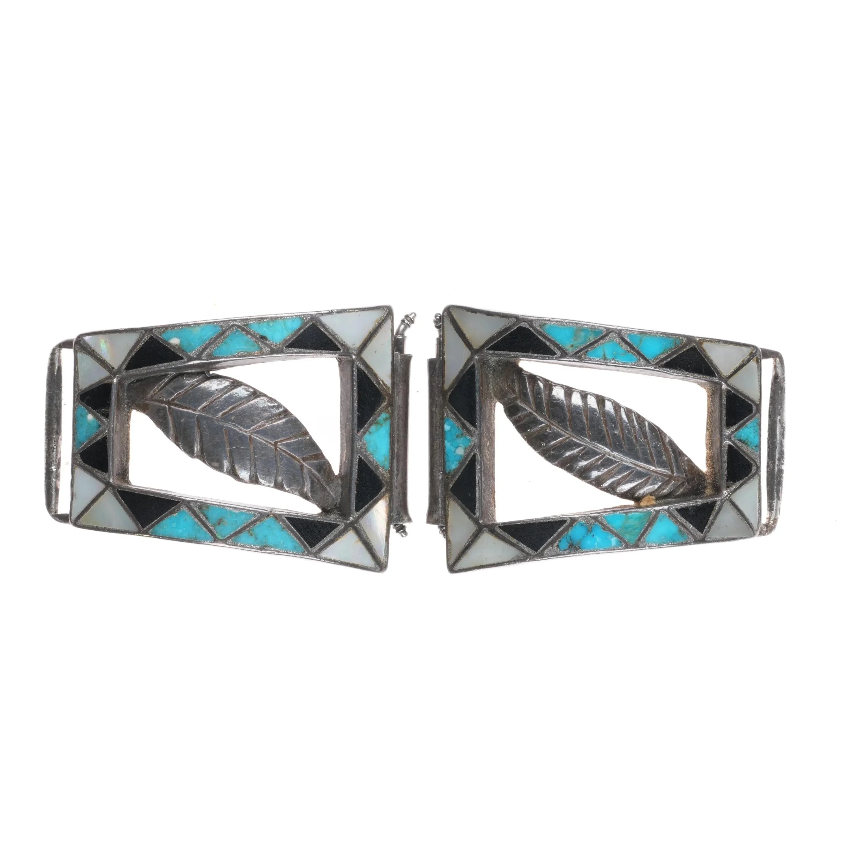Unusual c1950‘s Zuni channel inlay turquoise/shell/jet sterling silver watch tips. Selling the tips shown, tested and guaranteed solid sterling silver, circa mid 20th century. Measurements in pictures.