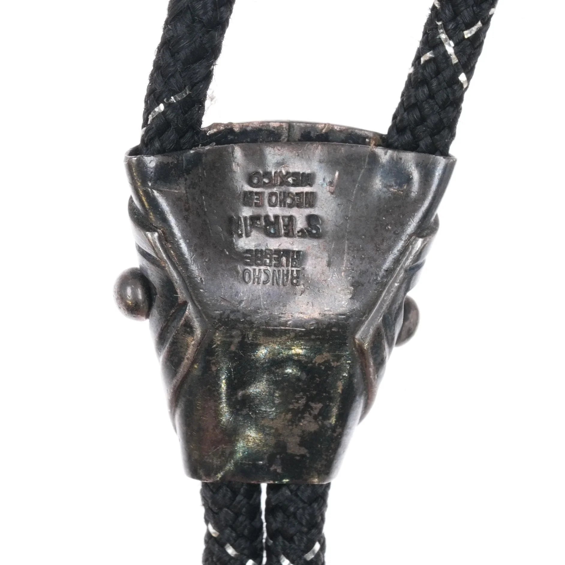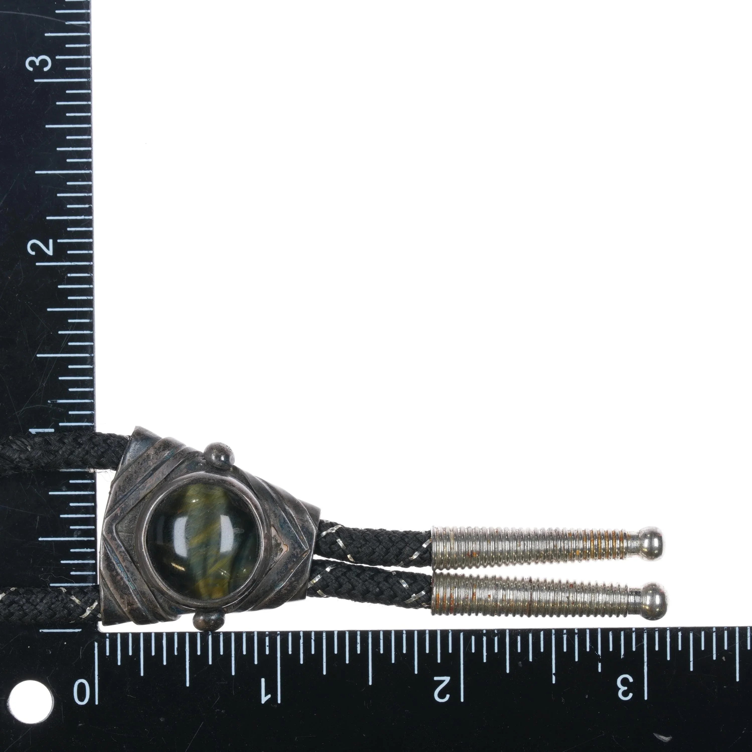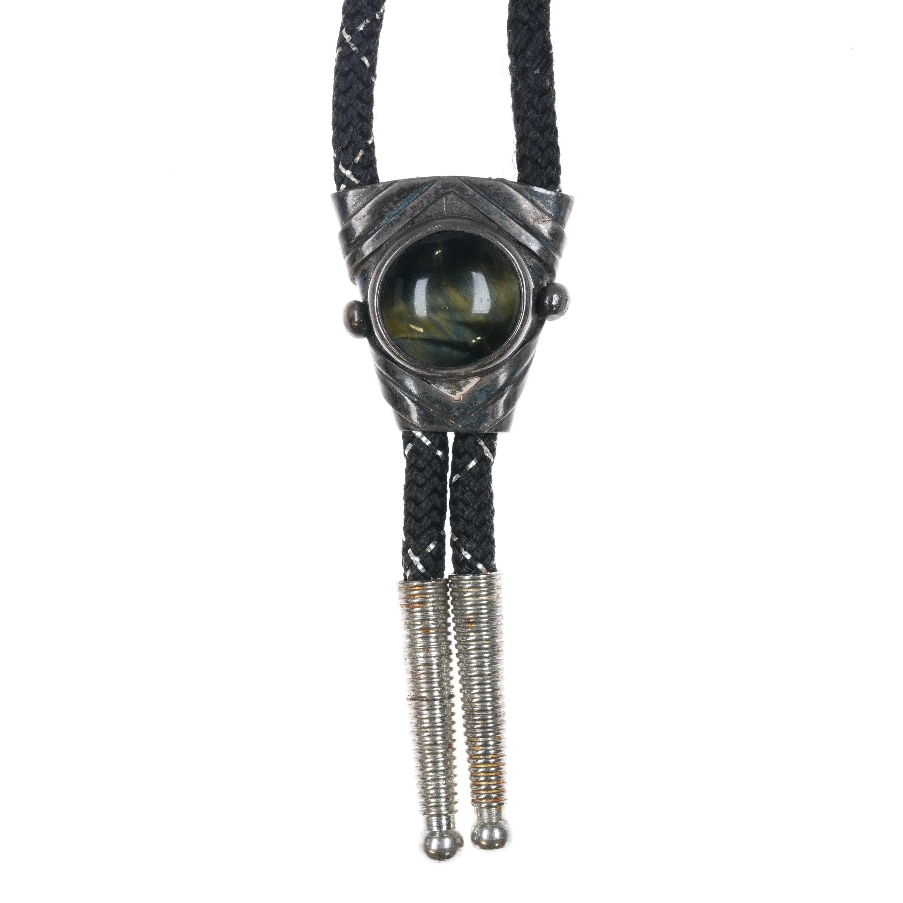 Vintage mid century modernist Rancho Alegre Sterling silver tiger‘s eye bolo tie. Solid sterling bolo slide with base metal tips no issues. Weight and measurements in pictures. 35" long. Overall good condition, tested sterling slide with markings shown in pictures.