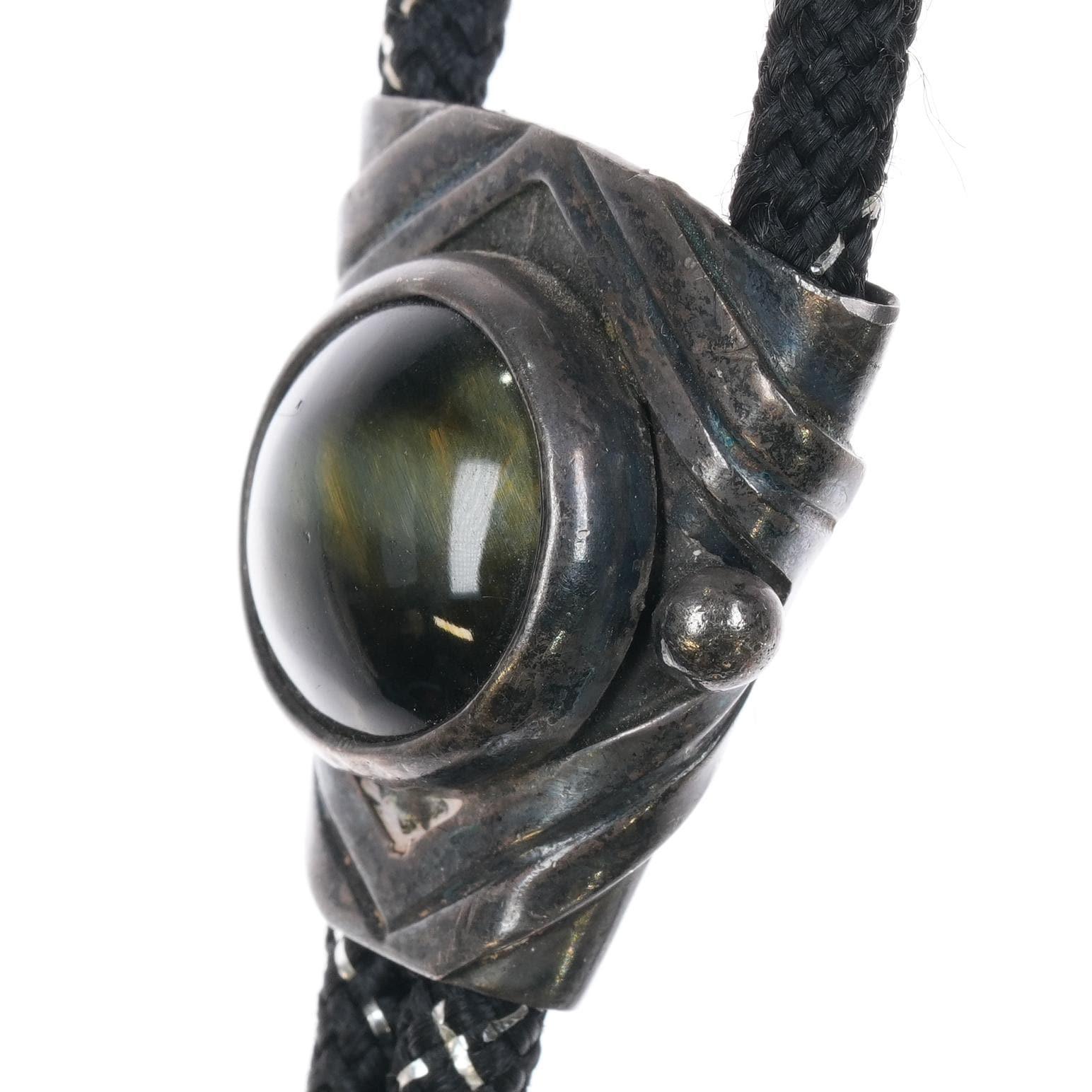 Vintage modernist Rancho Alegre Sterling silver green tiger's eye bolo tie