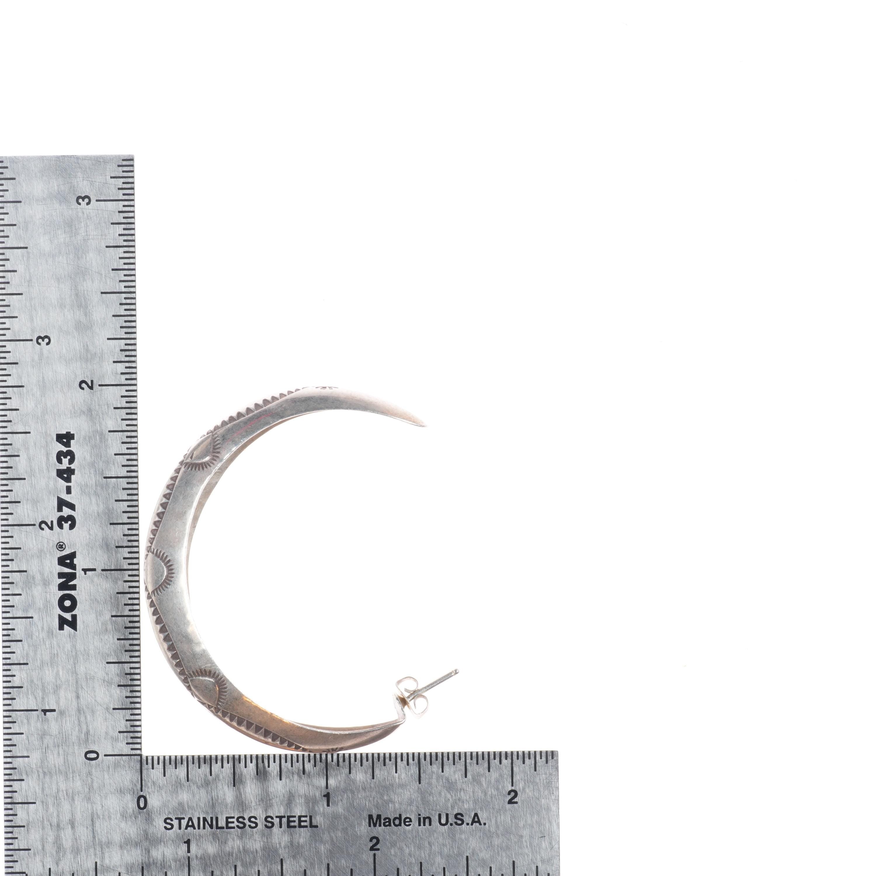 Vintage Navajo hand stamped sterling silver large hoop earrings. Great earrings with no issues, tested and guaranteed solid sterling silver, any marks detected, weight, and measurements will be shown in the pictures. Circa third quarter of the 20th century.