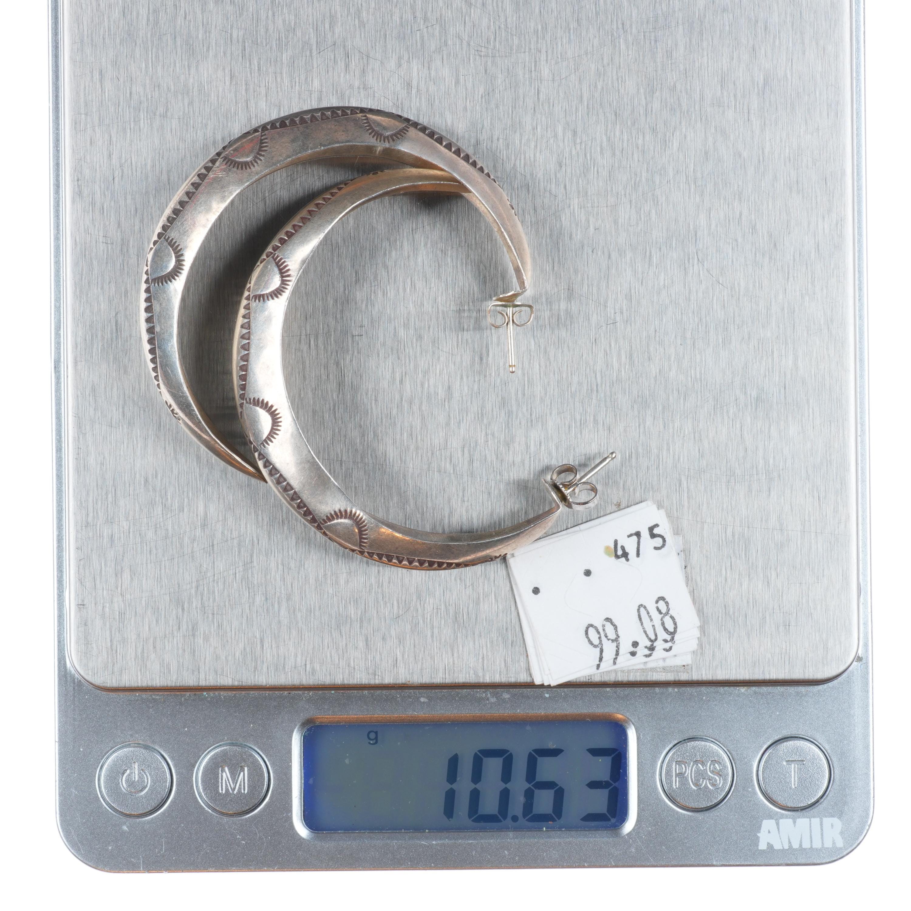 Vintage Navajo hand stamped sterling silver large hoop earrings