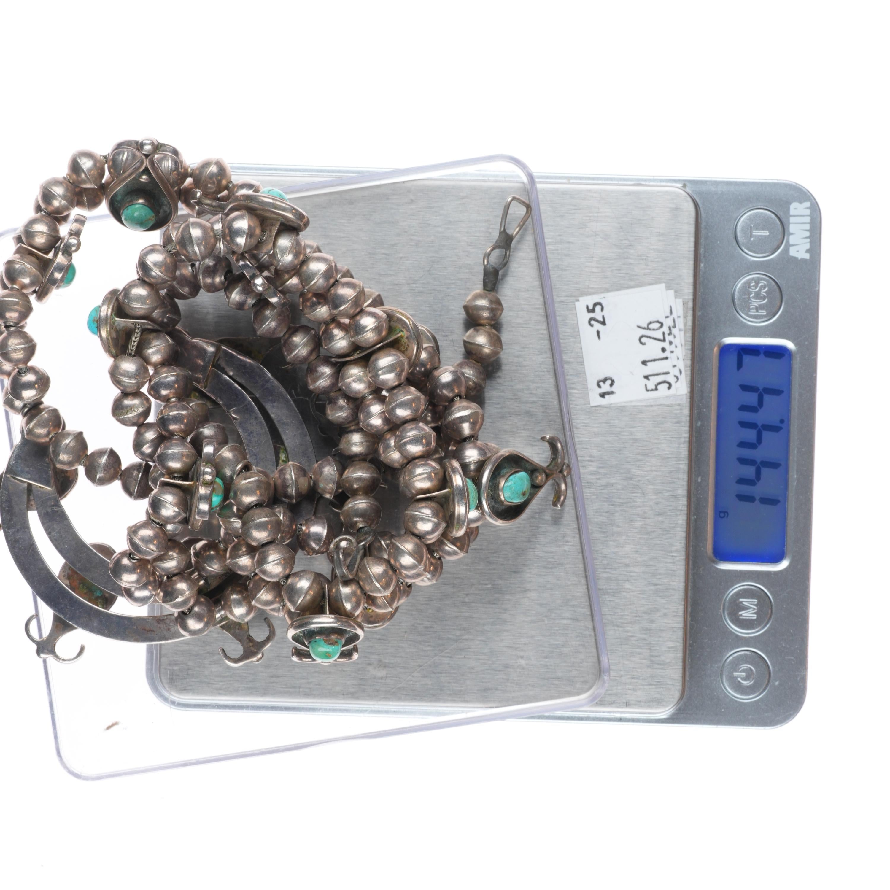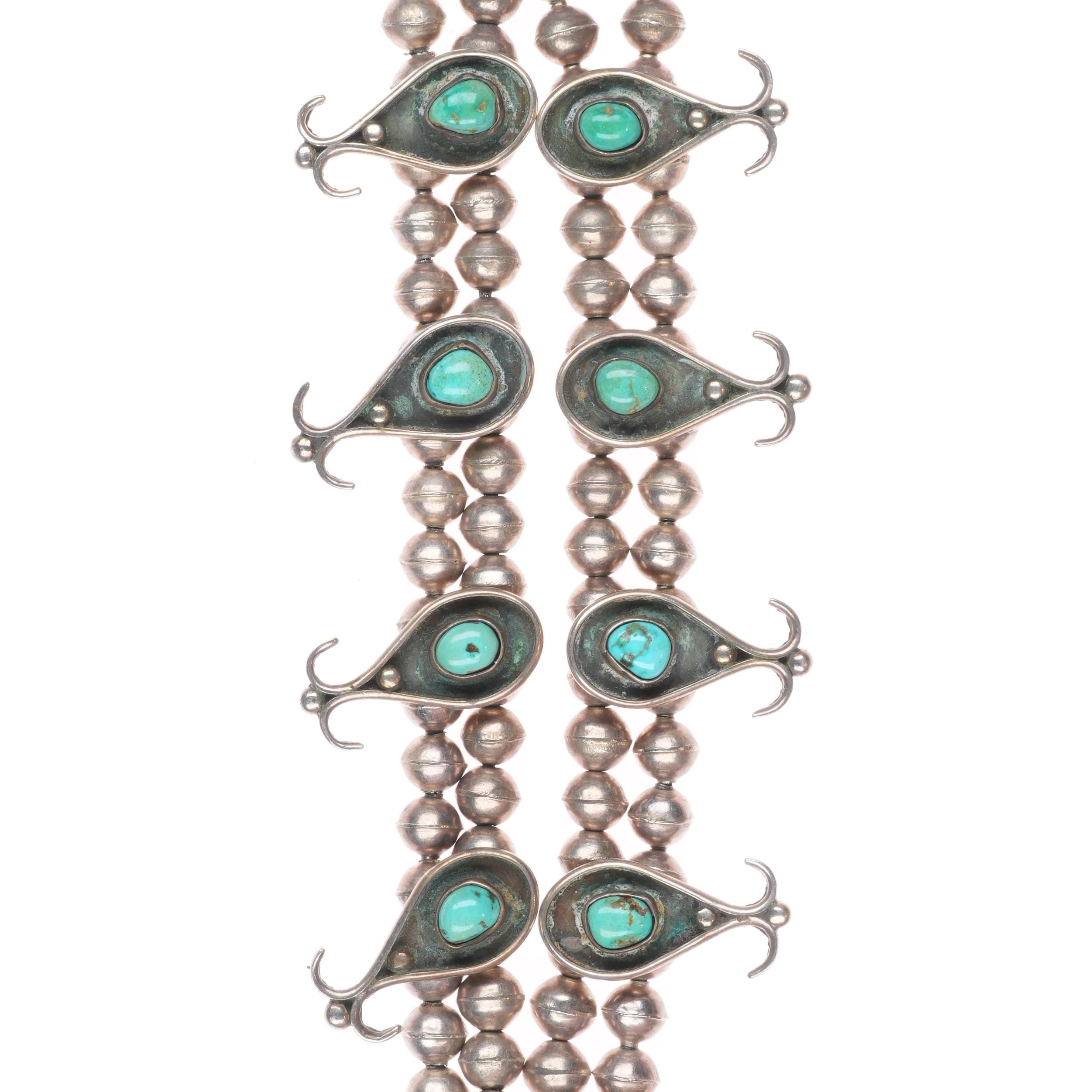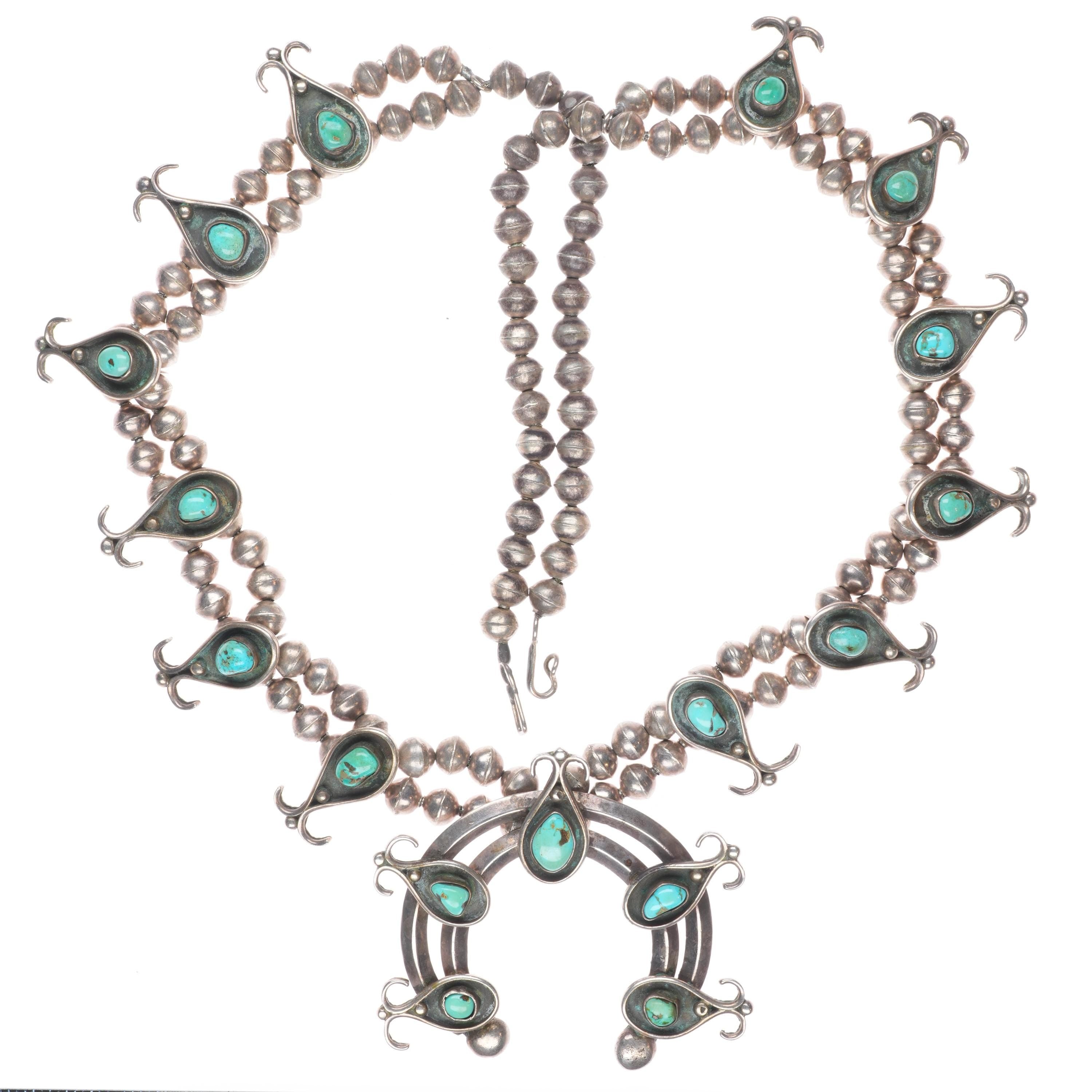 Vintage Navajo sterling silver handmade beads turquoise squash blossom necklace
