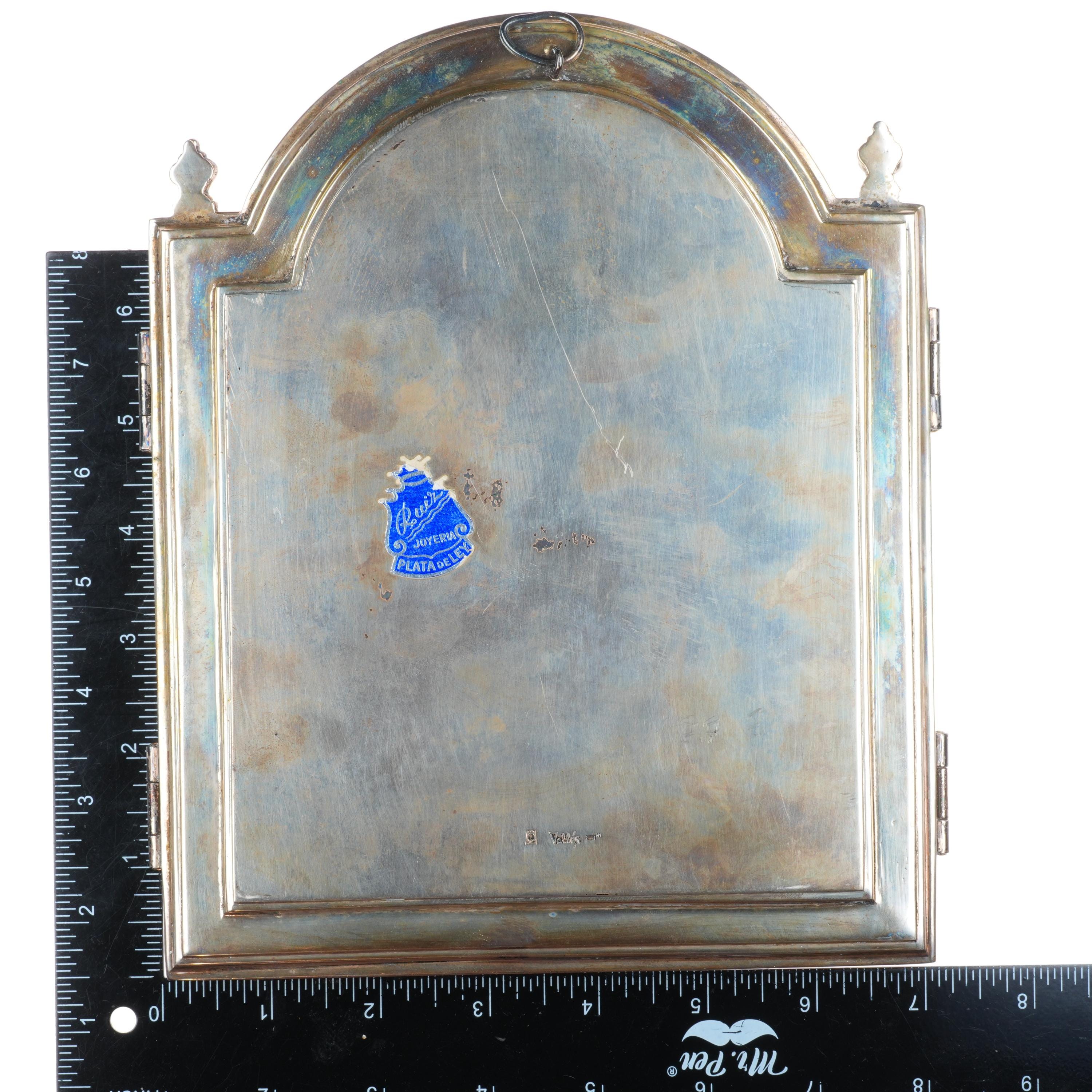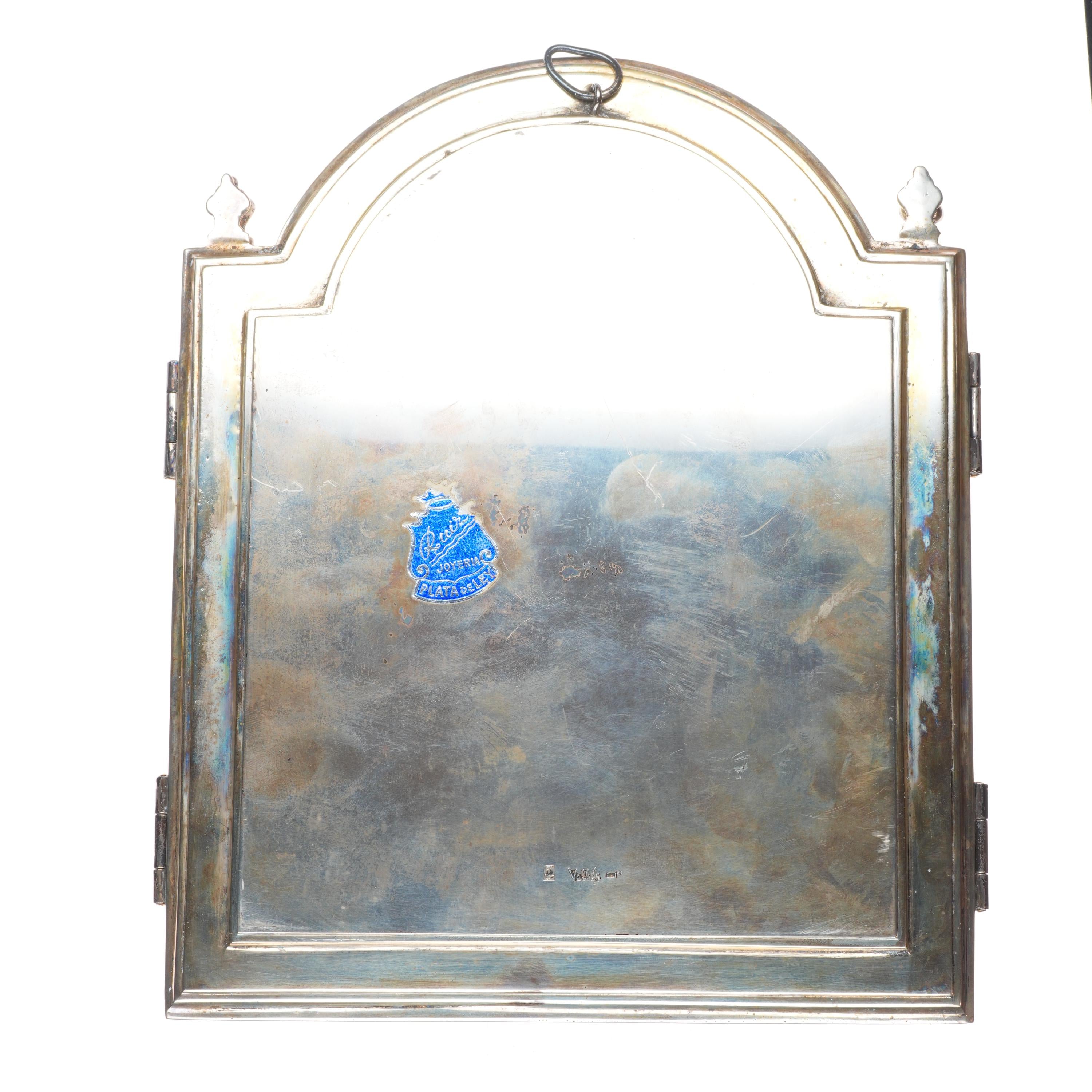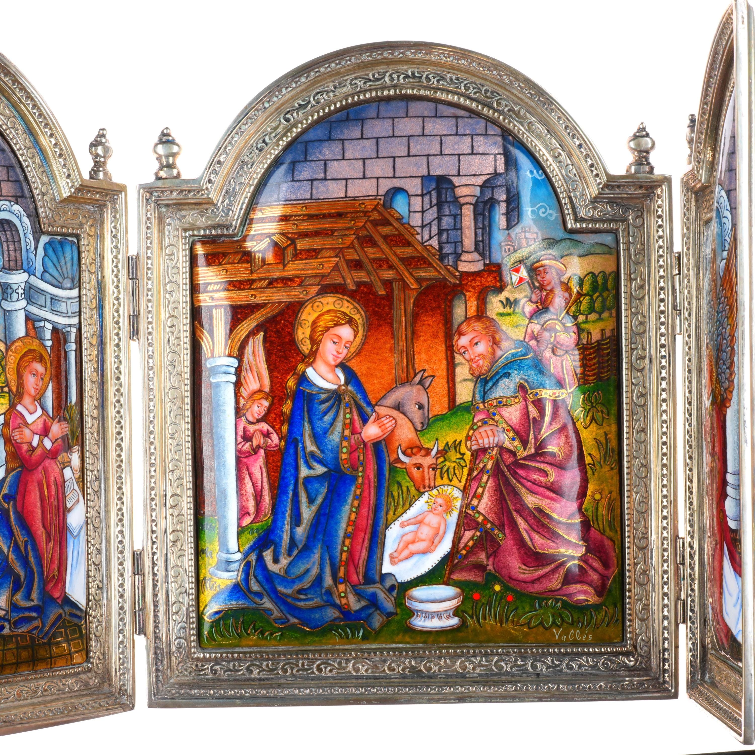Vintage Valles Sterling silver Enamel folding Nativity Jesus & Mary scene. Weight and measurements in pictures, no significant issues, a few slight stable stress lines in enamel only visible under very close examination. Very heavy marked, tested, and guaranteed solid sterling silver, circa last quarter of the 20th century. The entire frame is heavy solid sterling silver, I am not sure if the enamel plaque is silver or copper.