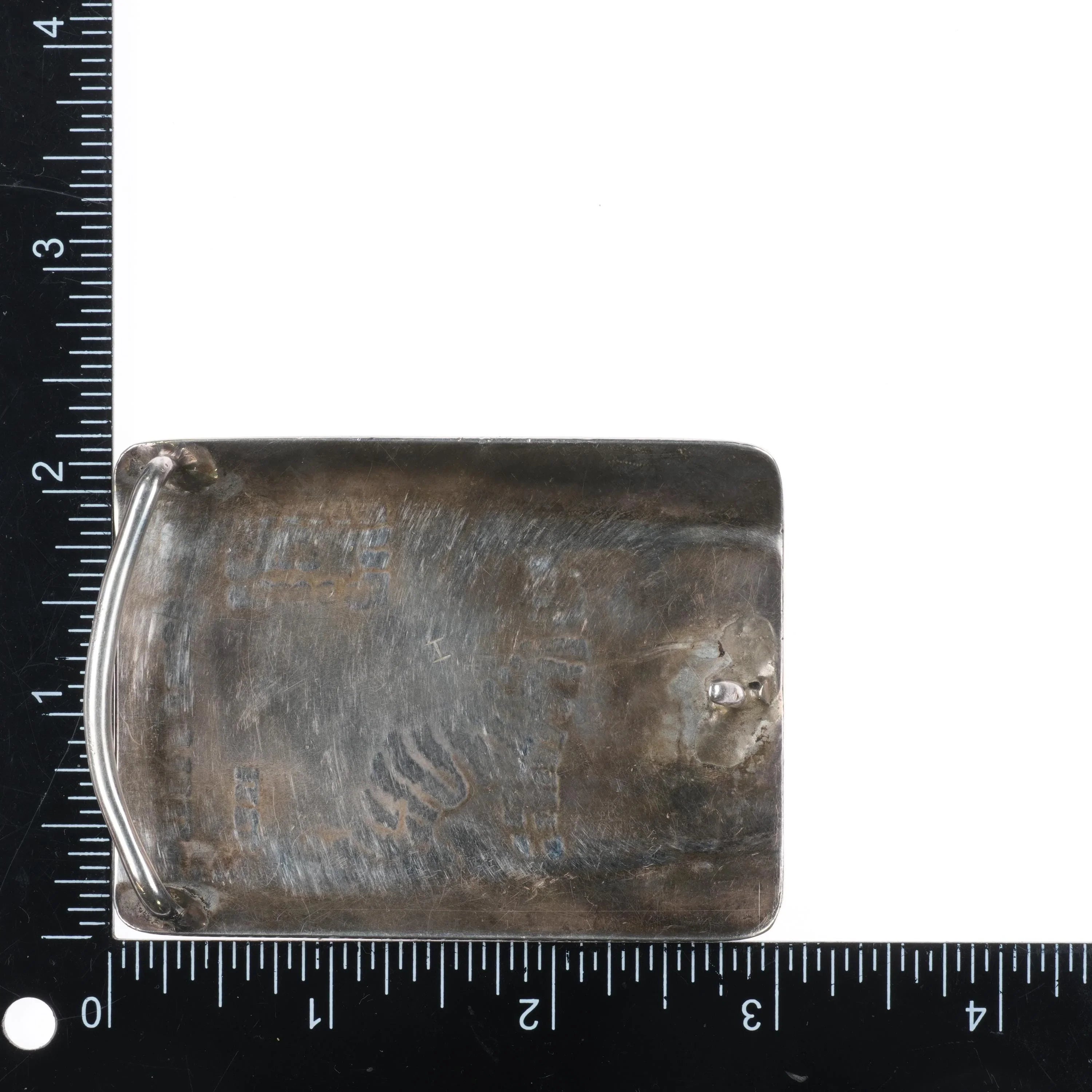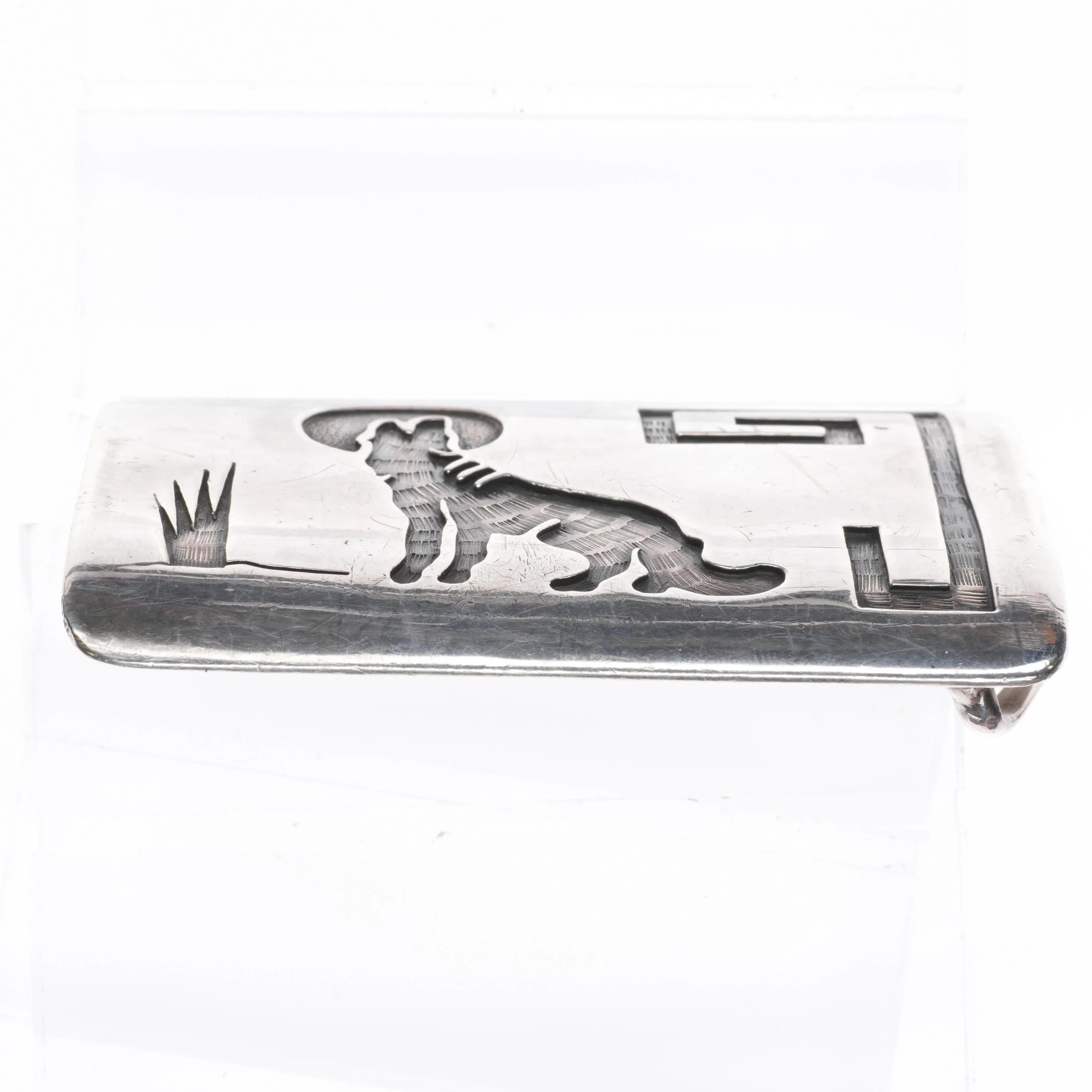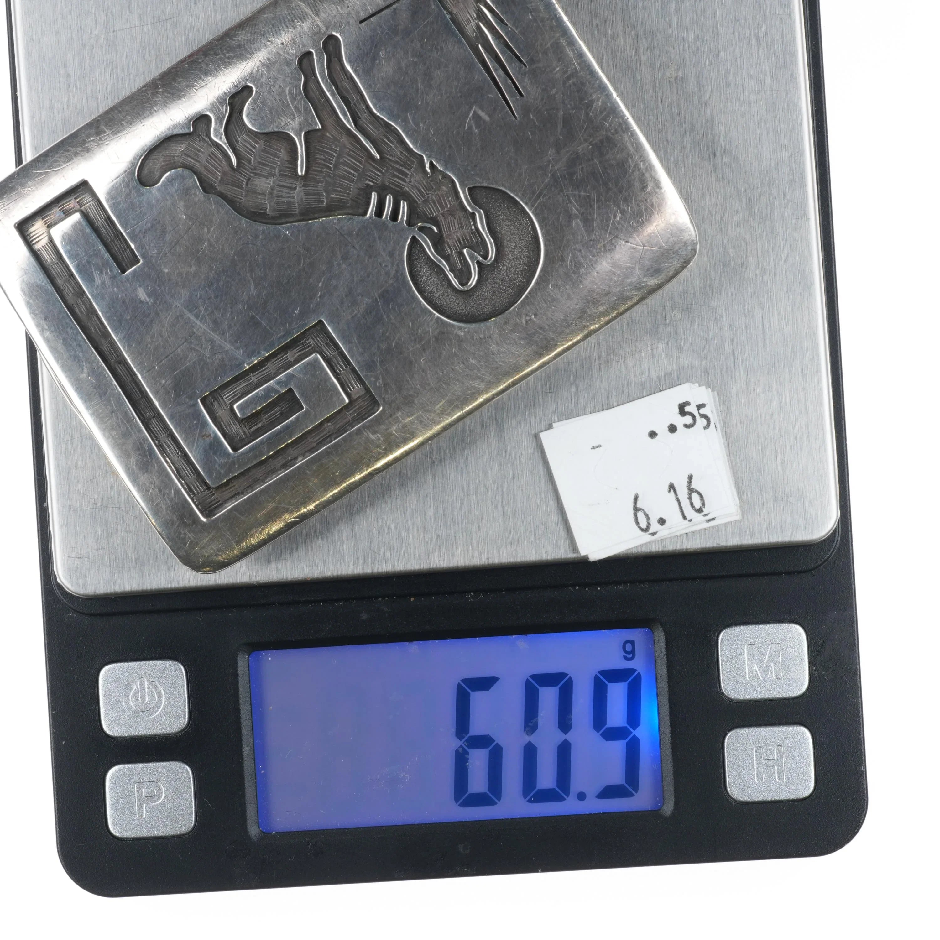Wolf Howling at the moon Hopi Overlay belt buckle sterling silver. Hallmarked clearly with a chiseled H or I. Tested and guaranteed solid sterling silver, fits a 1.75" wide belt. No issues, some expected wear. Circa fourth quarter of the 20th century. Weight and measurements in pictures.
