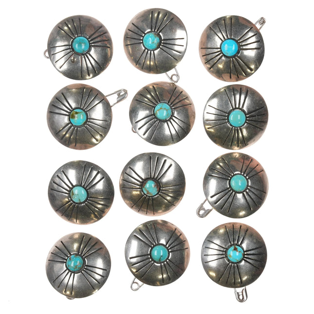 12 Vintage Navajo Southwestern sterling silver button cover set w/turquoise. Selling the 12 shown, all solid sterling silver with copper loops and safety pins attached from where these were pinned on something. . Weight and measurements in the pictures.