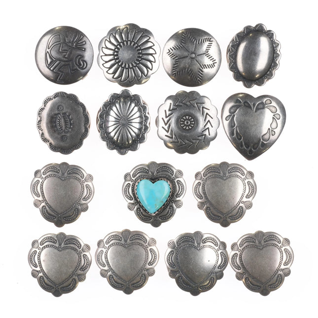 15 Vintage Southwestern sterling silver button covers Hearts/concho design. Selling the 15 shown, solid sterling silver fronts with base metal backs which is always the case with these. No issues. Weight and measurements in the pictures.