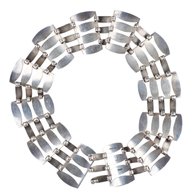 14" Antonio Pineda Mid Century Modernist 970 silver choker necklace, from the 3rd quarter of the 20th century with no issues. 14" inside measurement when closed, would be longer but doesn't stretch all the way long due to it's construction. 82.3 grams, 14mm wide.Antonio Pineda<br>(1919-2009)In the mountain town of Taxco in Mexico’s state of Guerrero,<br>large-scale mining can be dated to thesixteenth century, and silver is a way of<br>life. In the years following the Mexican Revolution (1910–20), jewelry and other<br>silver objects were crafted there with an entirely innovative approach,<br>informedby modernism and the creation of a new Mexican national identity. Today,<br>at the age of 89, AntonioPineda is one of two living members of the Taxco School<br>and is recognized as a world-class designerand a Mexican national treasure.<br>Nearly two hundred examples of Pineda’s acclaimed silver work willbe displayed<br>in Silver Seduction: The Art of Mexican Modernist Antonio Pineda, a<br>travelingexhibition debuting at the Fowler Museum Aug. 24, 2008.Significantly,<br>given Pineda’s many accomplishments and international renown, he identifies<br>himselfprimarily as a taxqueño, or Taxco, silversmith. From its inception, the<br>Taxco movement broke newground in technical achievement and design. While<br>American-born, Taxco-based designer WilliamSpratling has been credited with<br>spearheading the contemporary Taxco silver movement, it was agroup of talented<br>Mexican designers who went on to establish independent workshops and develop<br>thedistinctive “Taxco School.” These designers incorporated numerous aesthetic<br>orientations—Pre-Columbian art; silverwork, images, and other artwork from the<br>Mexican Colonial period; andlocal popular arts—merging them within the broad<br>spectrum of modernism.Pineda himself is lauded for his bold designs and<br>ingenious use of gemstones. Silver Seduction tracesthe evolution of his work<br>from the 1930s–70s, and includes more than fifty each of necklaces andbracelets,<br>as well as numerous beautiful rings, earrings and diverse examples of his<br>hollowware andtableware. All of the works feature Pineda’s hard-to-achieve<br>combination of highly refined and hand-wrought appeal.Pineda’s jewelry is<br>especially known for its elegant acknowledgment of the human form. It is<br>oftensaid that a Pineda fits the body perfectly, that it feels right when it is<br>worn. So, for example, a thickgeometric necklace that might at first glance seem<br>too weighty or rigid to wear comfortably is, in fact,faceted, hinged, or<br>hollowed in such a way that it gracefully encircles the neck or drapes<br>seductivelydown the décolletage.In addition, no other taxqueño jeweler used as<br>many costly semiprecious stones or set them with asmuch ingenuity, skill, and<br>variety as did Pineda. Only the most talented of silversmiths could master