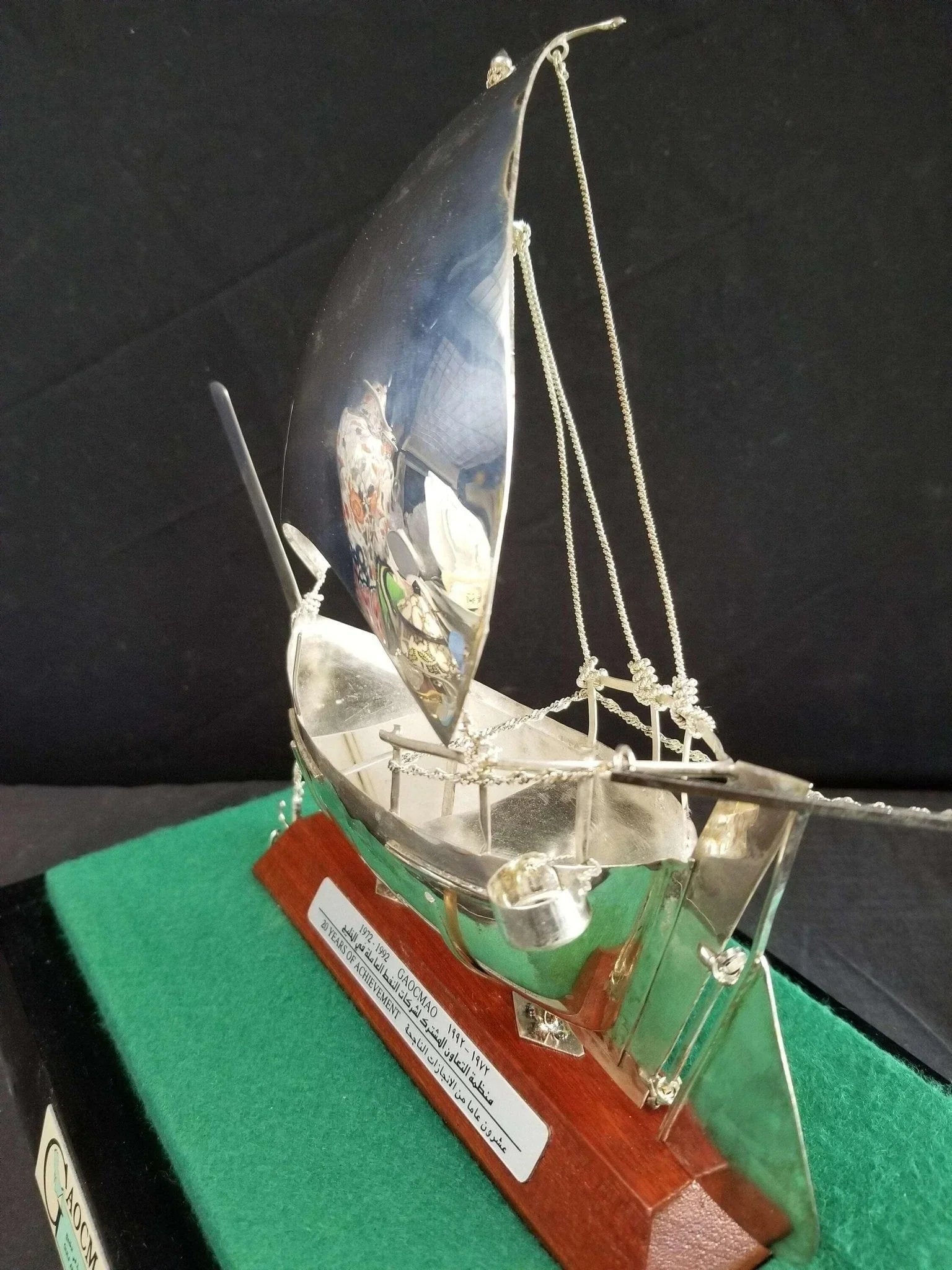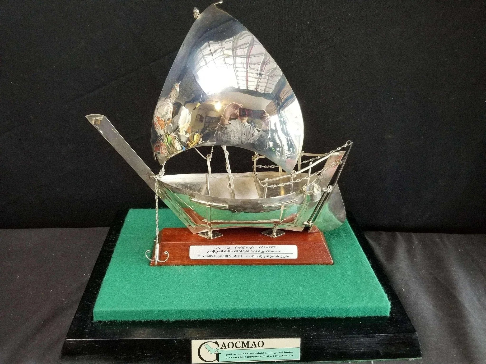 GAOCMAO 湾岸地域石油会社相互扶助組織の 20 周年を記念するスターリングシルバーの船 240 グラム。船自体の重さは 235 グラムで、それを保持するブラケットは少なくとも 5 グラム必要です。ケースなしの場合、船のサイズは長さ9.5インチ x 高さ9.5インチです。ケース保護ケースのサイズは、高さ 13.25 インチ x 幅 12 インチ x 奥行き 8 インチです。これは、この非常に重要な機会の 20 周年を記念して製造され、退職後に家に持ち帰られた、他にはないアイテムであると 99% 確信しています。退職時にこの組織の最高幹部に贈られました。素晴らしいクロスコレクションであり芸術作品です。テスト済みで保証された純銀です。925 マーキングを 1 つ見つけましたが、損傷や問題はありません。