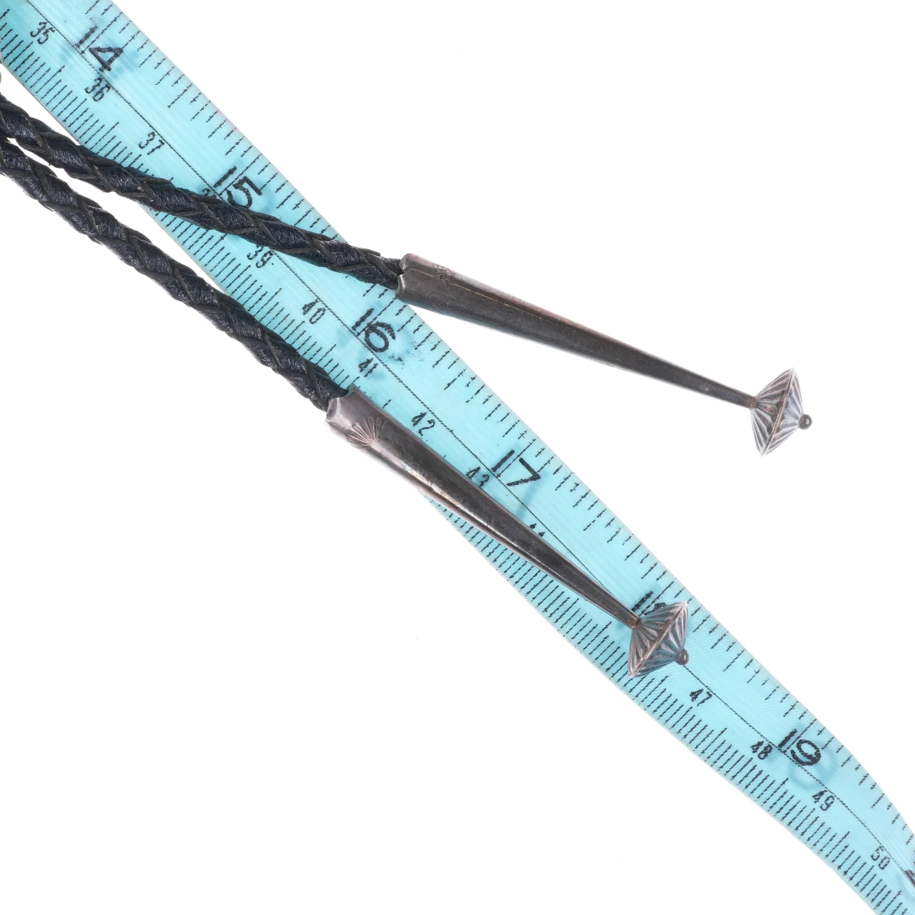 1991 Chambers Sterling Silver southwestern scrollwork bolo tie. Tested and guaranteed solid sterling silver slide and tips. Weight and measurements in pictures. Great bolo, 36" long with no issues. Tray is tared out, so weight shown is just the bolo of course. Unknown maker, apparently unmarked.