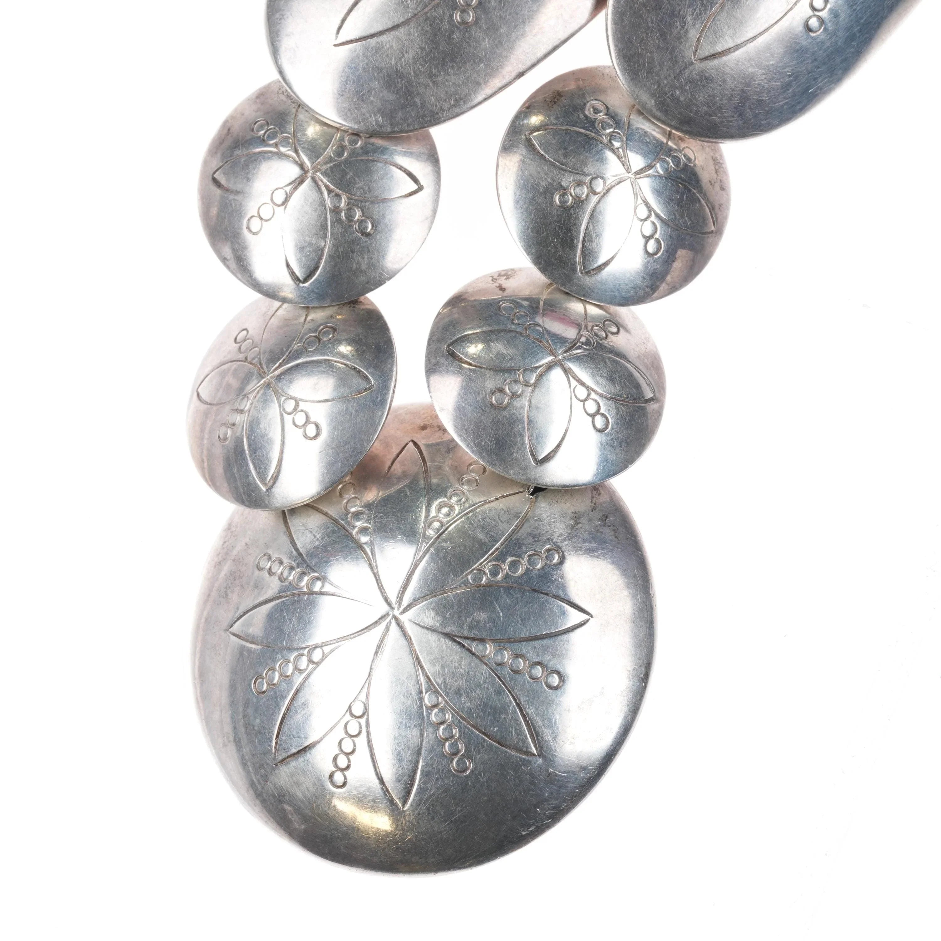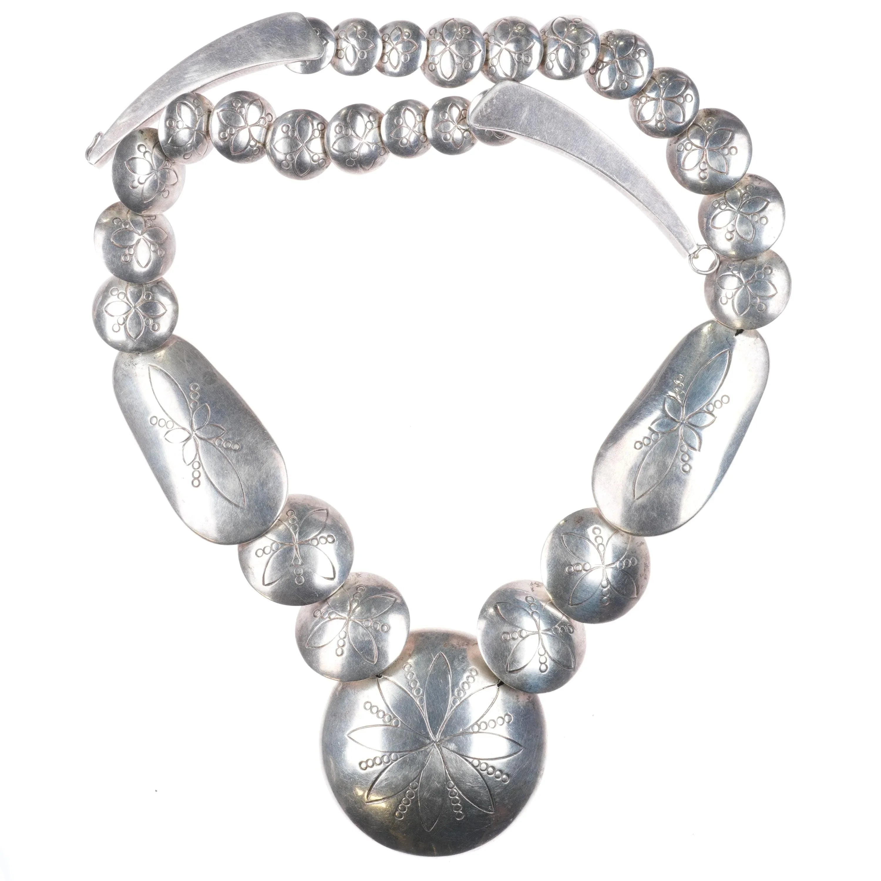 20" Mark Jimenez Apache reversible Onyx pillow bead necklace sterling silver No damage or issues, weight and measurements in the pictures. Buying the Necklace shown with no damage, circa last quarter of the 20th century. Tested and guaranteed solid sterling silver. Marked on one of the top tubes, shown in pictures.